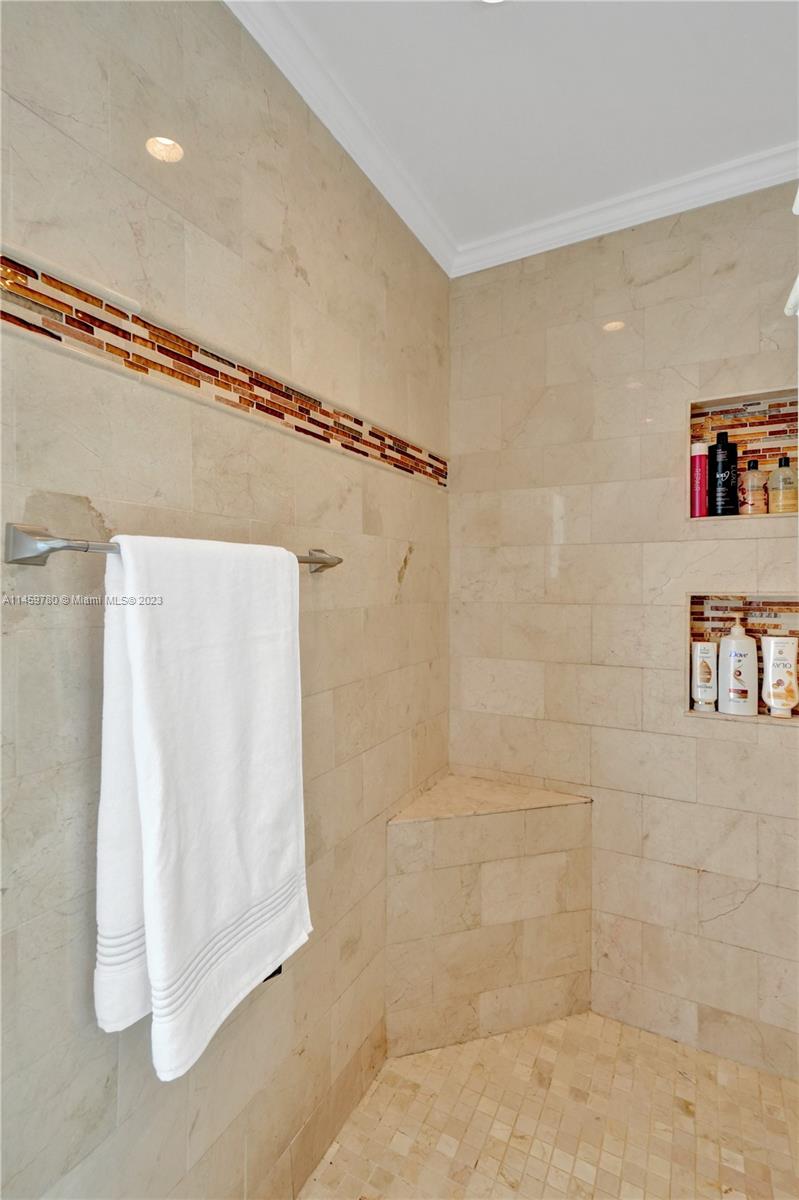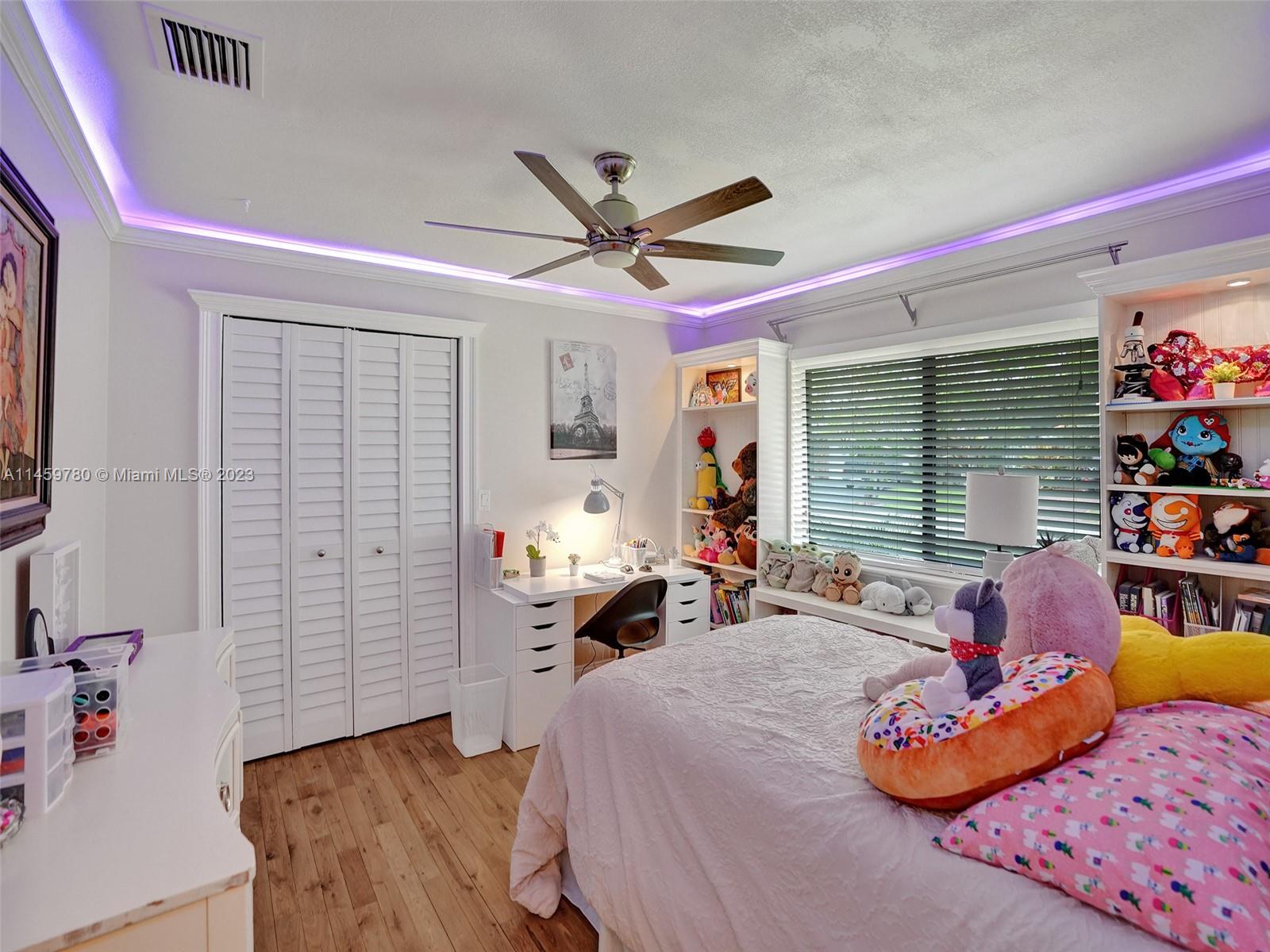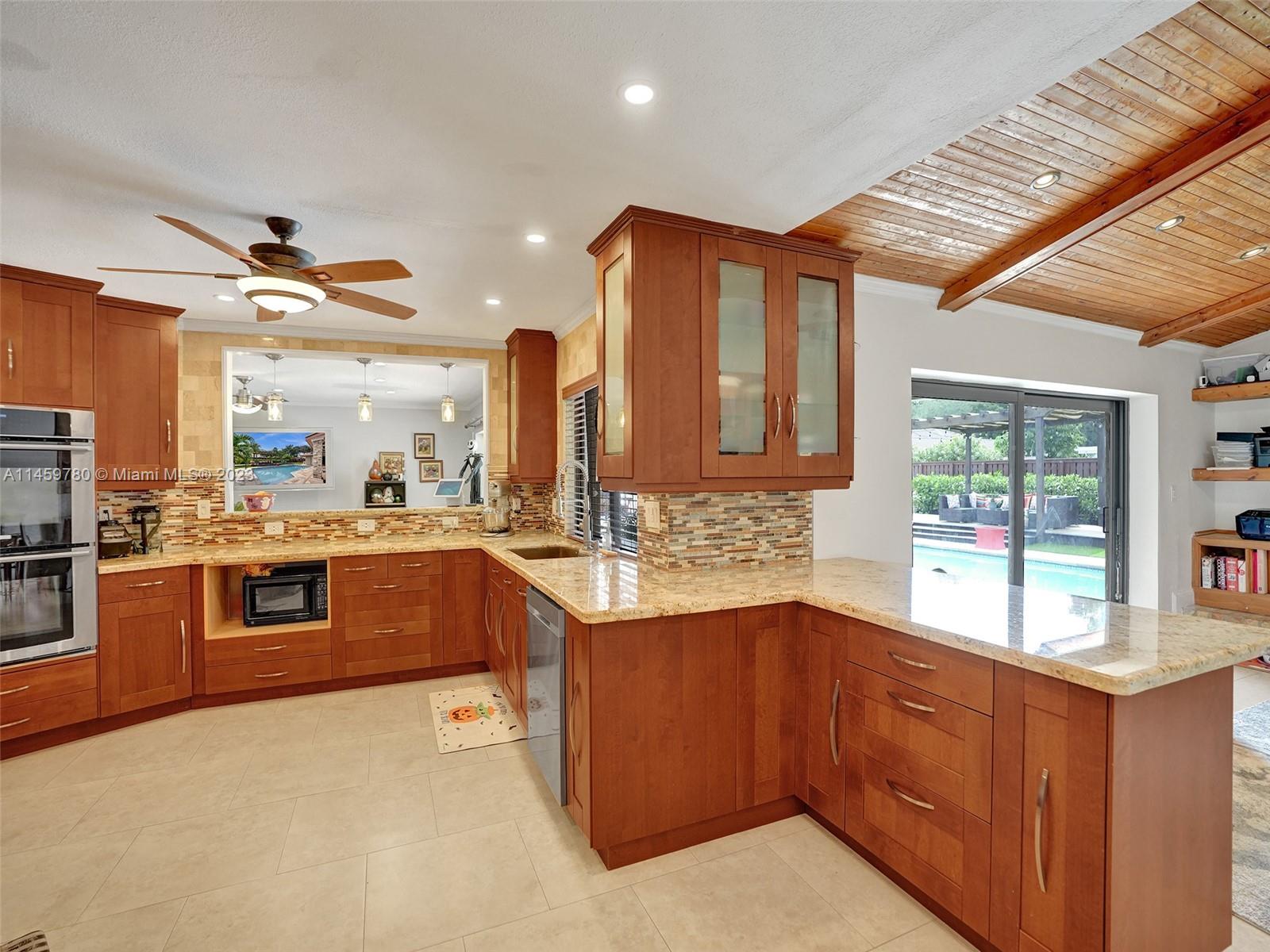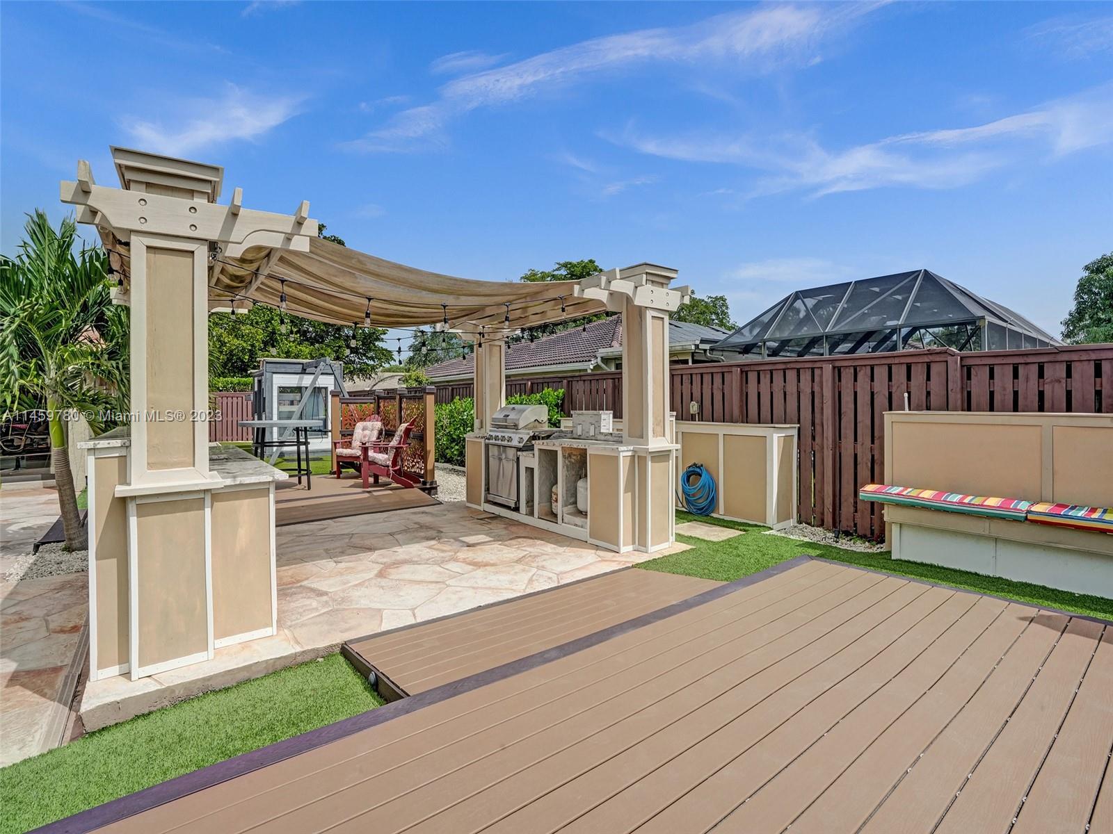 Welcome to your dream home! This spacious updated 4/3 property is nestled on a generous corner lot, boasting a captivating circular driveway and a two-car garage with an extra side driveway. The exterior is an oasis featuring a large terrace, a sparkling pool surrounded by lush synthetic grass, an outdoor kitchen, and a convenient outdoor shower. Step inside to discover a 3-way split floor plan that offers both privacy and functionality. The expansive kitchen is a chef's delight, complete with dual wall ovens, abundant counter and pantry space, and dining area. Enjoy the cozy fireplace in the family room, perfect for creating a warm ambiance. This home also features a separate family room & living room, providing ample space for relaxation and entertainment. A-rated schools and NO HOA.