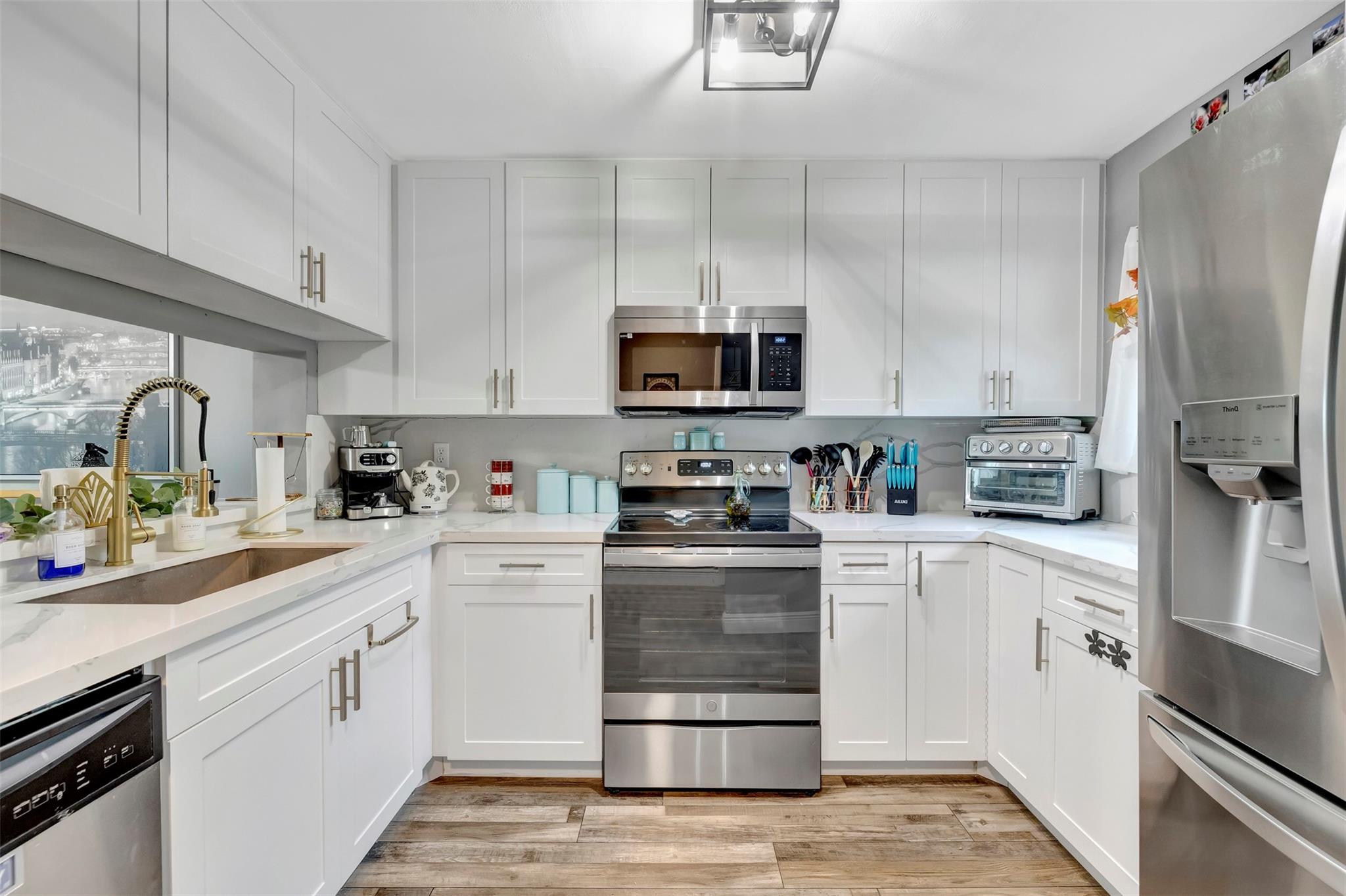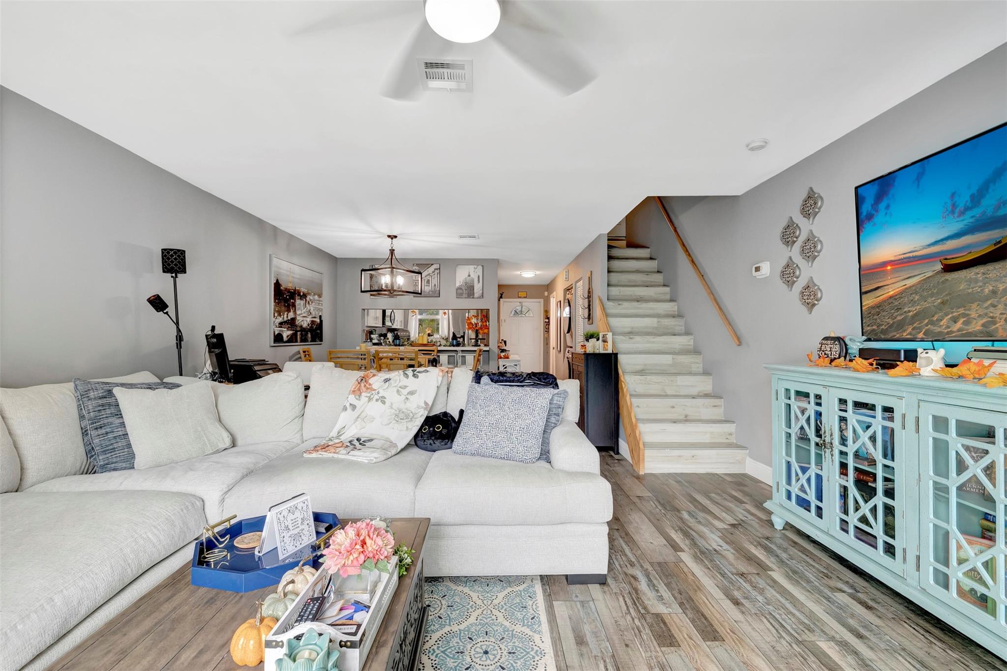 This 2/2.5 townhouse (not condo) with low HOA $150/mo, has been updated with the loveliest of finishes - brand new gorgeous white kitchen with shaker cabinets, white quartz counter tops, snack bar, brand new appliances, lighting and fans, full size large washer and dryer, all new 1/2 bath 1st floor, all new vinyl wood-look flooring 1st floor, new flooring 2nd floor and stairs and fresh paint! Primary bath is all new! There are Impact windows and sliding door. There is a new backyard deck to relax with water, and golf course views! See it to Believe It! This property has large rooms, lots of storage. The water and golf course can also be seen from primary bedroom. Located close to shopping, restaurants, and hwys. This will not last! It is really special and ready to be yours!