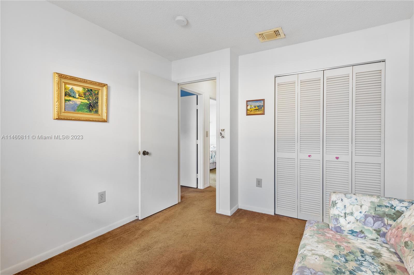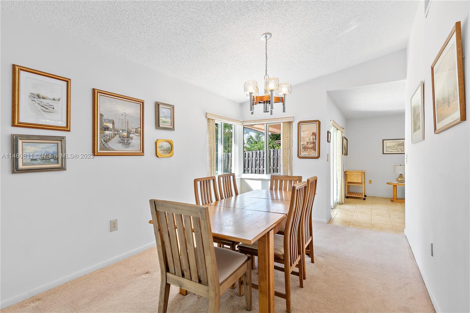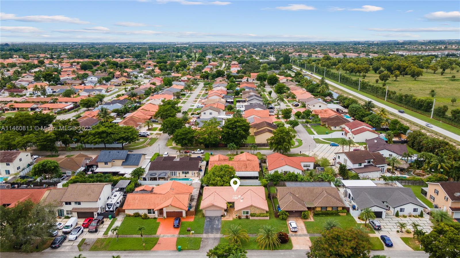 Spacious home on a dead-end street features 4 bedrooms (split floor-plan), 2 bathrooms, 2-car garage, updated front double-door entry, foyer, formal living and dining room, spacious kitchen with pantry and open to the family room, skylight, separate laundry room, carpet and tile throughout, complete hurricane protection with a combination of impact glass and accordion shutters. The spacious primary bedroom features a double-door entry, platform area, and an en suite with dual vanities, separate shower and tub, and a walk-in closet. Exterior features include a spacious patio partially covered, mango tree, and fully fenced back-yard. HVAC is 2004 and Roof Permit with city is dated 1994.