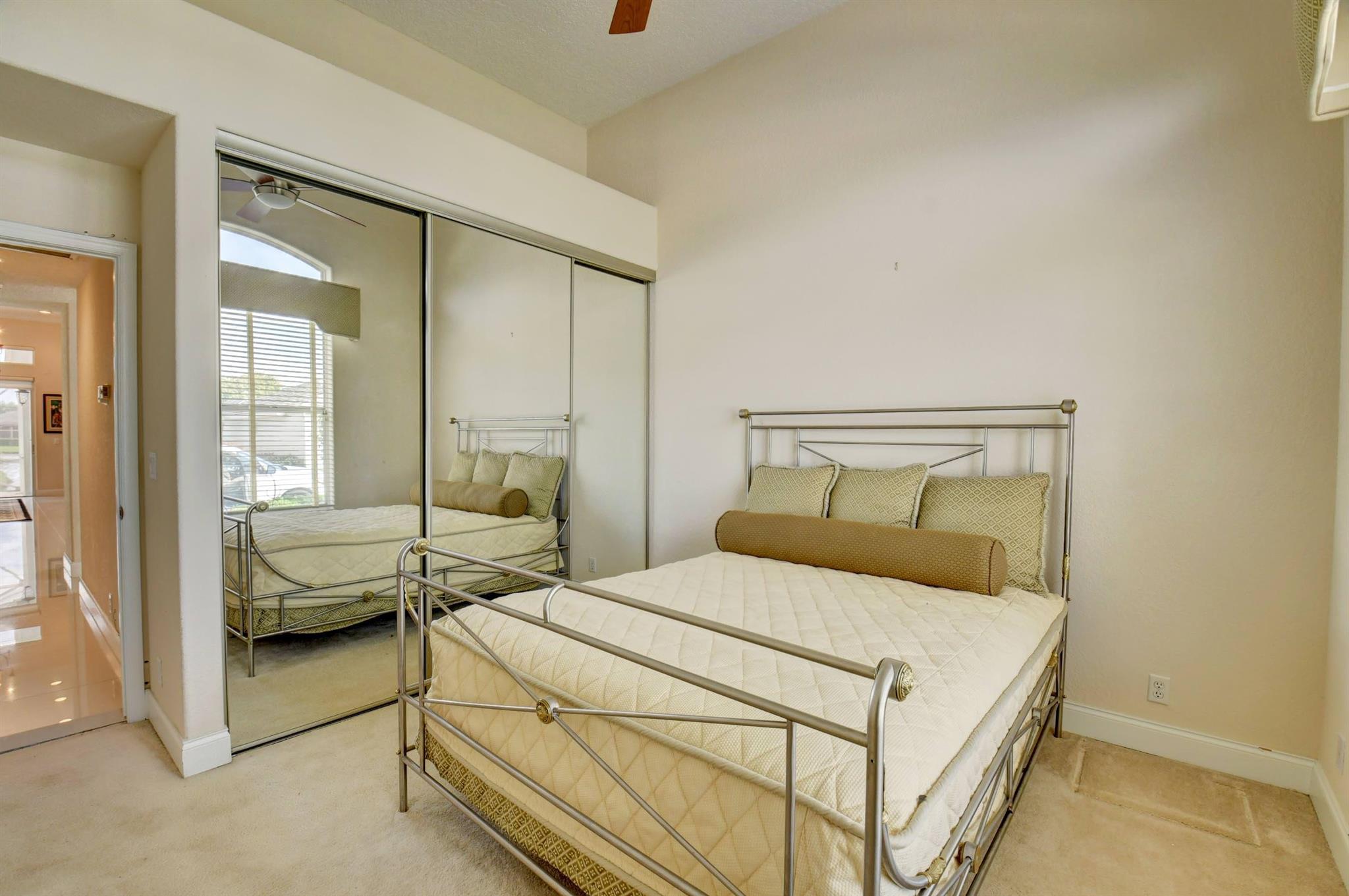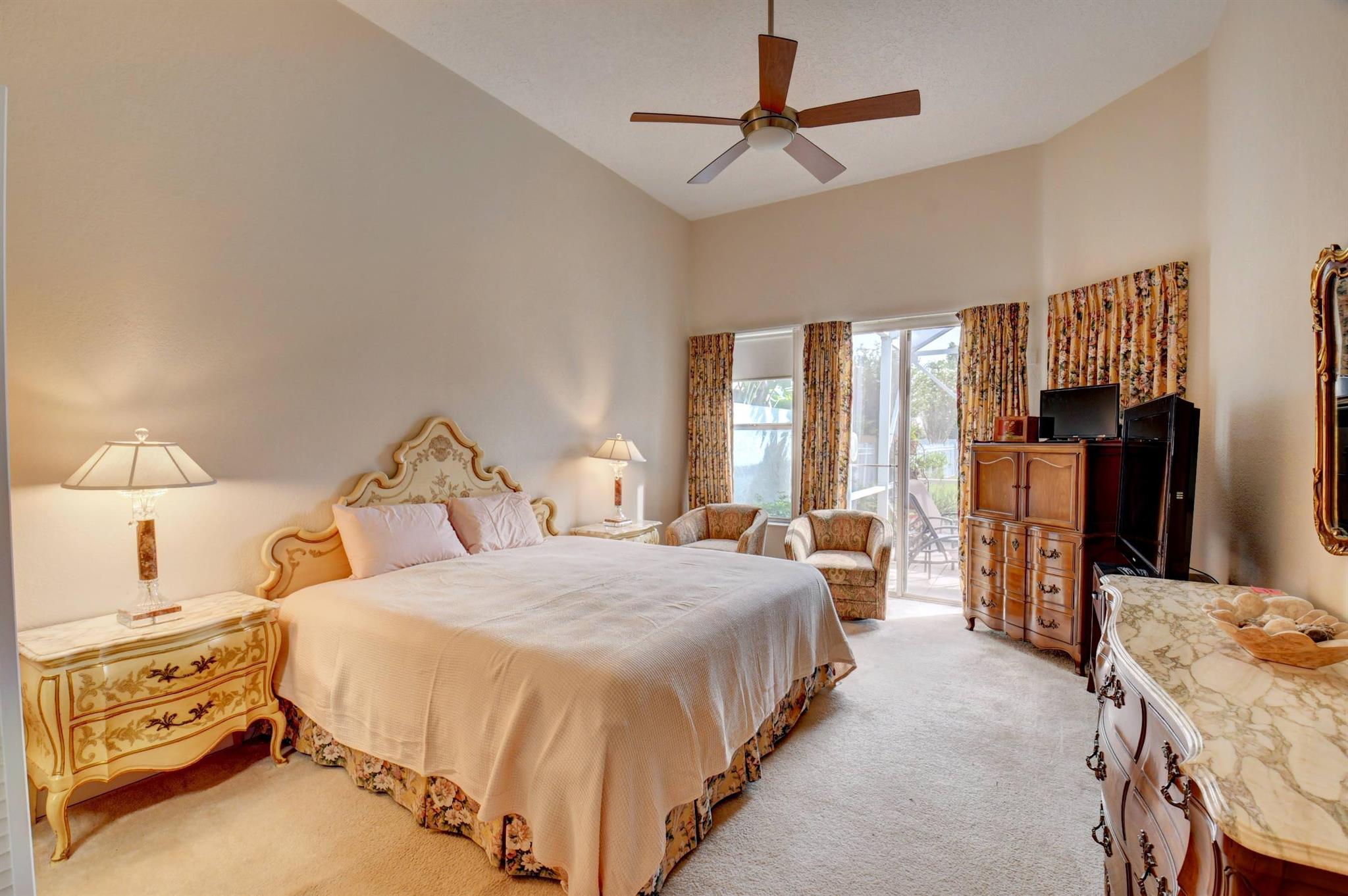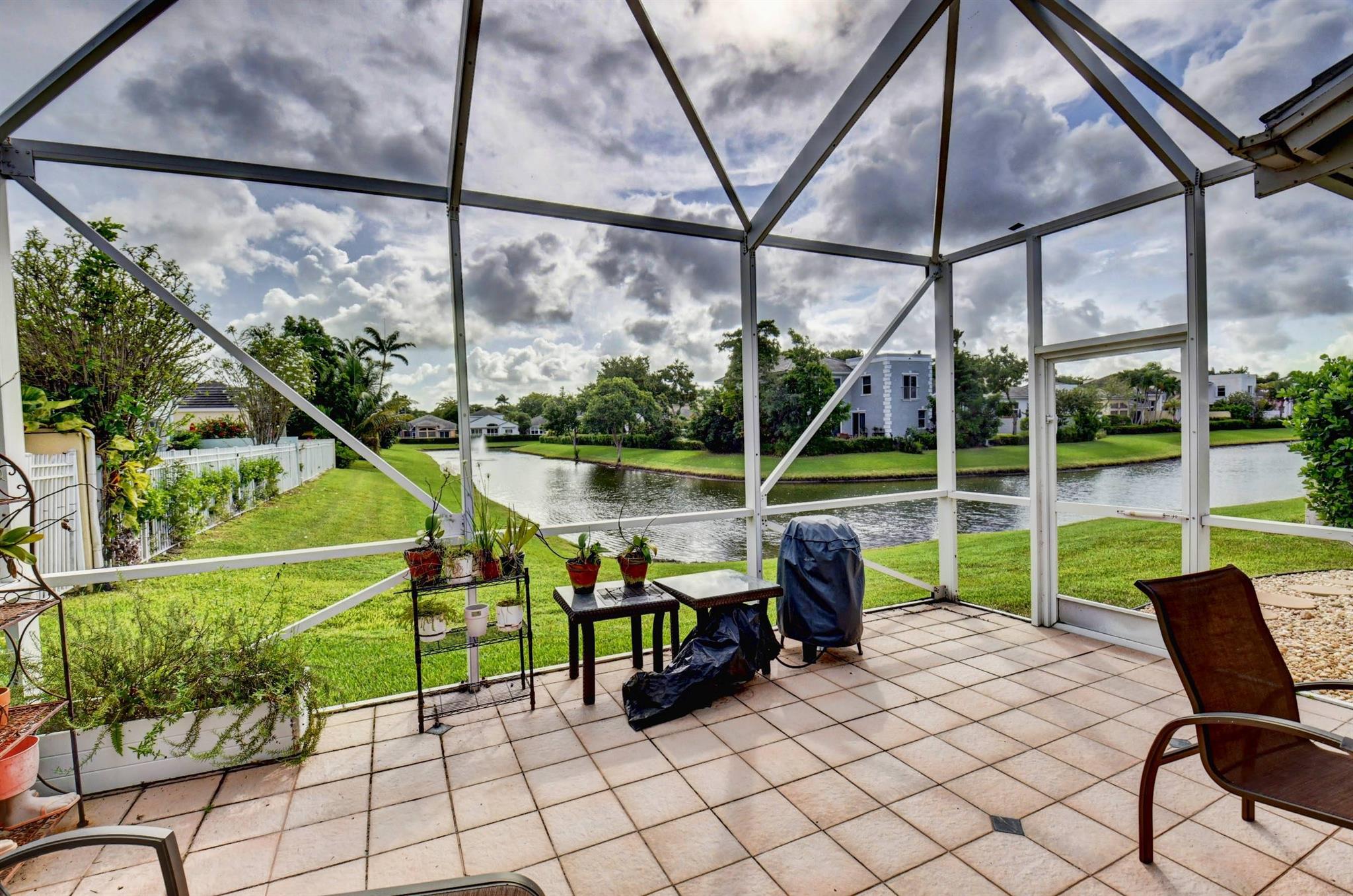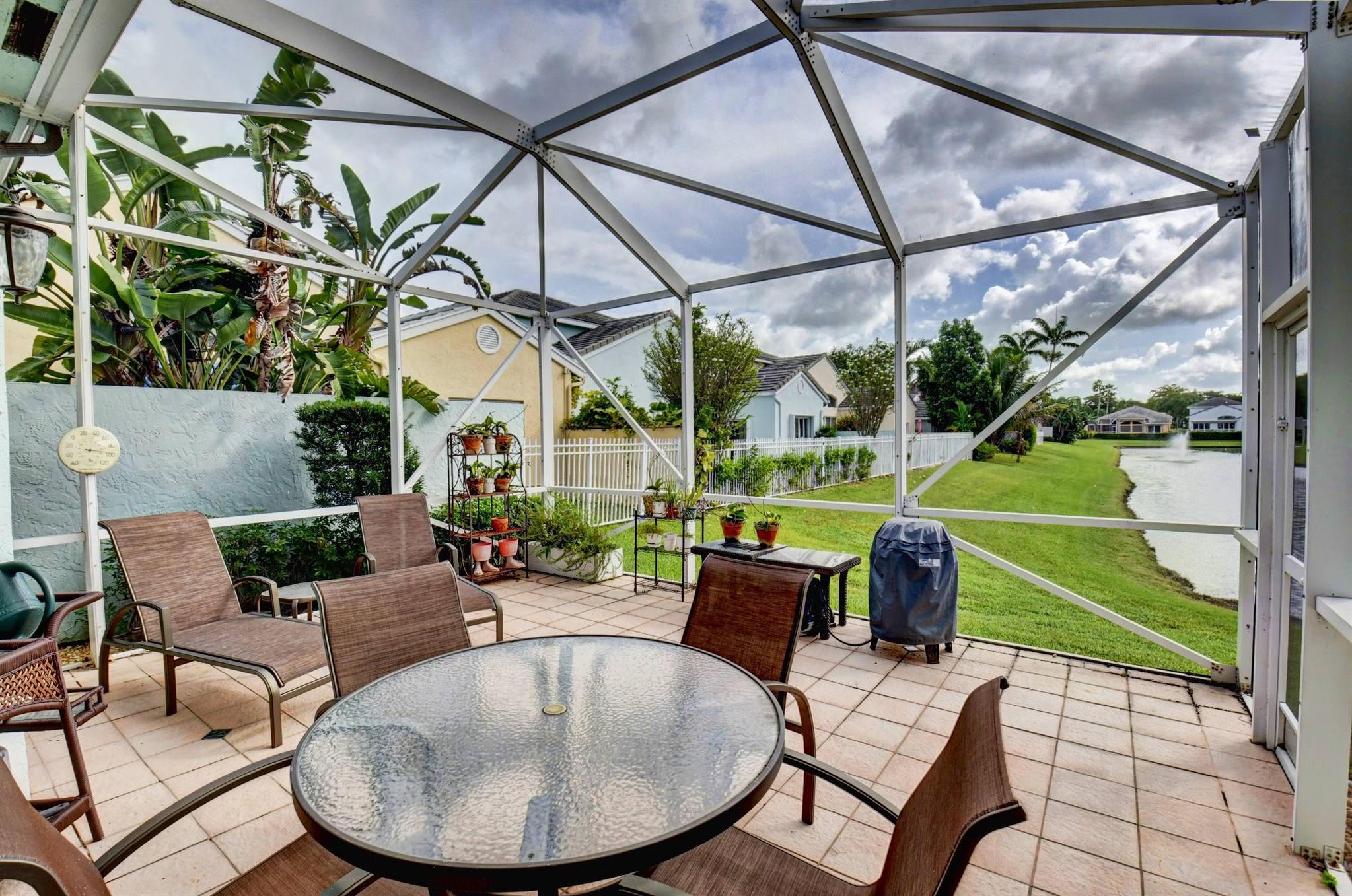 You won't forget this long lake view in this updated one story homes in popular Palms community. Floor plan features 2 bedrooms plus den and formal living and dining room. Large tile floors in main living areas. Updated kitchen and baths. Large screened in patio to enjoy endless water views. Roof replaced 2015! A/C replaced in 2020. Other features include crown molding, carpet in primary bedroom, built in closets in both bedrooms, primary bath has double sinks with lots of cabinet storage, tankless water heater, large walk in plus wall closet in primary bedroom, impact front door and so much more! Washer and dryer currently located in garage with sink. Laundry room used as hobby closet, but can be easily converted back. Close to subdivision pool. Don't miss this one!!!
