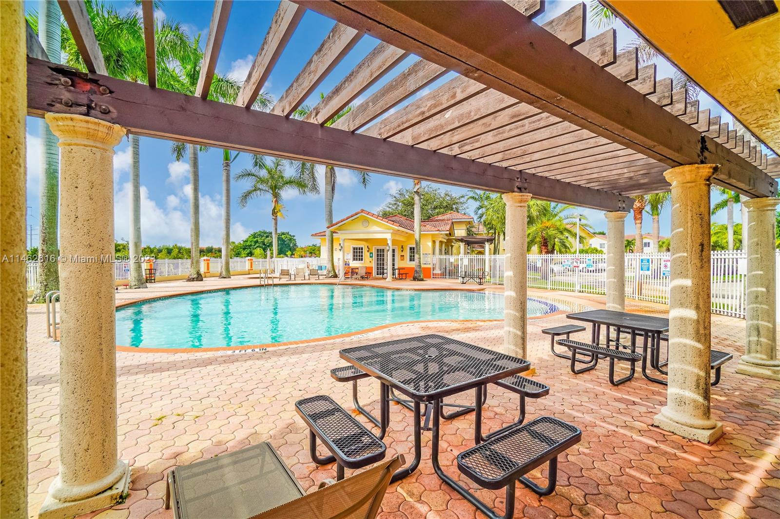 Spacious corner town-home/villa featuring 3 bedrooms and 3 full bathrooms. Ceramic floors, wood stairs, spacious kitchen with granite countertops and stainless steel appliances, Jacuzzi in privately fenced backyard. 2 parking spaces in-front of unit plus additional parking for visitors very close to property. One full en-suite bedroom with full bathroom on the first floor. Lowest association fee in the area only $160 per month for homeowners association, and it includes garbage and internet. Easy access not gated community. Prime location, close to supermarkets, schools and shopping centers, easy access to I-75, Palmetto and turnpike.