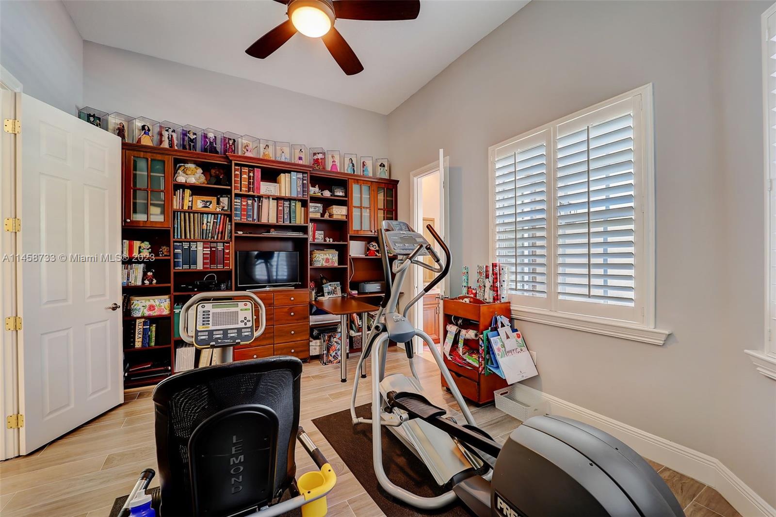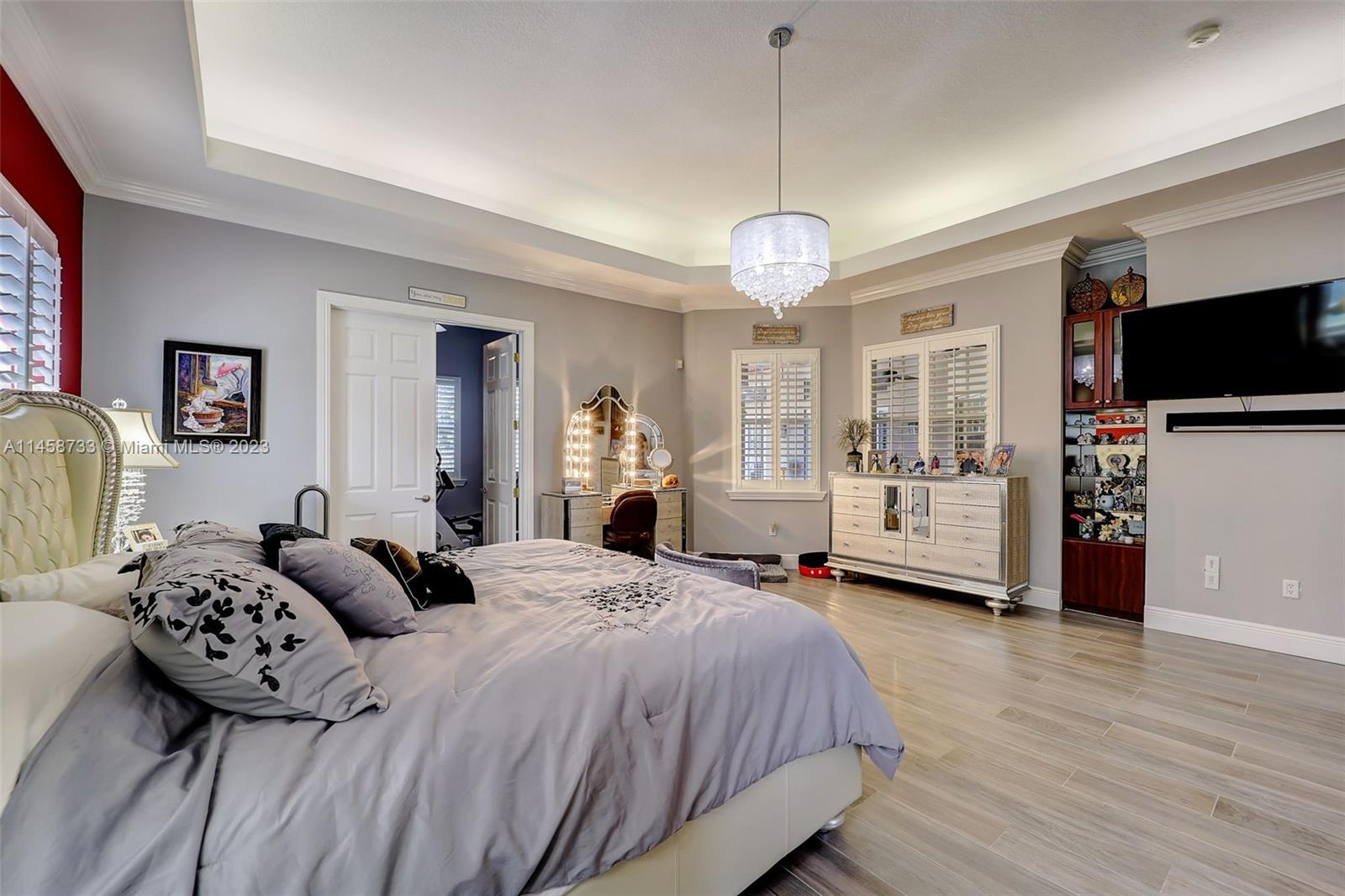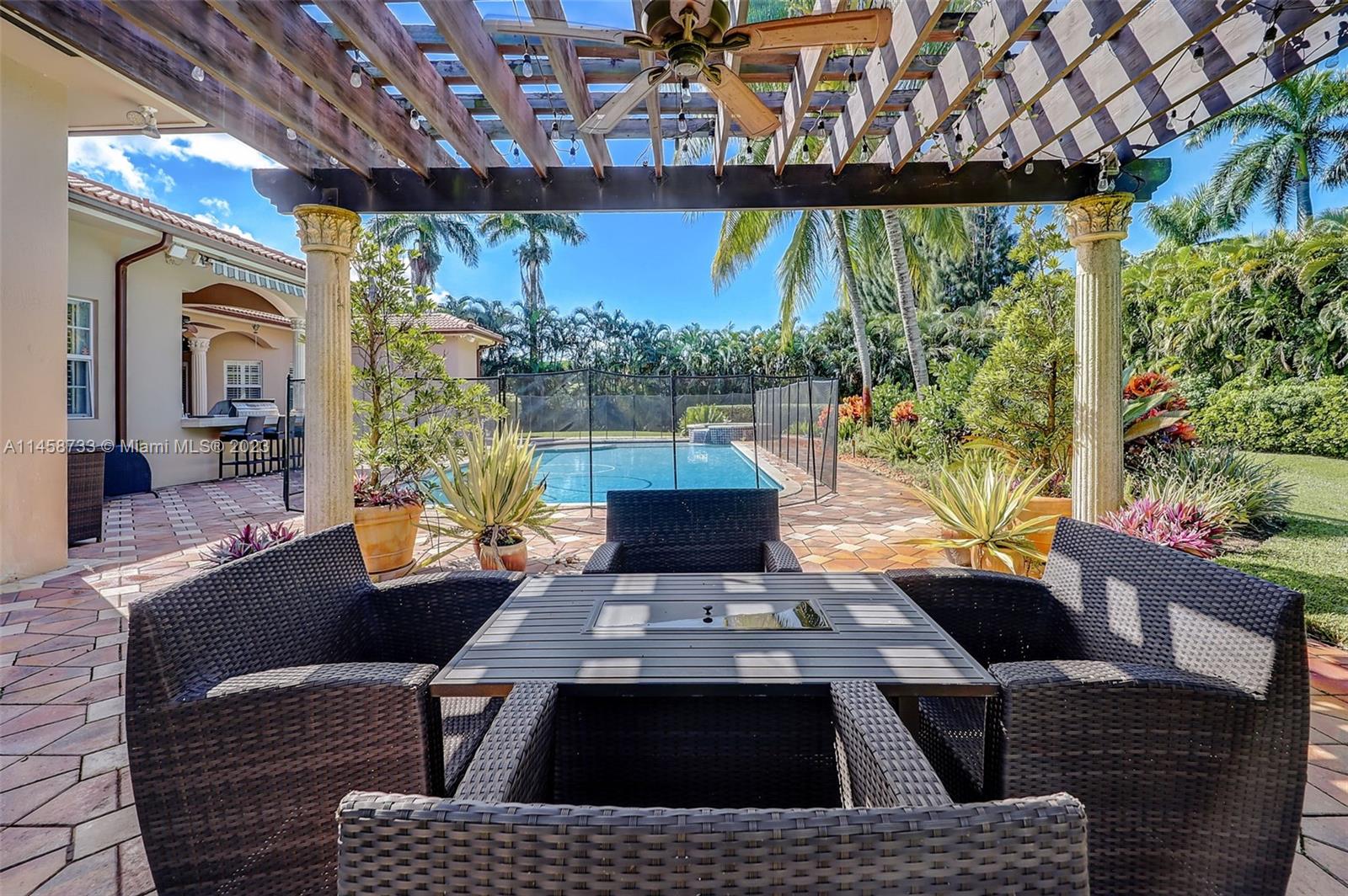 Step inside this luxurious property and be greeted by the impressive vaulted ceilings which create an open and spacious feel. This home has 4870 square feet of living space with 5 bedrooms 4.5 bathrooms, a 3 car garage with another detached garage for your golf cart. The theatre room and billiard room provide additional spaces for entertainment, while the sauna offers a luxurious escape for relaxation.Situated on almost 2 acres of land, this property offers a serene and private setting. The outdoor space is truly a retreat, with a heated saltwater pool and lush, mature landscaping and a summer kitchen. A built-in generator is included to power the entire house in case of a power outage. Bose surround sound speakers throughout the home and several security cameras for added protection.