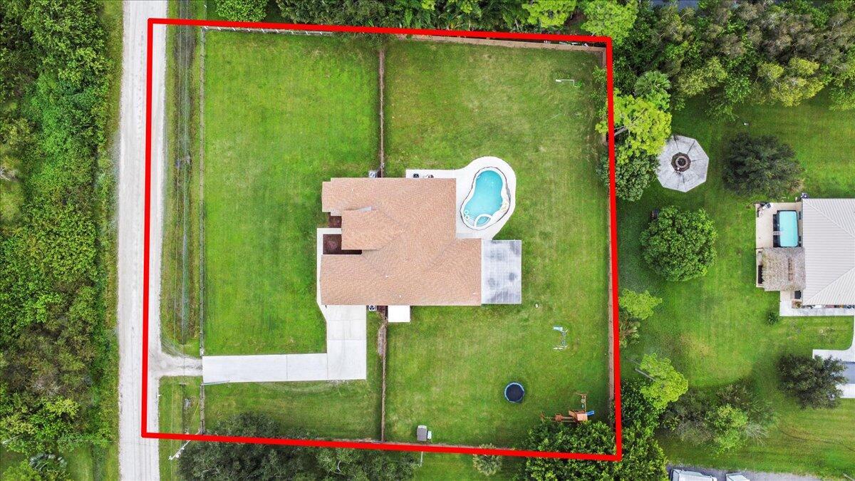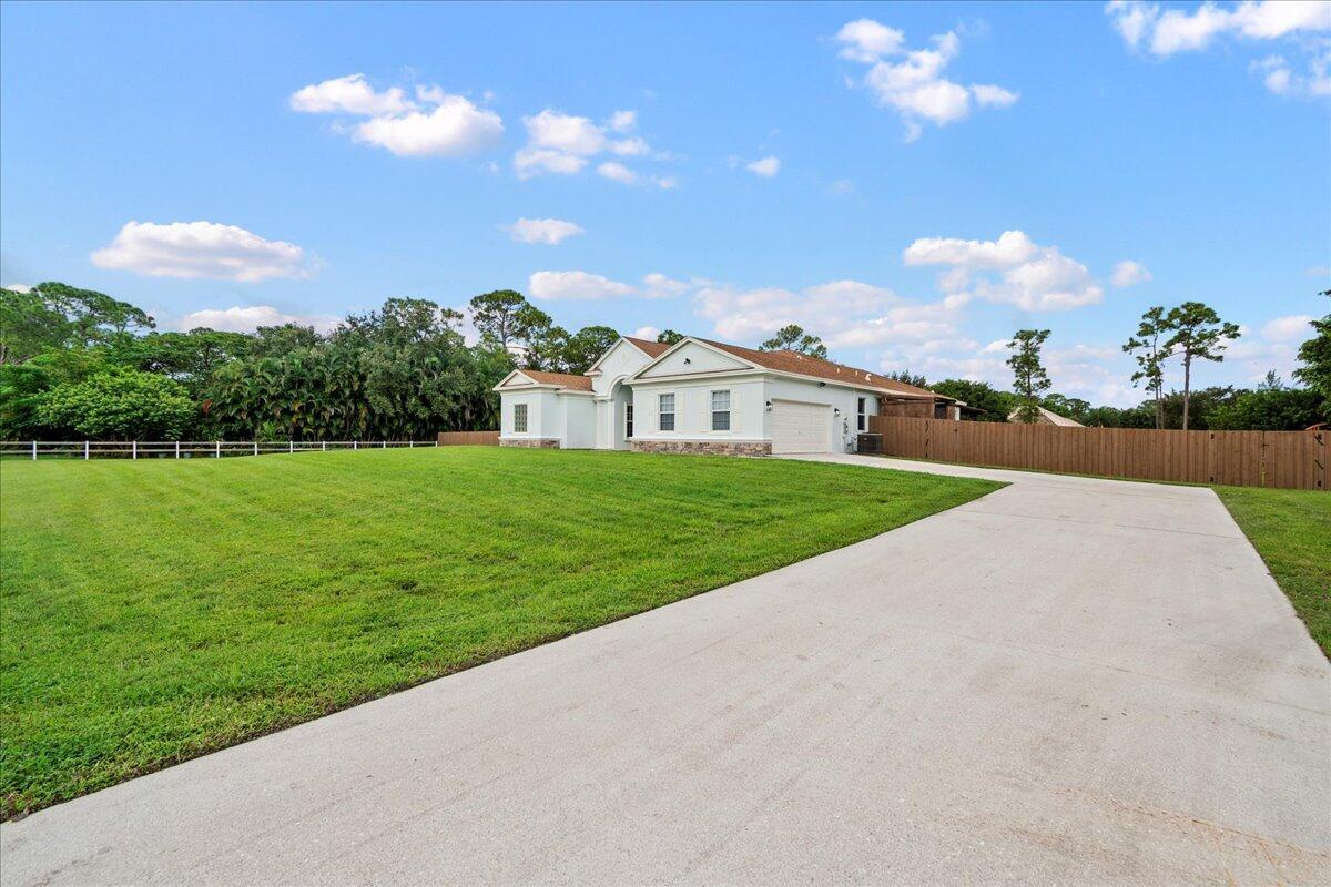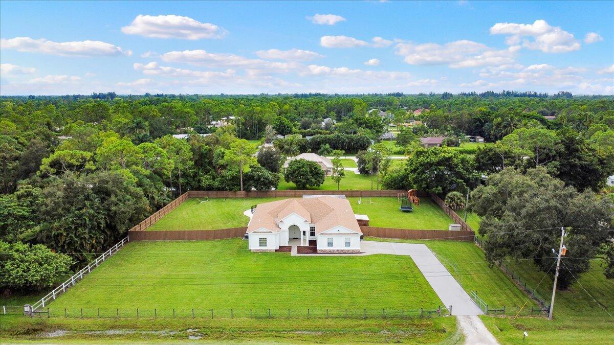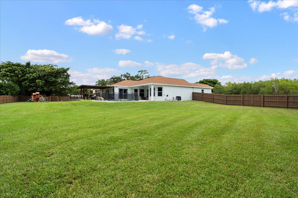 Look no further, you're Home!Beautiful 5 bed 3 full bath with oversize 2 car garage. Over 3000 ft. of living space meticulously cared for in the heart of the Acreage! The kitchen offers stainless steel appliances,granite counter tops,and wood cabinets.Newer hot water heater, 1,200 gallon septic tank recently serviced, new fence, n. 5th bedroom has a private full bath/exterior door perfect for in laws suit.Beautiful neutral ceramic tile throughout the main living areas. Newer aqua soft water system with fully covered an lighted enclosure. Full set of hurricane panels. 3 year old cement driveway. Newer AC unit in the main living area. Over 1 acre of fenced in land. Playground and trampoline included on the sale. Newer 20x20 oversize covered patio. Gorgeous saltwater pool and spa.
