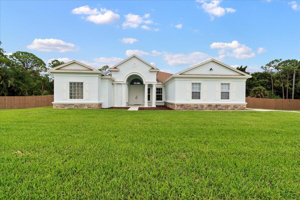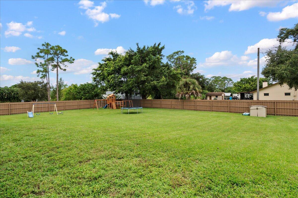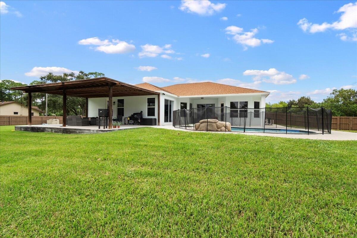 Look no further, you're Home!Beautiful 5 bed 3 full bath with oversize 2 car garage. Over 3000 ft. of living space meticulously cared for in the heart of the Acreage! The kitchen offers stainless steel appliances,granite counter tops,and wood cabinets.Newer hot water heater, 1,200 gallon septic tank recently serviced, new fence, n. 5th bedroom has a private full bath/exterior door perfect for in laws suit.Beautiful neutral ceramic tile throughout the main living areas. Newer aqua soft water system with fully covered an lighted enclosure. Full set of hurricane panels. 3 year old cement driveway. Newer AC unit in the main living area. Over 1 acre of fenced in land. Playground and trampoline included on the sale. Newer 20x20 oversize covered patio. Gorgeous saltwater pool and spa.