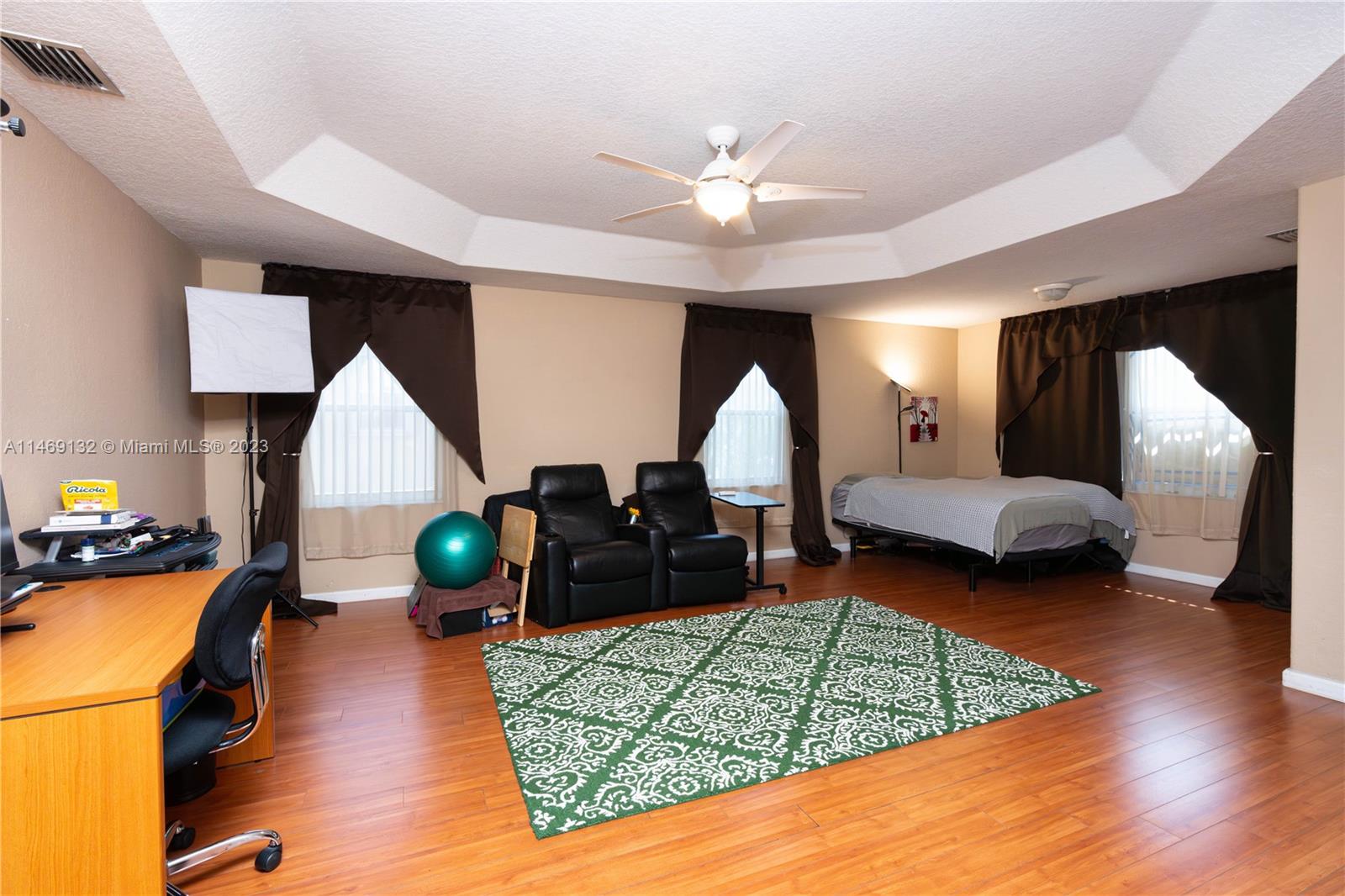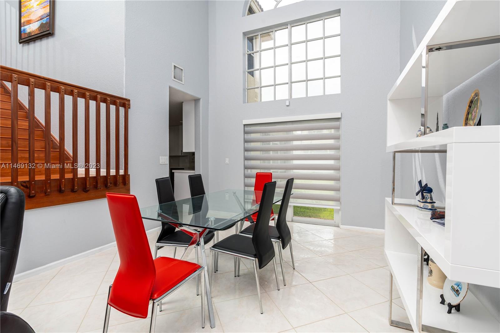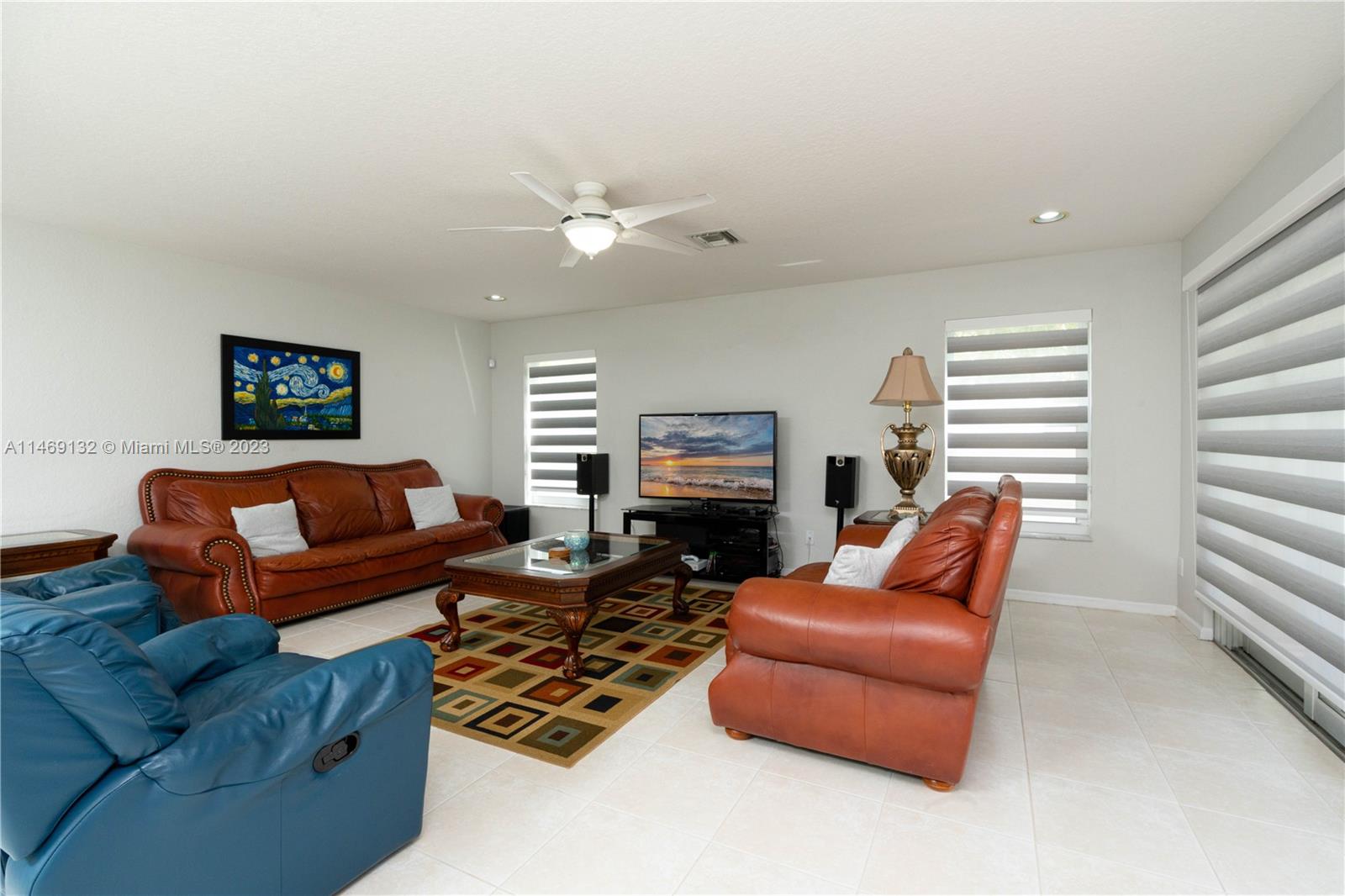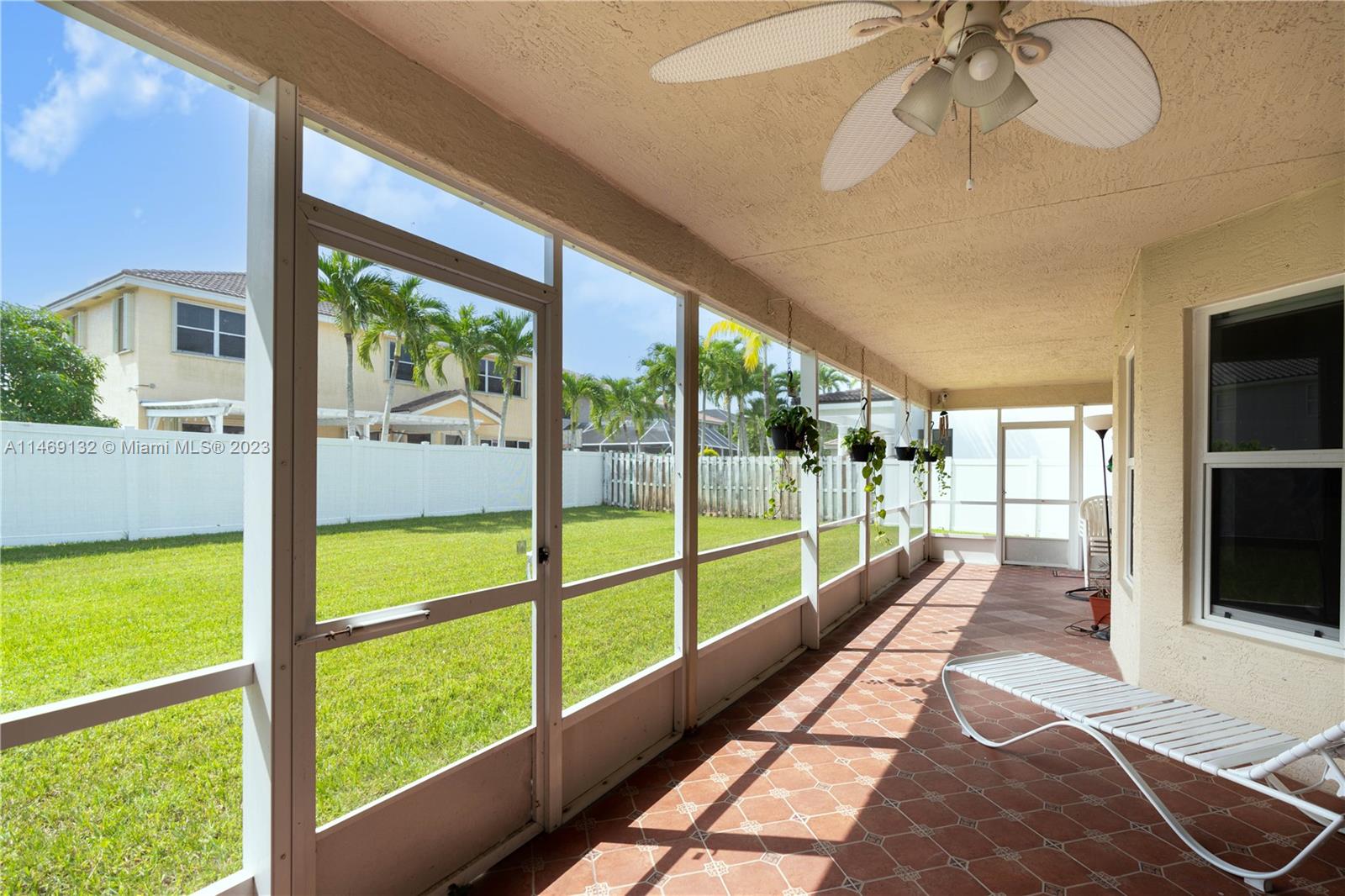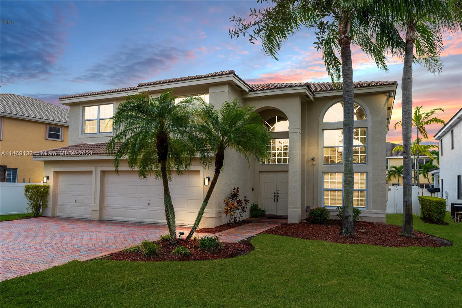 Beautiful and spacious 5 bedrooms + office/den, 3 bath with 3 car garage home located in quiet and tree lined community in West Miramar. Home features lot of natural light, high vaulted ceilings, new kitchen with wood cabinets and quartz countertops, new dishwasher, pantry, recessed spot lights throughout. First floor has new zebra blinds and hurricane impact windows, neutral color tile, one bedroom downstairs currently used as entertainment/movie room, one full bathroom, laundry room, fully screened patio great for entertaining and cookouts. Second floor has laminate floors throughout, master bedroom has 2 walk in closet (his and hers) spacious master bathroom with two vanities, roman bathtub and separate shower, 3rd, 4th and 5th bedroom and a home office. Welcome home!