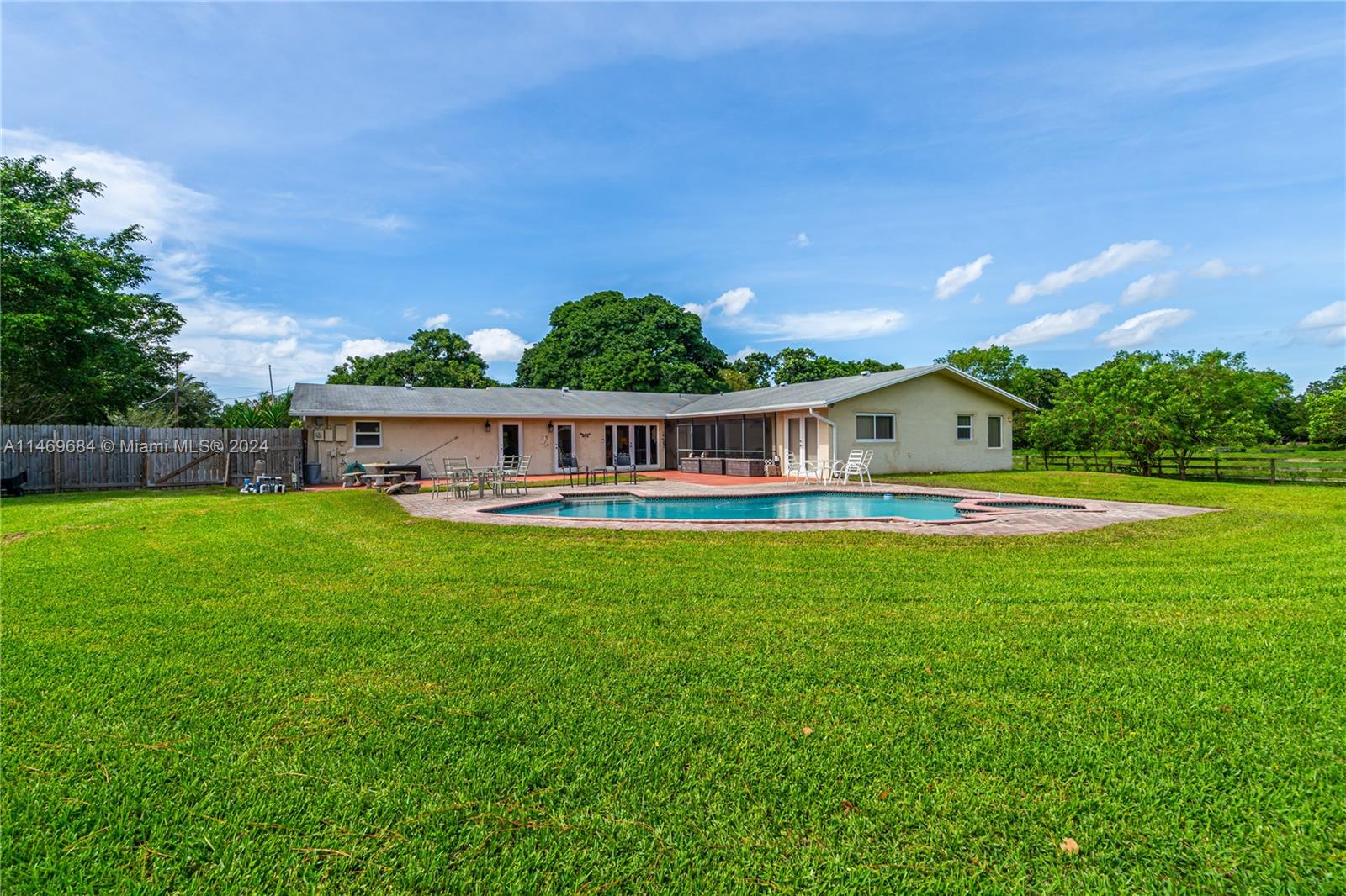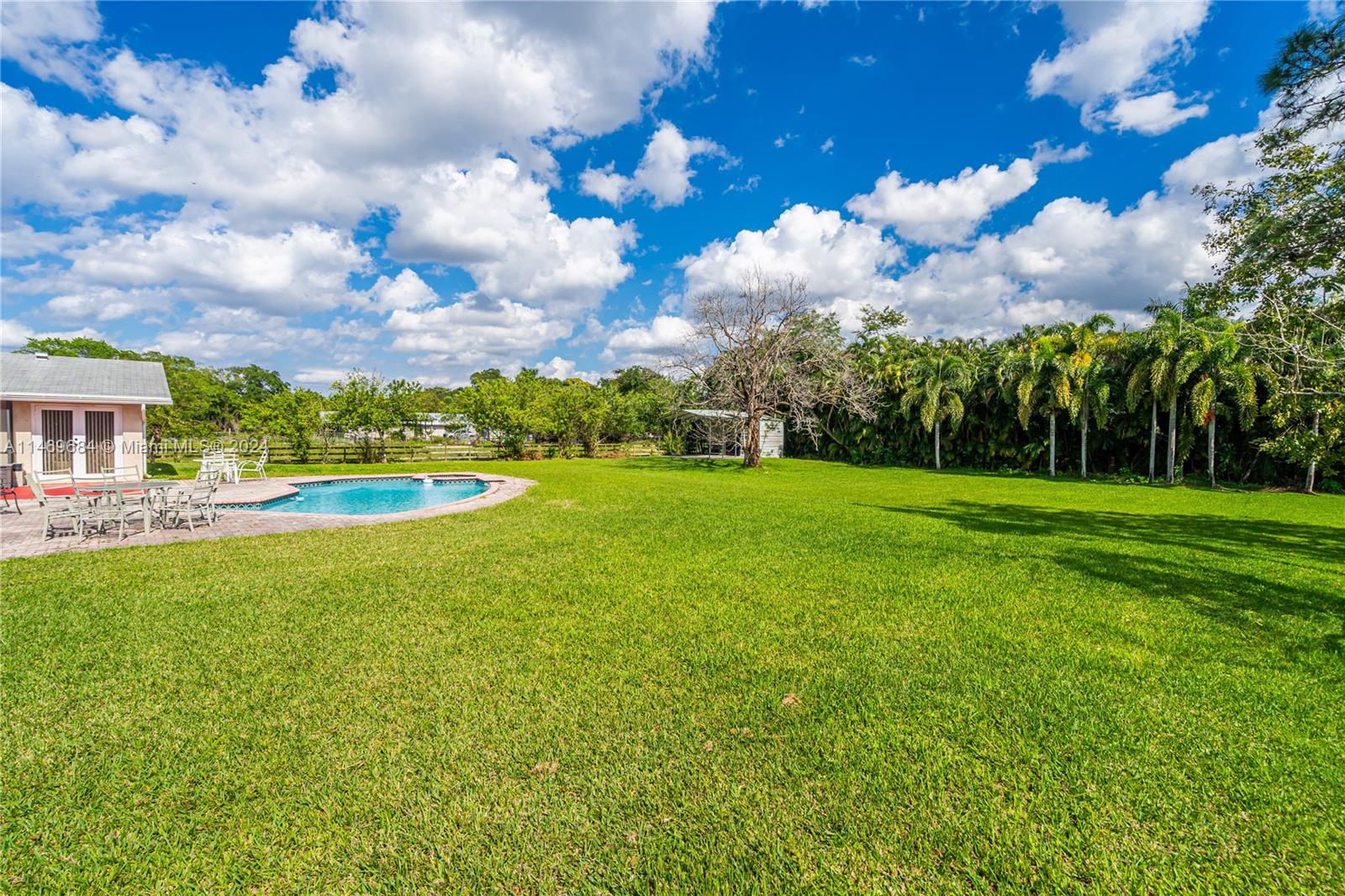 A hidden gem nestled on a private 1.05 acre lot. This spacious 5 bedroom 4 bath split floor-plan POOL home features three bedrooms with their own private en-suite and two guest rooms. Beautiful porcelain tiles in the kitchen and foyer & beautiful dark wood like flooring in the family and dining room. The kitchen was tastefully updated with real wood cabinetry, granite countertops & stainless steel appliances. The roof was replaced in 2017, the home has a large laundry room under air with a washer/dryer, 2nd fridge & freezer, 2 car garage, and new impact windows & doors (December 2022) throughout. This home is within walking distance to Hawkes Bluff Elementary School AND has NO HOA!!