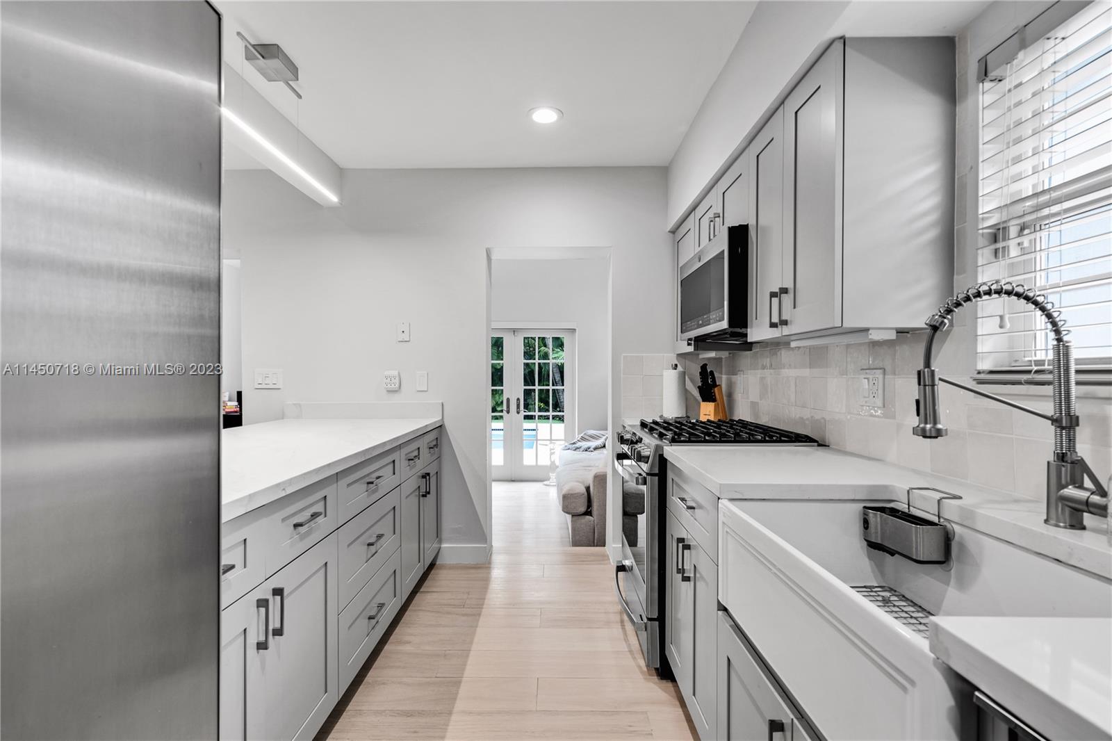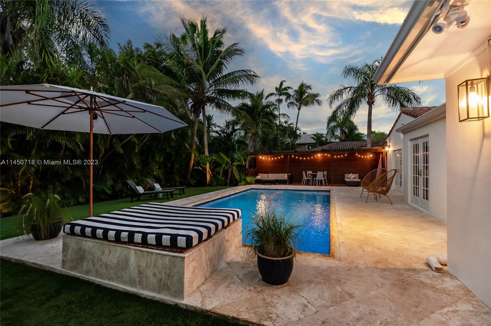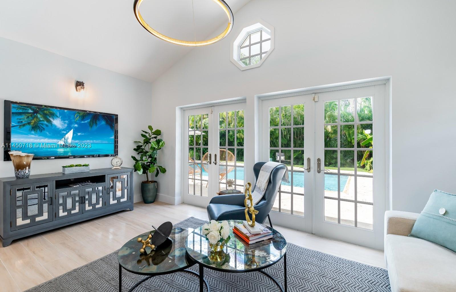 This stunning North Coconut Grove home is an absolute entertainer’s dream with its lush surroundings and beautiful backyard! This 3-bedroom, 2-bath hideaway offers the ultimate indoor–outdoor living experience with views of the pool from multiple rooms. Upgrades include remodeled bathrooms, impact windows, and updated kitchen. Kitchen upgrades include Calacatta Quartz countertops, soft-close shaker style cabinets, farmhouse sink, Gas Stove and modern appliances. The spacious primary suite will amaze you with outstanding pool views, sitting area, and 4 closets. Step out into the great big yard with an oversized in-ground pool, premium artificial grass, and wooden deck! You will feel as though you're on vacation in this beautiful private oasis! NO flood zone. Best schools nearby!