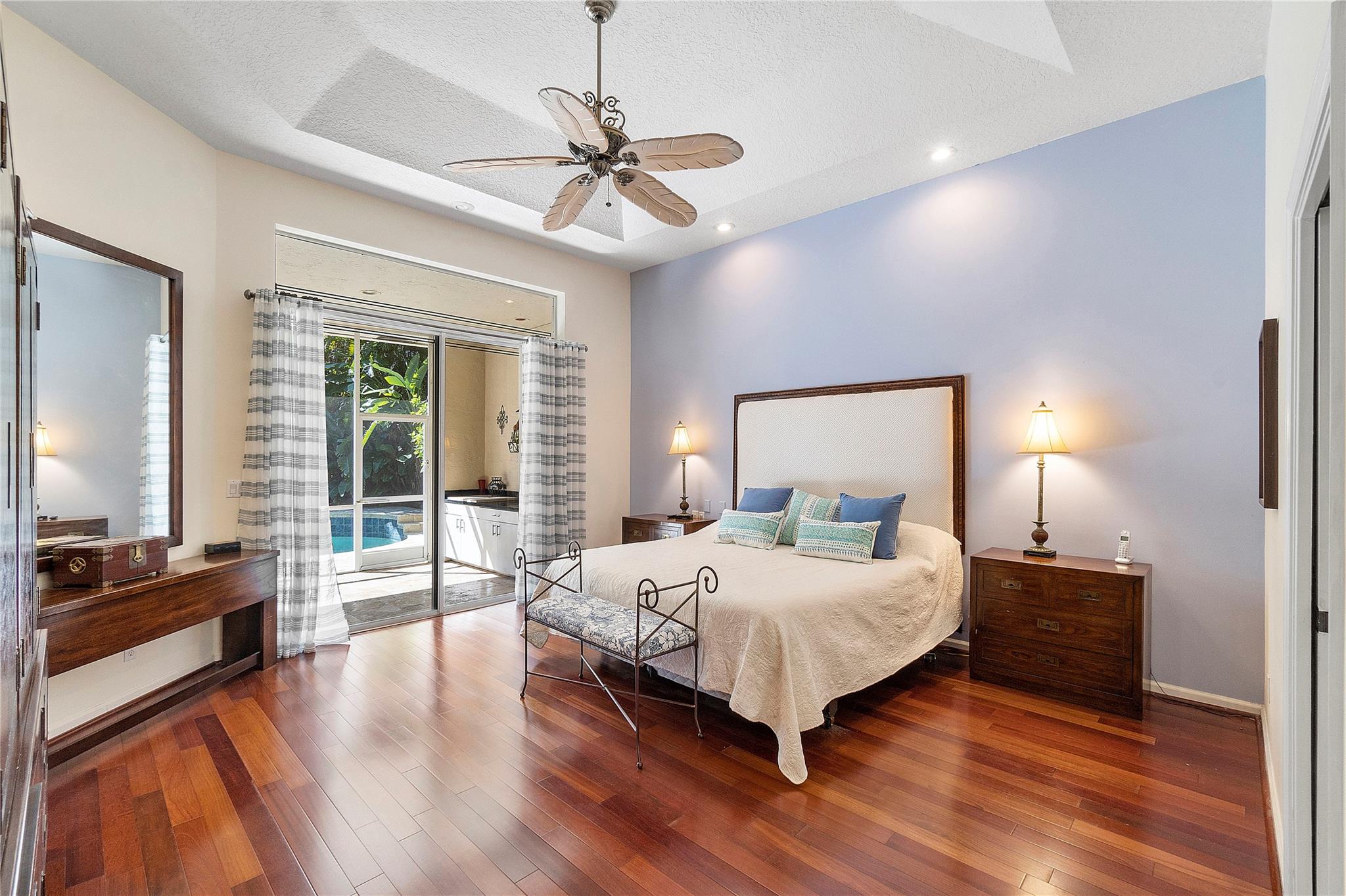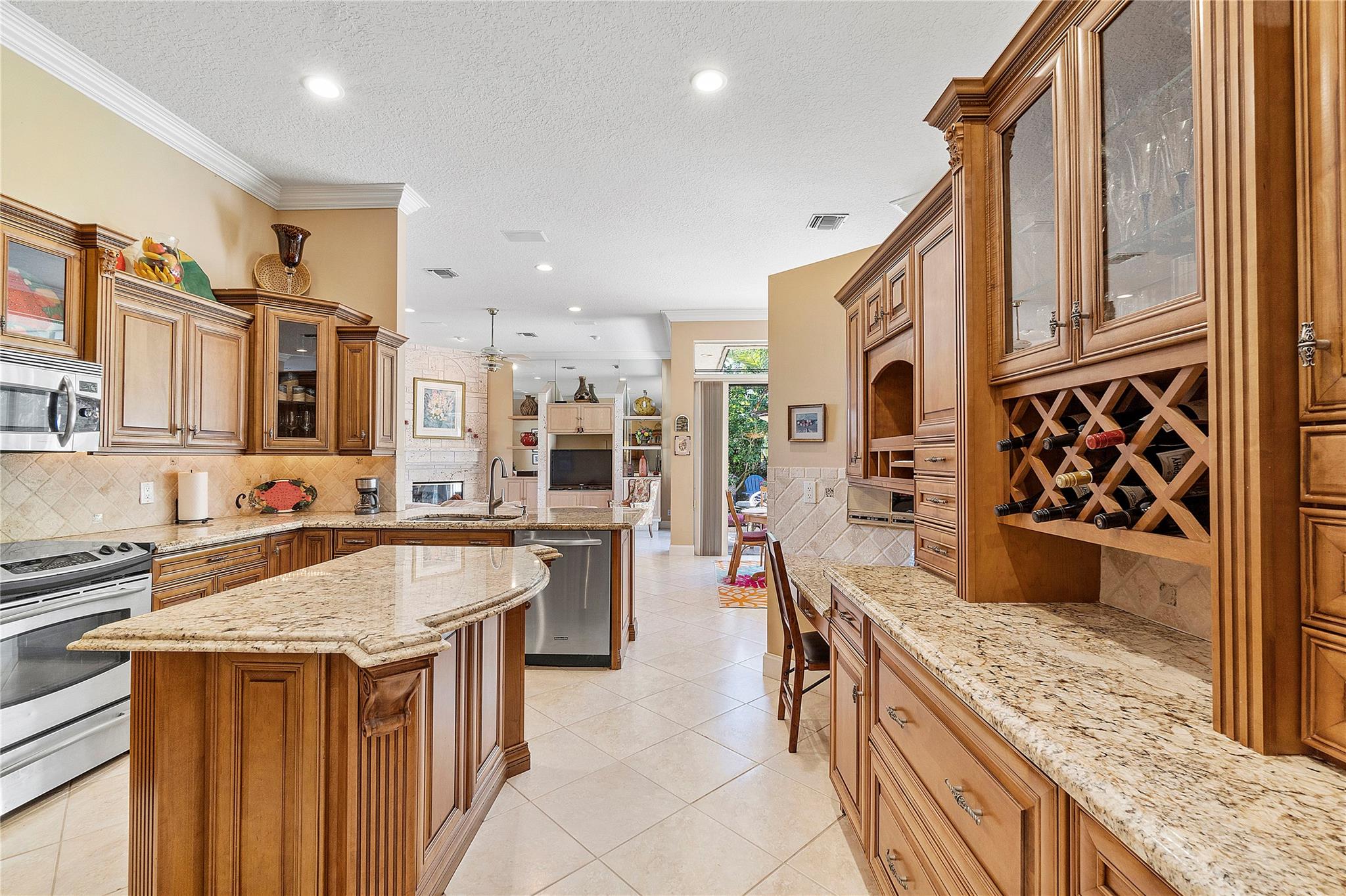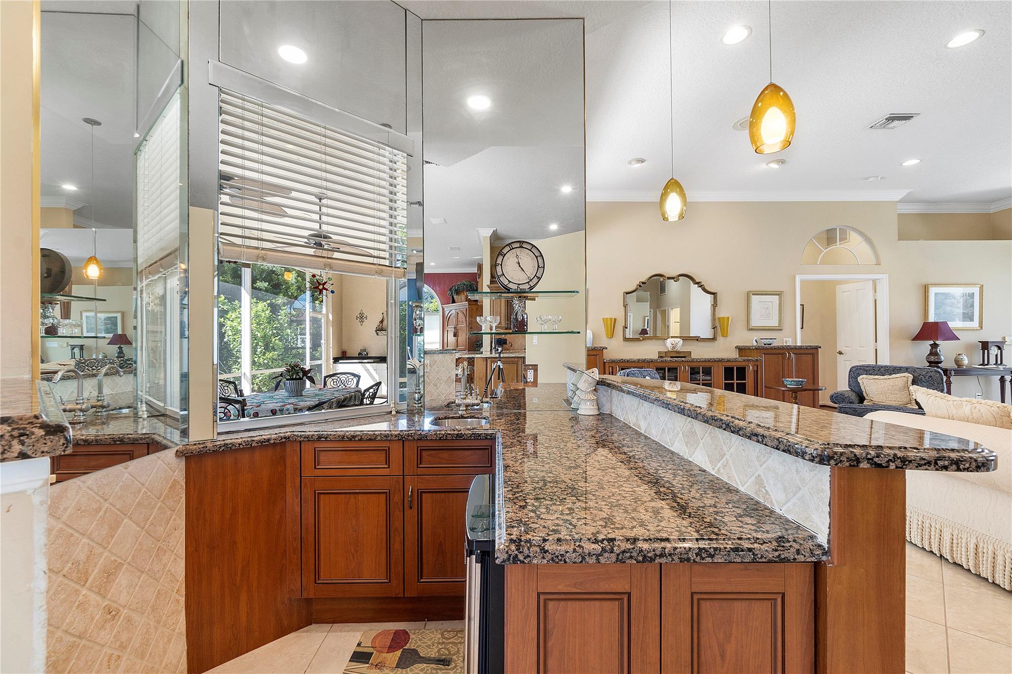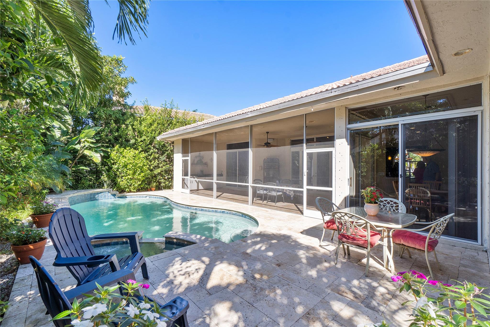 This Custom built 3/2.5 Home, complete with a circular driveway situated on a cul de sac. Inside, you'll find a updated kitchen with granite counters, wood cabinets, a center island, stainless steel appliances, a desk area, and built-in wine storage. Entertain your guests behind bar which is equipped with a mini refrigerator for all your beverages. Plantation shutters throughout. Spacious laundry room with refrigerator and extra storage. Brazilian cherry wood floors in the sizable Primary bedroom, which also features two walk-in closets and a luxurious bathroom with double sinks, a Jacuzzi tub, and a separate shower. Outside, the covered patio overlooks the fenced yard and sparkling pool with a spa.