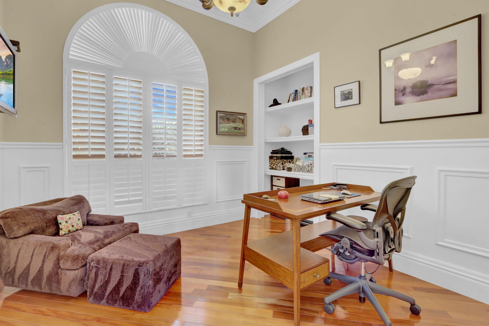 JUST REDUCED! This immaculate & bright one-story pool home offering 3 bedrooms plus an office features a double door front entry; volume ceilings with crown moldings; flat wall finish & wainscoting;Saturnia marble & wood floors; open kitchen with 42'' white cabinetry, granite counters & backsplash,farm sink, stainless steel appliances and an inviting breakfast nook;plantation shutters;solid core molded doors; a spacious primary suite with custom closet design & a marble bath; large utility room; 2-car garage & circular driveway. French doors open across the rear of the home to a covered lanai & a spacious screened patio area of stone pavers with an oversized pool surrounded by extensive tropical landscape design. Roof 2021, A/Cs - 2022, 2015, Japanese water heater 2021. Move right in