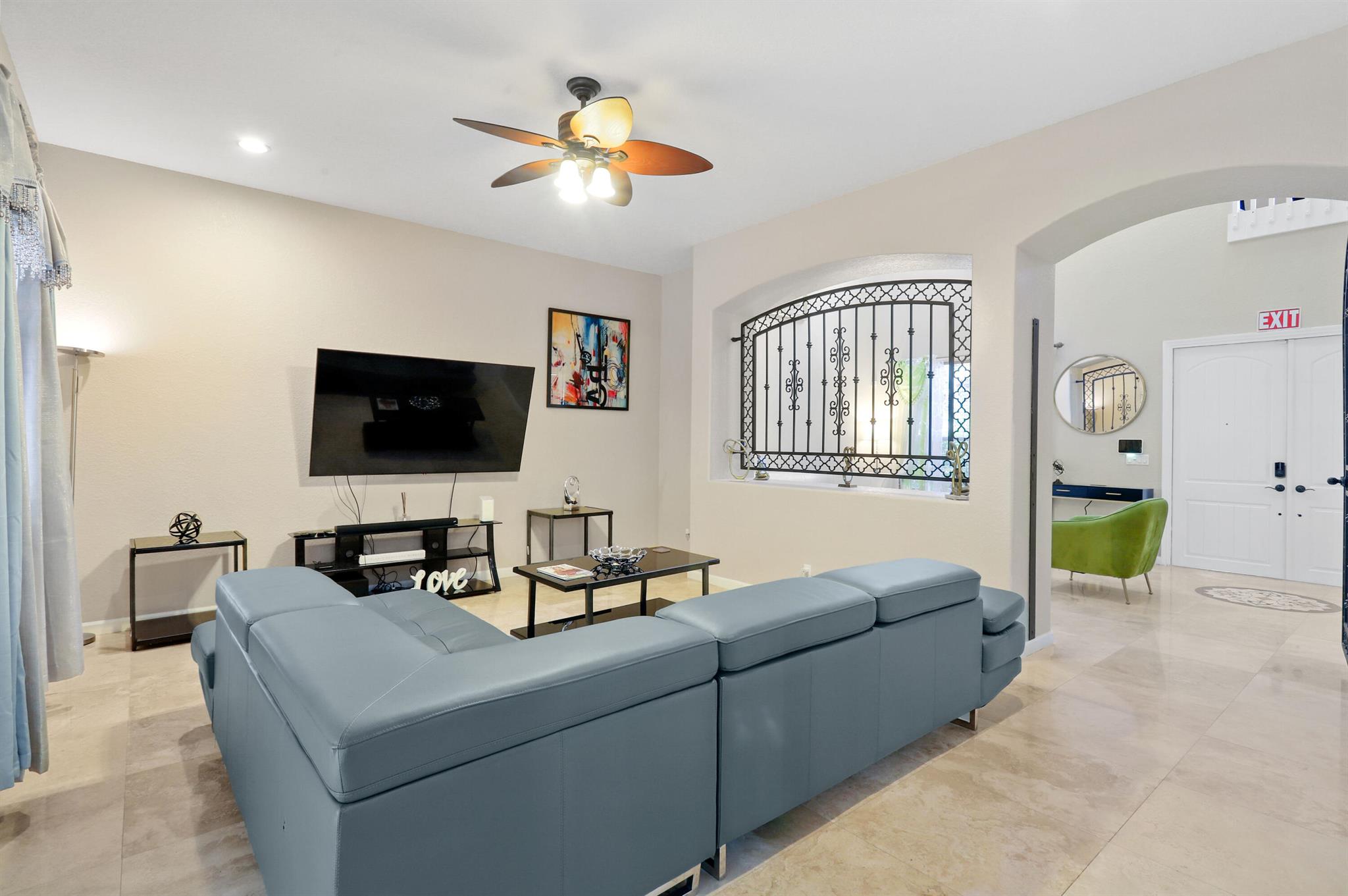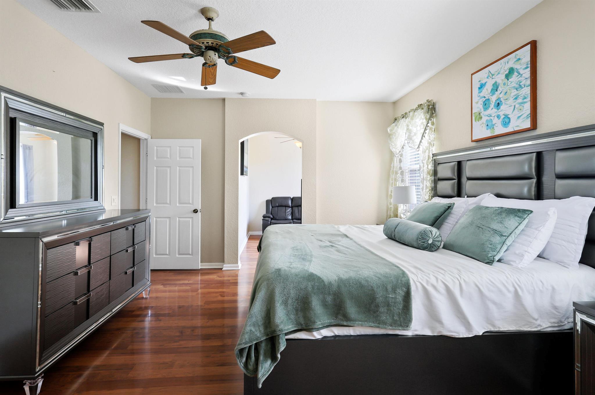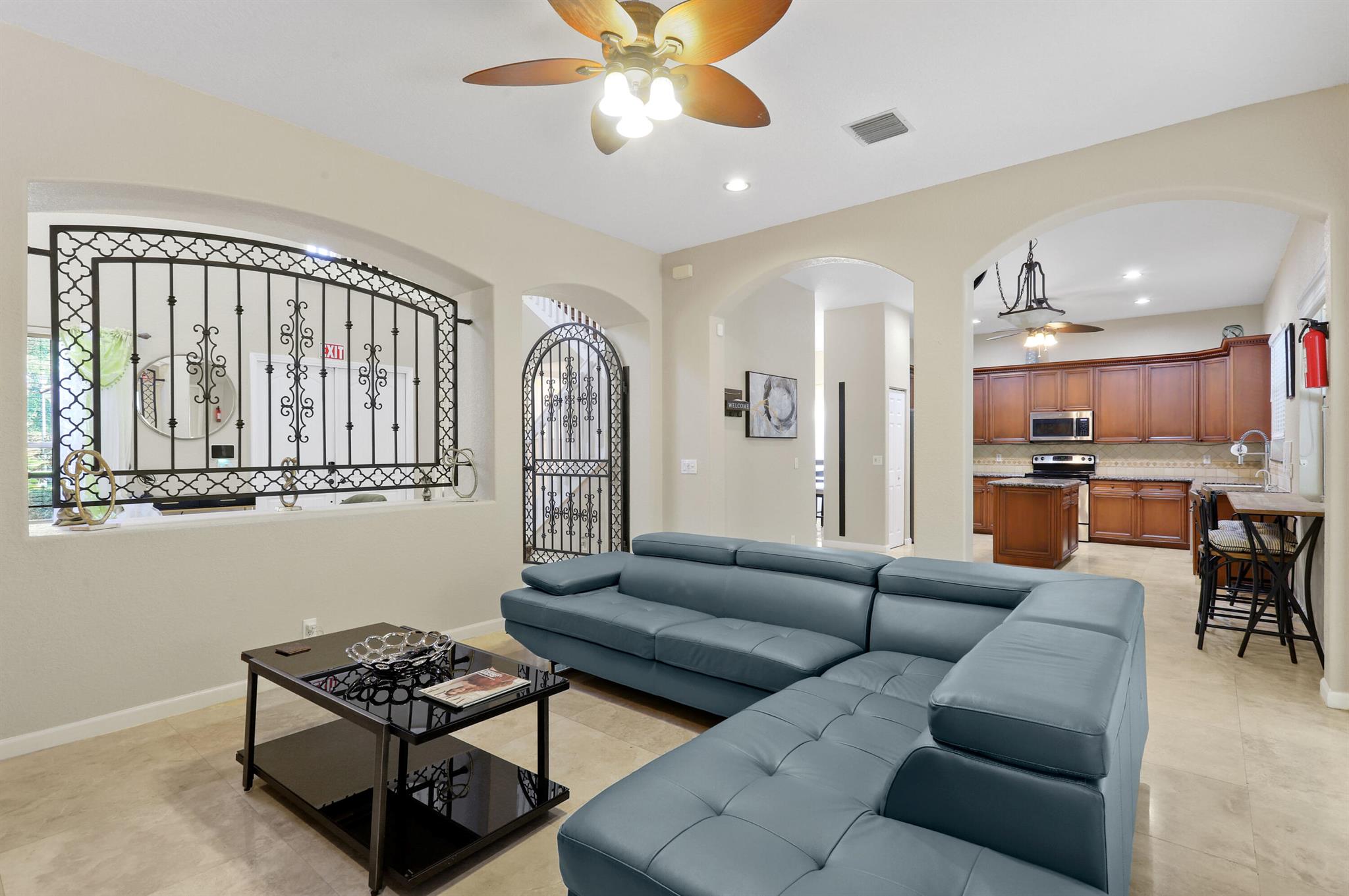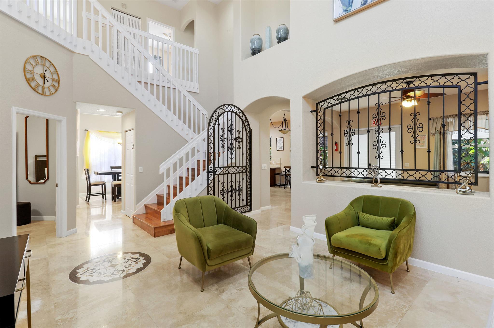 Welcome to the prestigious Laguna Lakes community, a serene and secure gated oasis in the beautiful surroundings of Palm Beach County. This charming home is a rare gem, offering everything you've been searching for. As you enter this elegant sanctuary, you will be greeted by a grand entryway boasting a soaring 20 plus foot vaulted ceiling, creating an undeniable sense of luxury and grandeur. The open floor concept throughout the home allows for seamless flow and effortless entertaining.With five spacious bedrooms and three full bathrooms, this home provides ample space for the entire family and guests. The primary bedroom is a true retreat, featuring an additional sitting area that can be utilized as a nursery or office space, ensuring flexibility and convenience.
