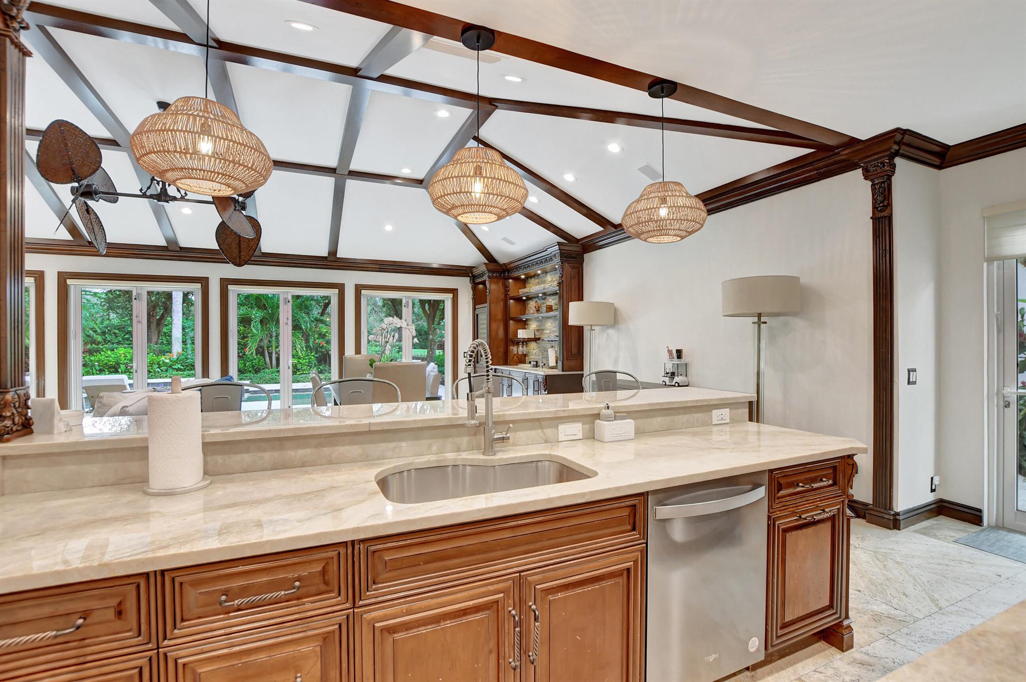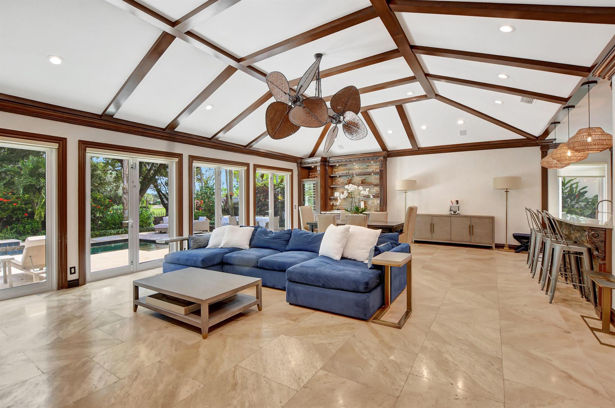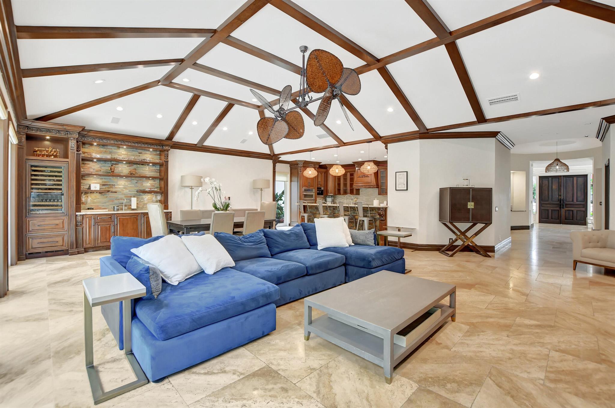 Stunning single-story home on a golf course. Open floor plan with split bedrooms. Impressive upgrades including impact glass, generator hook-up, and newer roof. Luxurious master bedroom suite with separate dressing area and lavish master bath. Guest bedrooms with their own bathrooms. Fully equipped kitchen with top-of-the-line appliances. Great Room with wood cabinetry, custom bar, and a sub-zero wine cooler. Electronic shades in master bedroom and Great Room. Retractable awning for convenience. Pool and patio with golf course views. Boca Grove is a prestigious country club community with mandatory membership. Fee schedule available upon request.