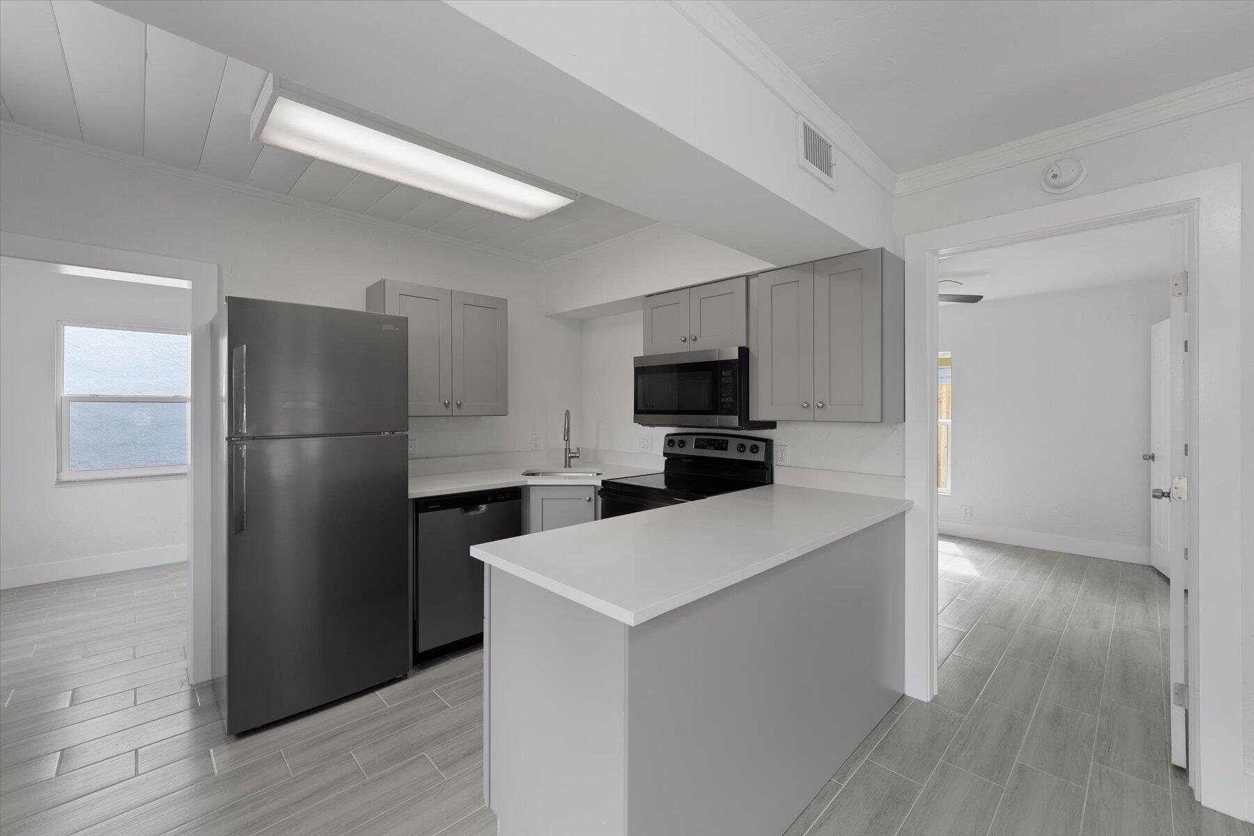 This charming 3-bedroom, 2-bathroom single family home combines the timeless allure of Spanish architecture with modern updates and amenities. Nestled in a prime location close to downtown West Palm Beach, this property offers convenience, style, and comfort all in one. The kitchen has been thoughtfully updated and boasts modern cabinetry, quartz countertops, and new stainless steel appliances. New wood-look tile flooring flows throughout, adding a touch of elegance and easy maintenance to every room. This property features a detached 1 car garage for your convenience and a brand new privacy fence. Renovated bathrooms boast new vanities, fixtures and tile inlay in showers. Don't miss this rare opportunity to own a Spanish-style gem with its stunning updates and charming aesthetics.