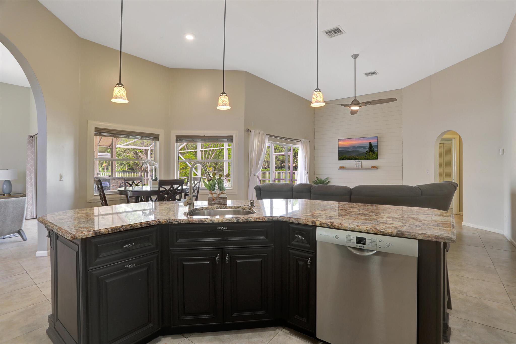 Renovated, impeccably and well maintained waterfront home. With a roof installed in July 2019, and both the A/C and hot water heater replaced in 2017, this home is not only aesthetically pleasing but also exceptionally well-maintained. Its interior features an inviting neutral decor. The spacious layout includes 12-foot ceilings without the unsightly popcorn texture, and it's adorned with 20'' x 20'' tile throughout. The kitchen is graced by a Solatube, which enhances the influx of natural light. Outside, the private backyard is a haven, showcasing a 750 Sq Ft screened patio surrounded by a fenced yard that overlooks a tranquil lake. Enjoy the added benefit of no rear neighbors, and the cul-de-sac street, complete with sidewalks, is perfect for families with children. This home is in the.