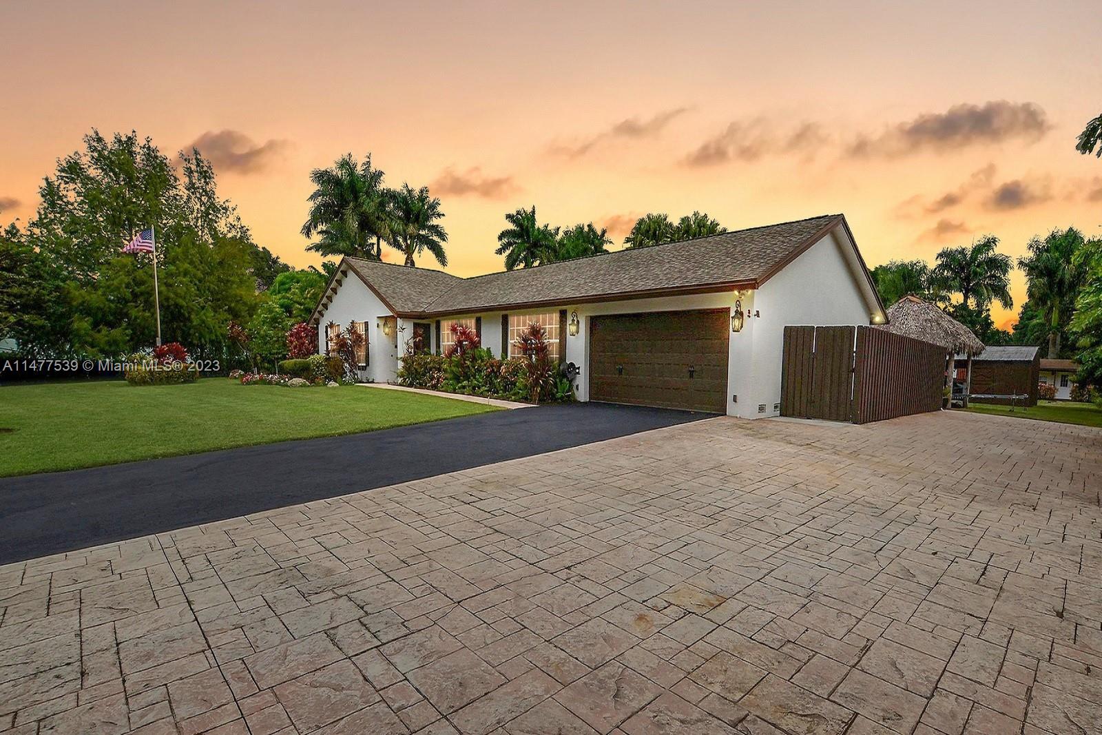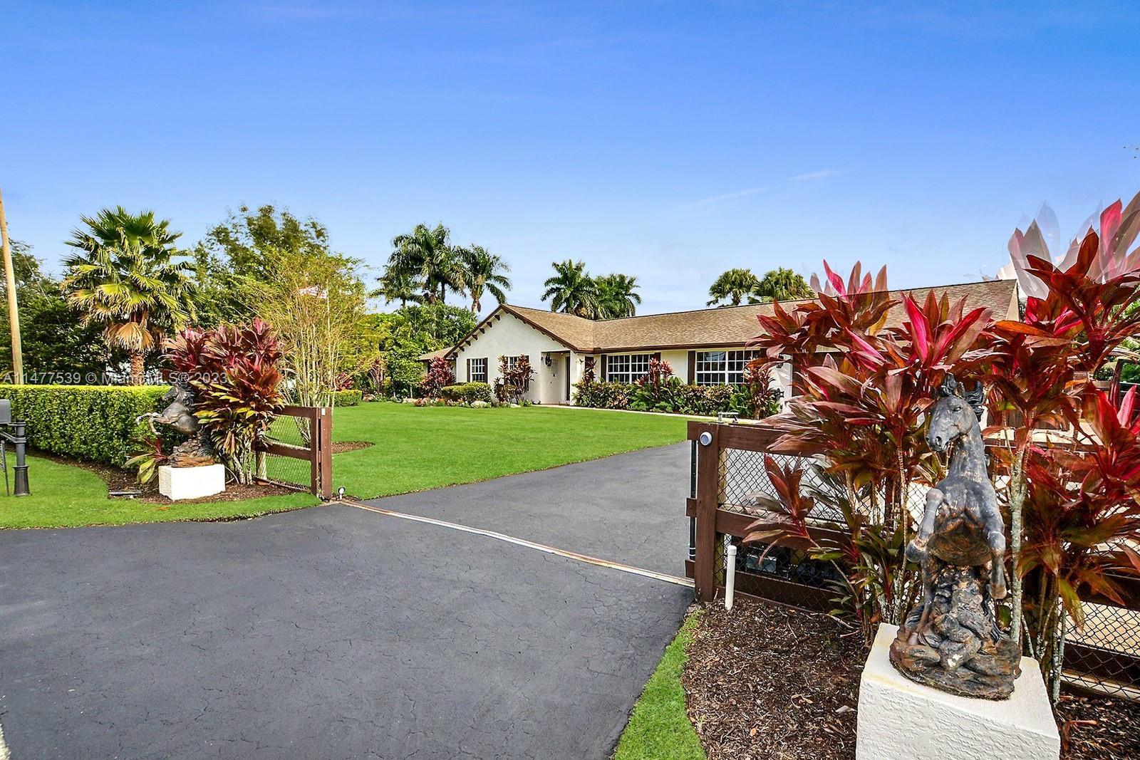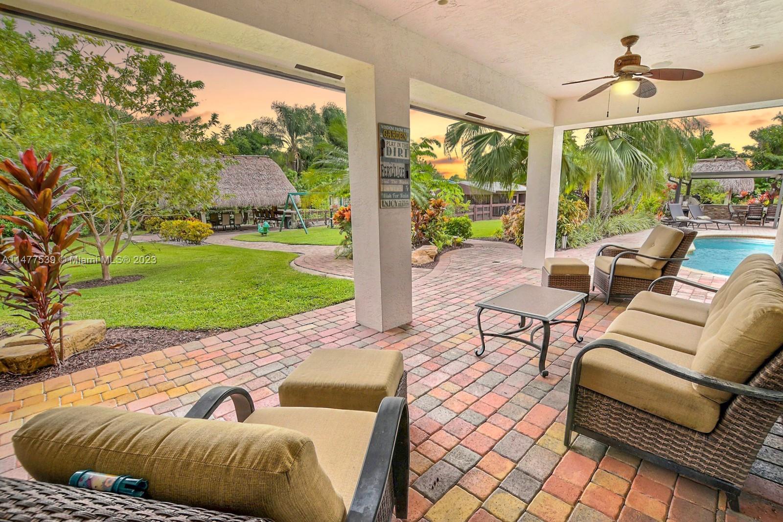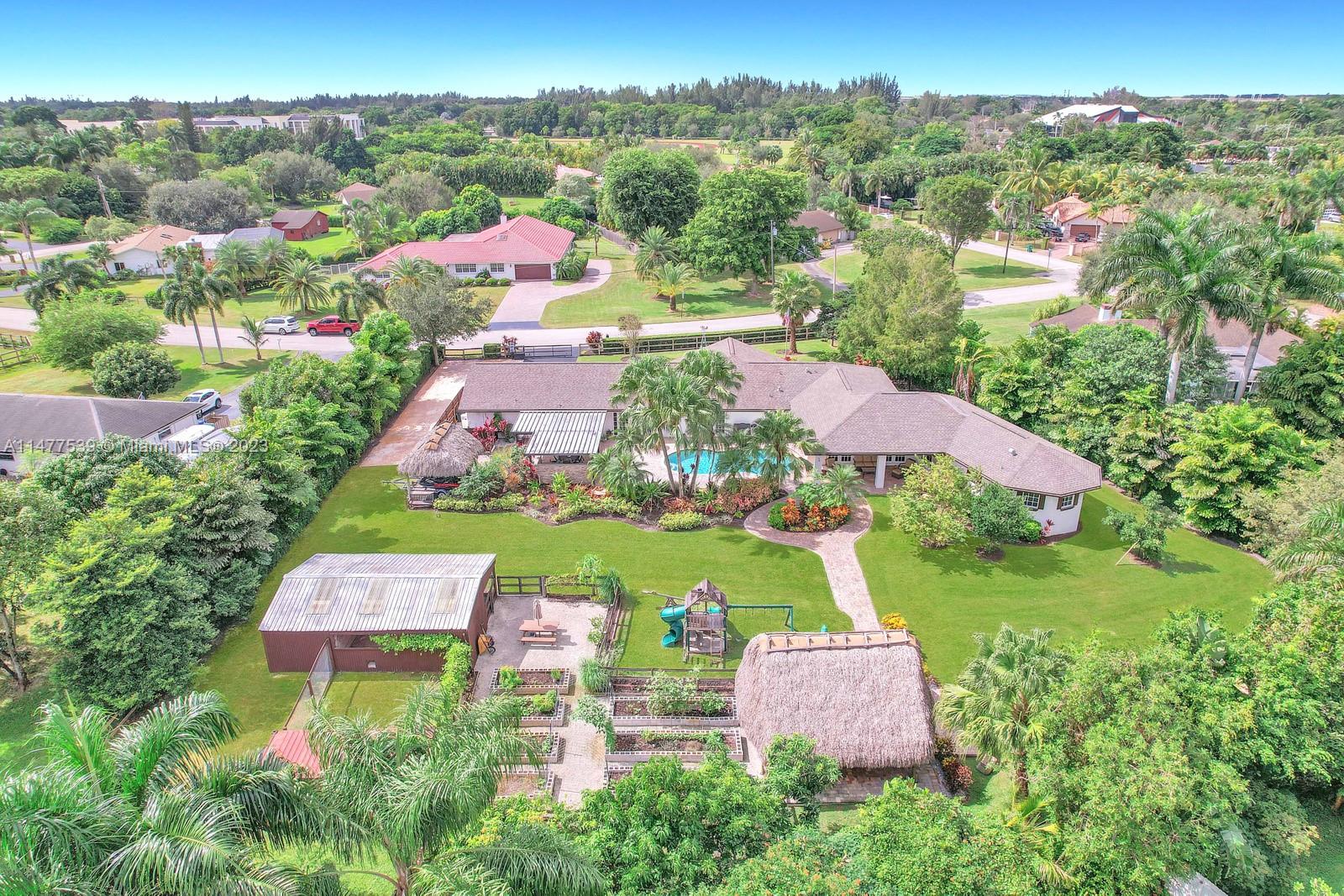 YOUR VERY OWN SOUTHWEST RANCHES PRIVATE RETREAT AWAITS! GORGEOUS HOME FEATURING CHEF'S KITCHEN W ISLAND, STAINLESS APPLIANCES, VIKING FRIDGE, BOSCH COOKTOP, OVEN & WARMING DRAWER, MIELE COFFEE MAKER, WOOD CABINETS IN KITCHEN & BEAUTIFUL WET BAR; HIGH CEILINGS W ELEGANT BEAMS, ROMANTIC WOOD BURNING FIREPLACE, MARBLE FLOORS. GRAND PRIMARY SUITE W 2 CLOSETS, SPA-LIKE BATH W 2 VANITIES, JETTED TUB & WALK-IN SHOWER. SOLID DOORS INSIDE, IMPACT WINDOWS & GARAGE DOORS. PERFECT HOME TO ENTERTAIN, THERE IS SOMETHING FUN FOR ALL AGES. OUTDOOR FULLY EQUIPPED KITCHEN W ICEMAKER, FREEZER, STAINLESS BBQ & DRAWERS, REFRESHING POOL, PLAYGROUND, 2 CHICKEE HUTS W PAVER FLOORS, SEVERAL VARIETIES OF FRUIT TREES, VEGETABLE GARDEN & CHICKEN COOP. PARK 10+ CARS BETWEEN GARAGE & DRIVEWAYS + ROOM FOR RV PARKING.