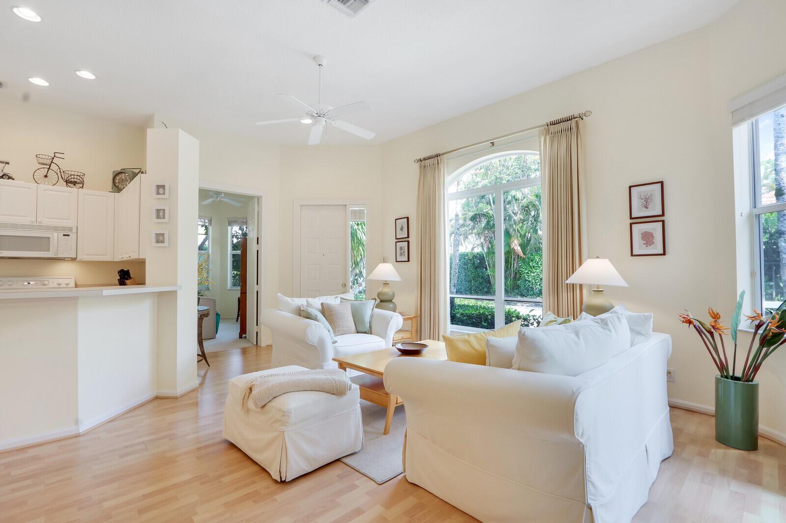 This charming 2 bedroom and den townhouse is located in Larkspur Landing, a subdivision of The Ibis Golf and Country Club, home to 3 championship Jack Nicklaus and family designed golf courses. This well designed home offers an open living concept bringing the beautiful outdoors inside through the screened and paver tiled patio for a true Florida lifestyle. Larkspur Landing is only one of 4 subdivisions in Ibis with a private gorgeous pool and spa for community members only. The pool is just steps away from this darling home. The roof was replaced in 2018, A/C 2021 and hurricane protection is available with a complete set of panels. The open floor plan concept allows for several sitting areas, and for privacy, there is a den which CON'T