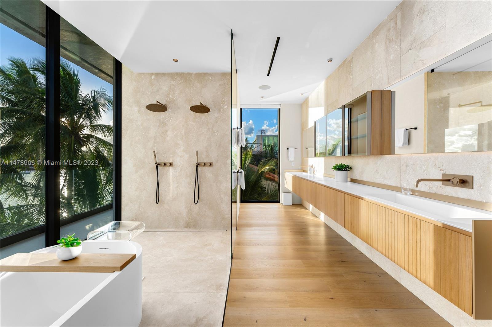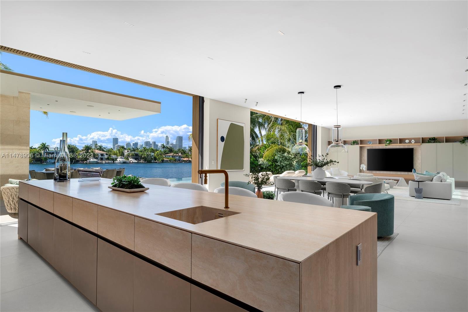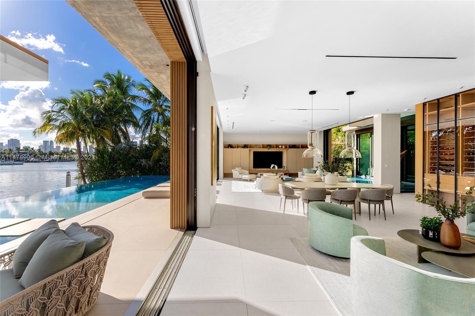 This 2-story, Ralph Choeff designed waterfront estate on guard-gated Hibiscus Island truly epitomizes luxury living in Miami Beach. Property boasts 7BR/7+1BA, sitting on a meticulously landscaped 15,750 SF lot, w/panoramic vistas of the iconic Miami skyline. Inside, the residence showcases impeccable interior design, soaring ceilings, & floor-to-ceiling telescoping glass doors that flood serene natural light while bringing the outdoors in. The expansive Great Room seamlessly integrates a family/media room, dining area, & chef's kitchen, all w/captivating water views. The 2nd story principal suite offers a terrace overlooking the waterway with city views and a beautiful plunge pool/spa. Outdoor spaces are a tropical oasis w/infinity pool, private dock for large vessels & easy ocean access.