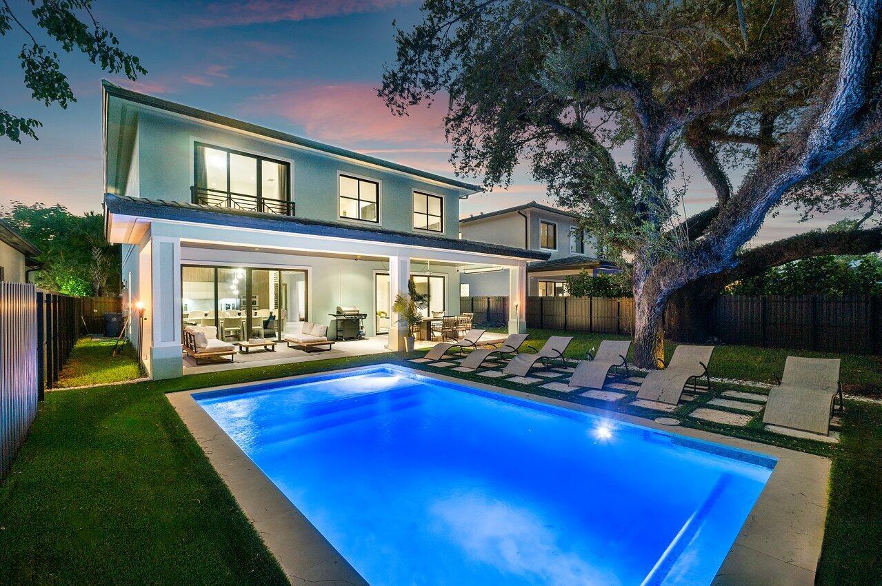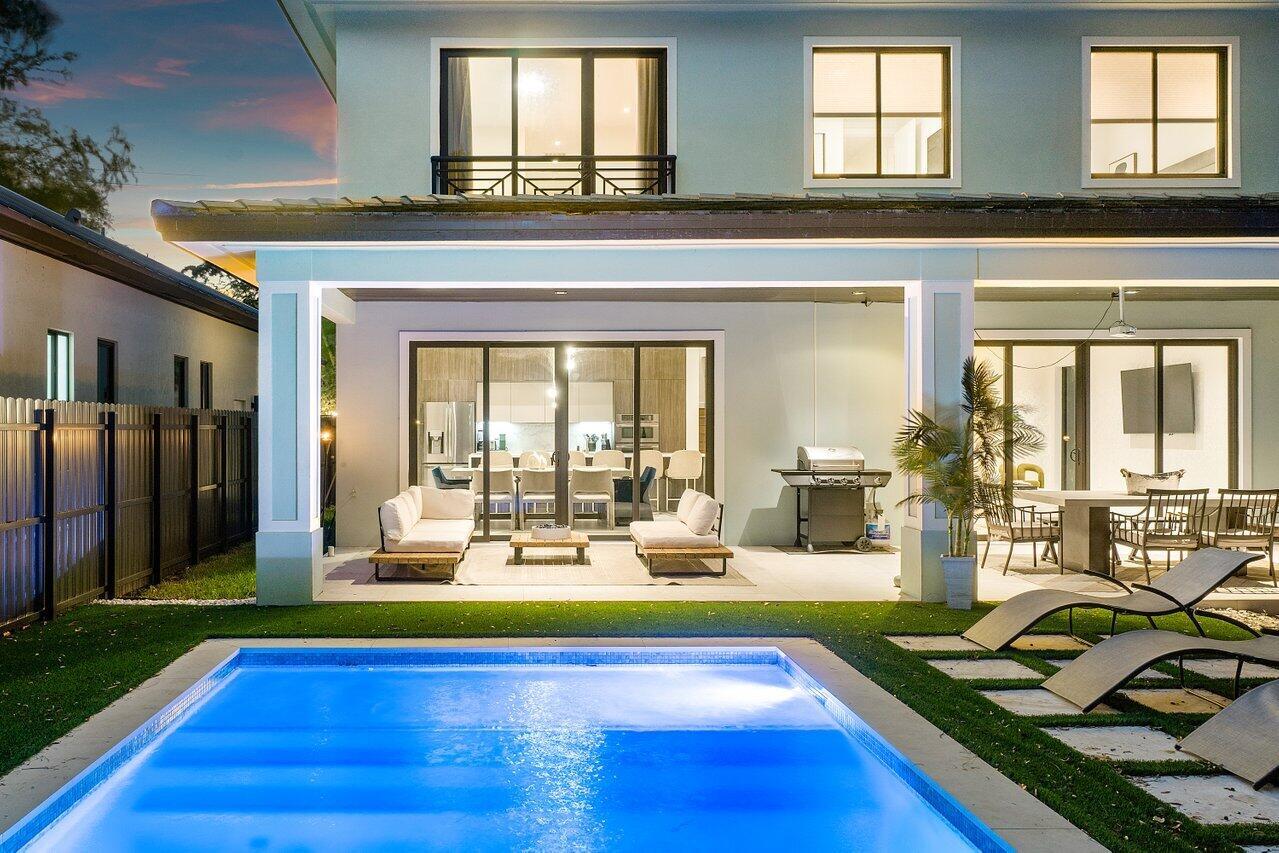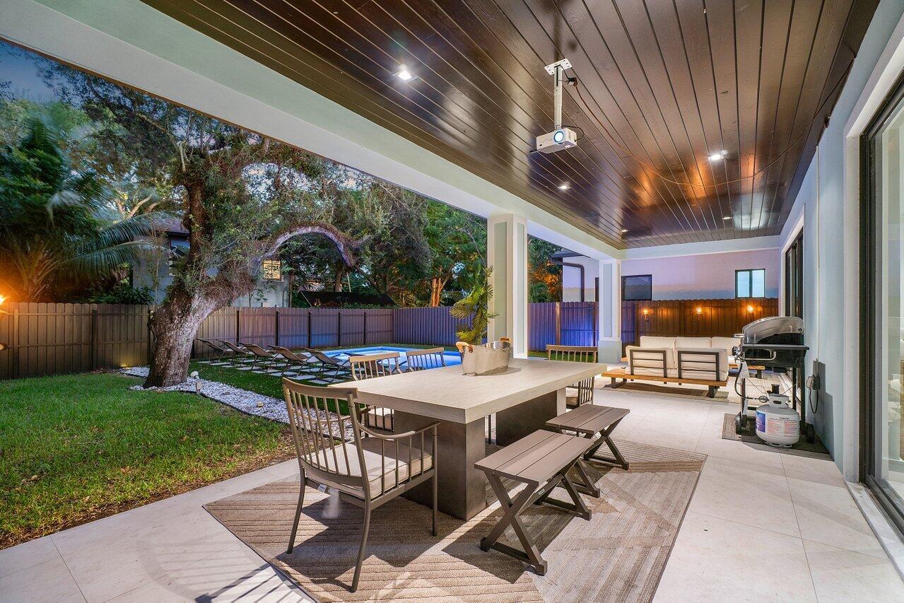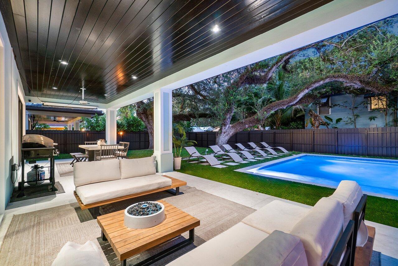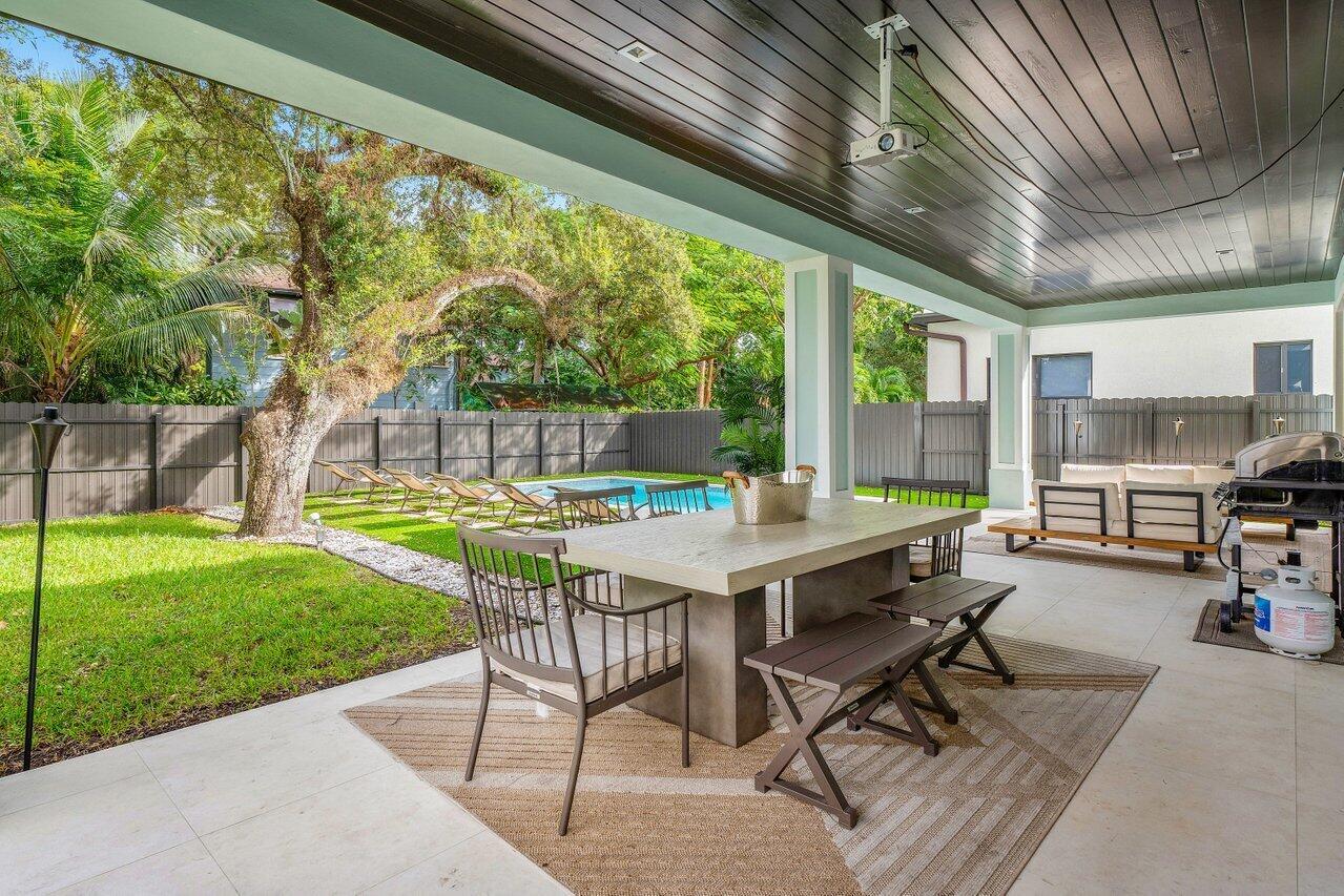 Indulge in the epitome of luxury living at this meticulously designed, fully-furnished residence in Fort Lauderdale's Riverside. Spanning 4 generous bedrooms + first floor office/den/5th bedroom, this home offers an abundance of space for both relaxation and entertainment. The gourmet Italkraft kitchen with marble countertops, soft close cabinets and drawers, and waterfall edge island as well as stainless steel appliances make this a chef's dream. Step outside to discover an enchanting outdoor theater, where evenings come alive with cinematic magic. The expansive backyard invites you to bask in the Florida sun, or relax under the covered patio equipped with summer kitchen connection, while the heated swimming pool offers year-round aquatic indulgence.