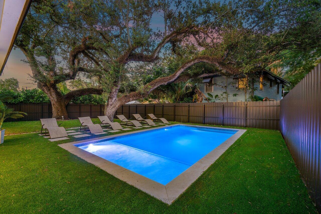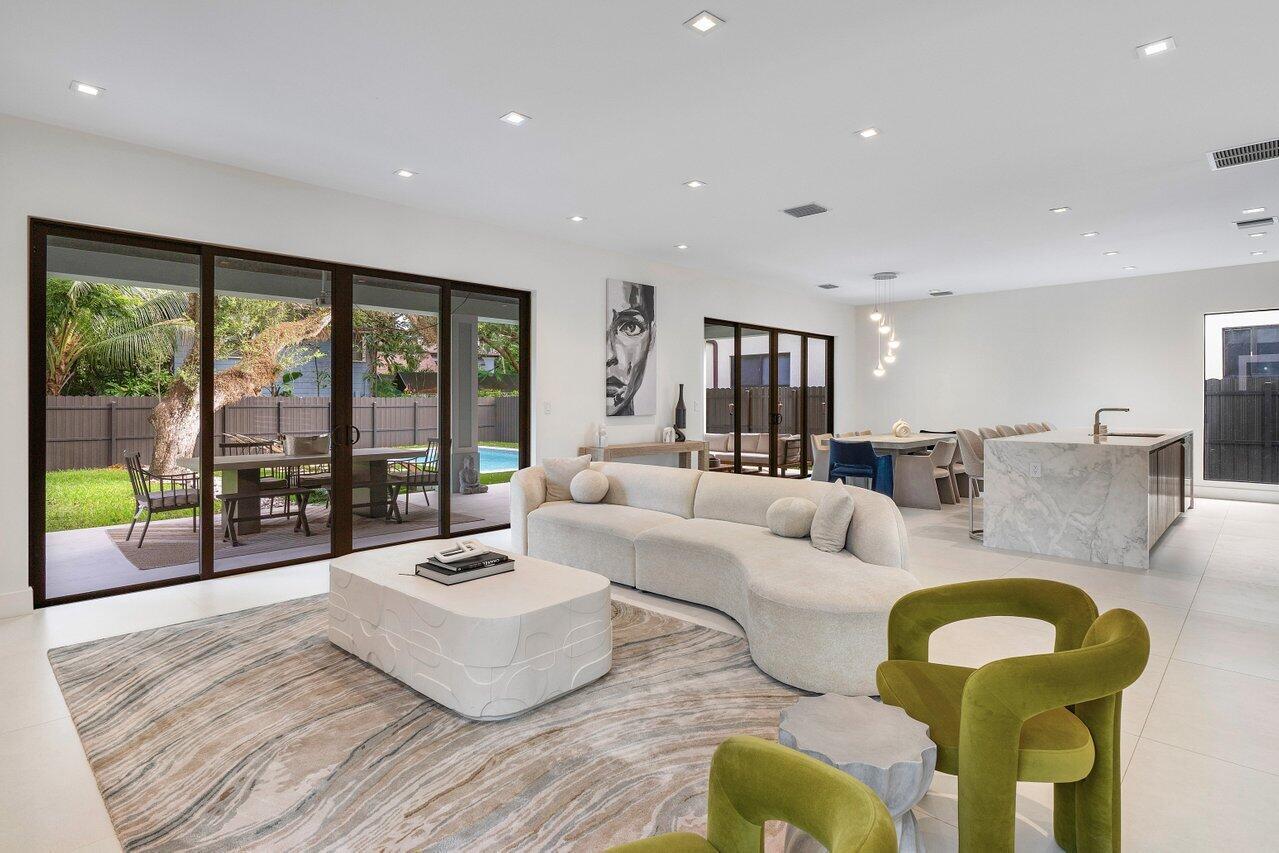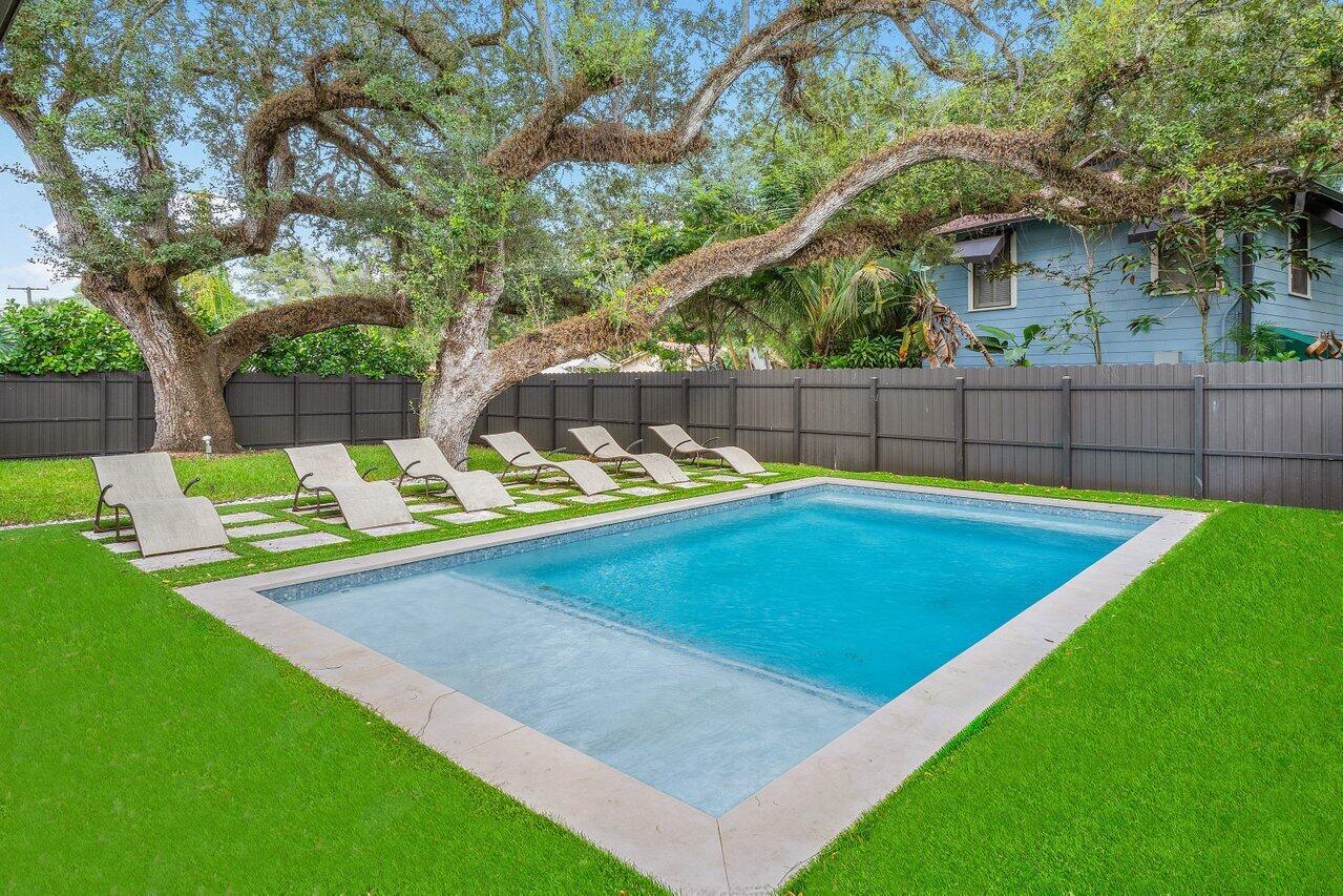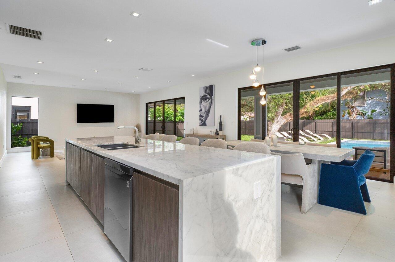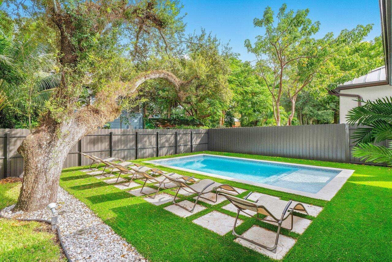Indulge in the epitome of luxury living at this meticulously designed, fully-furnished residence in Fort Lauderdale's Riverside. Spanning 4 generous bedrooms + first floor office/den/5th bedroom, this home offers an abundance of space for both relaxation and entertainment. The gourmet Italkraft kitchen with marble countertops, soft close cabinets and drawers, and waterfall edge island as well as stainless steel appliances make this a chef's dream. Step outside to discover an enchanting outdoor theater, where evenings come alive with cinematic magic. The expansive backyard invites you to bask in the Florida sun, or relax under the covered patio equipped with summer kitchen connection, while the heated swimming pool offers year-round aquatic indulgence.