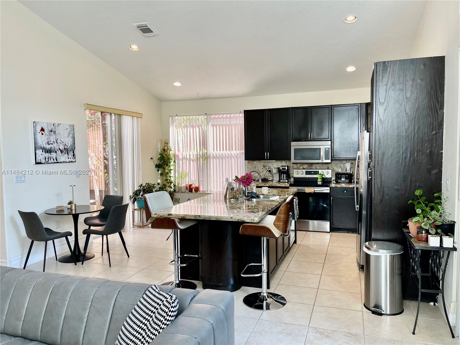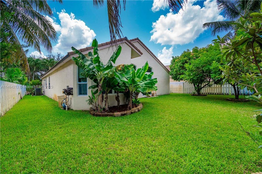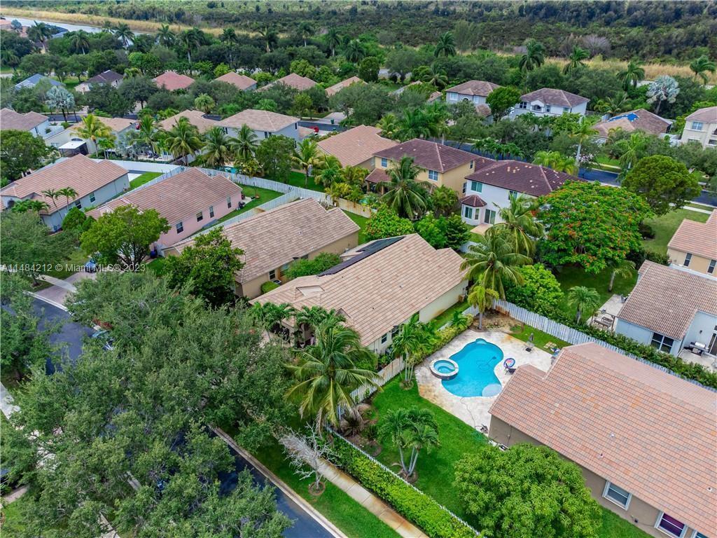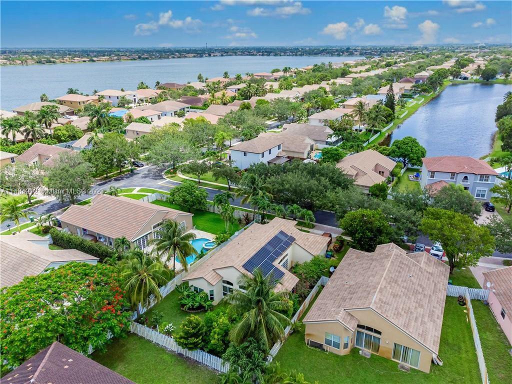 This lovely home offers great open living space w/ vaulted ceilings that provides light airy feel, nice natural light. Family room-kitchen with stainless steel appliances and cooking island. Grand primary suite w/ private bathroom, 2 car garage, half bathroom for guests, impact windows, *SOLAR PANELS* & more! Perfect backyard for gardening and enjoying the beautiful sunny south Florida weather! Located in a gated community that covers basic cable. 5 star Amenities w/ Resort style heated pool, full professional gym, children's playground, volleyball court, tennis courts, basketball court. Just minutes away from Sunset Lakes Elementary, shopping and restaurants. Windows are impact, French doors & sliders are not and have shutters. Roof is original. Don't let this opportunity pass you by!