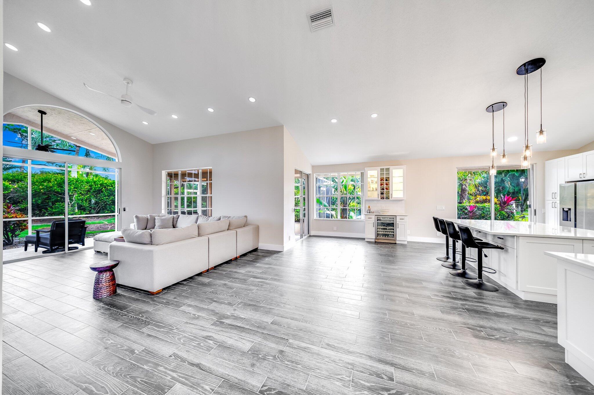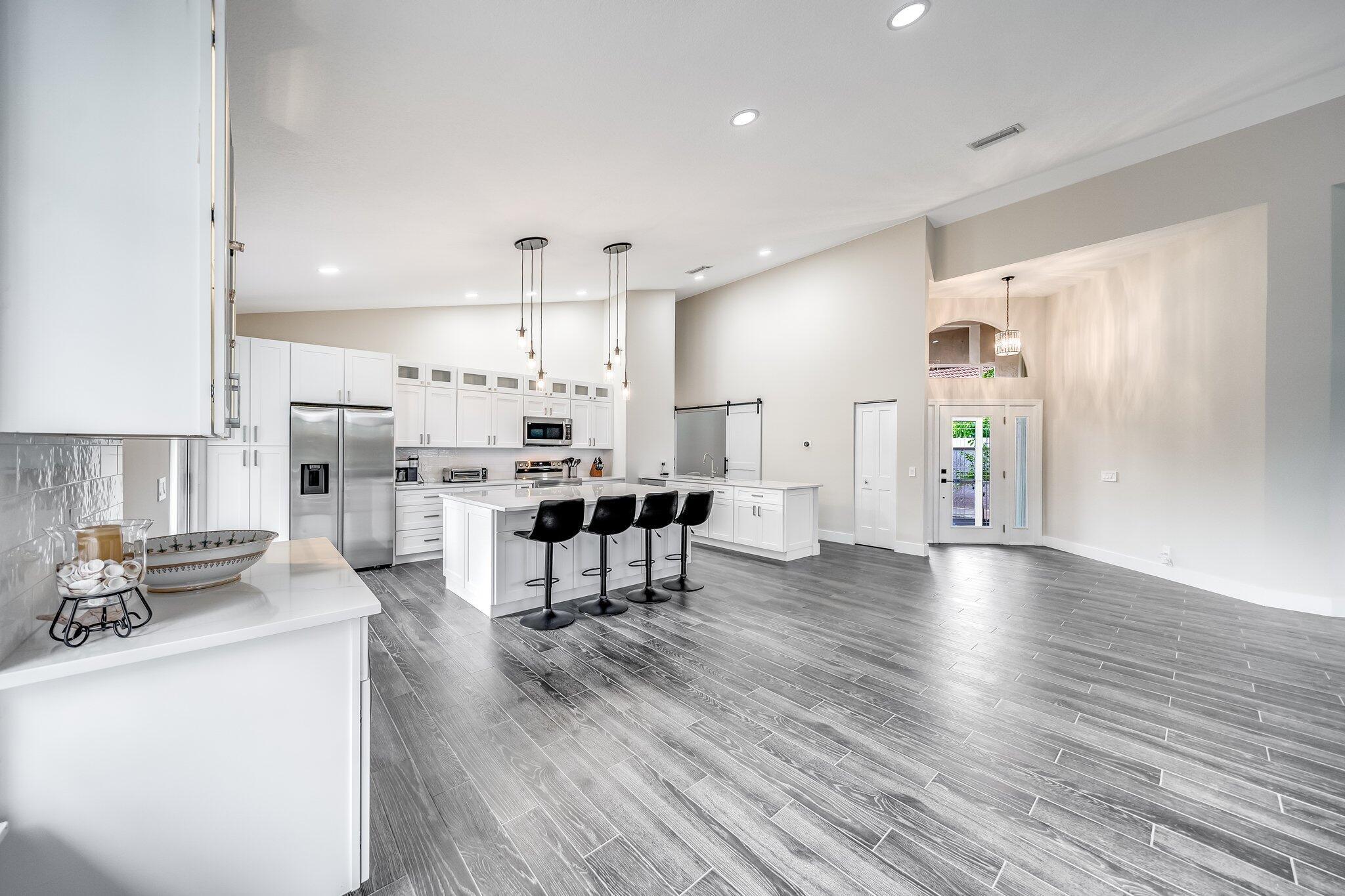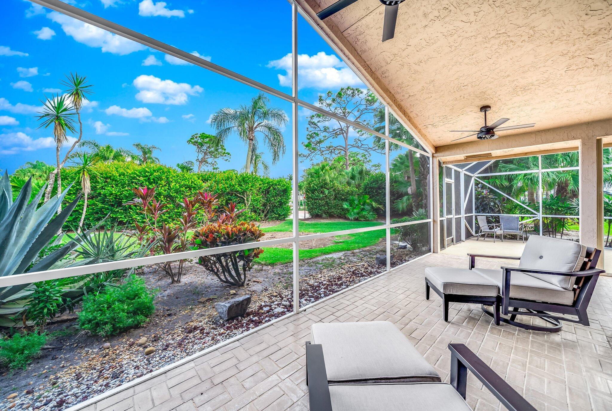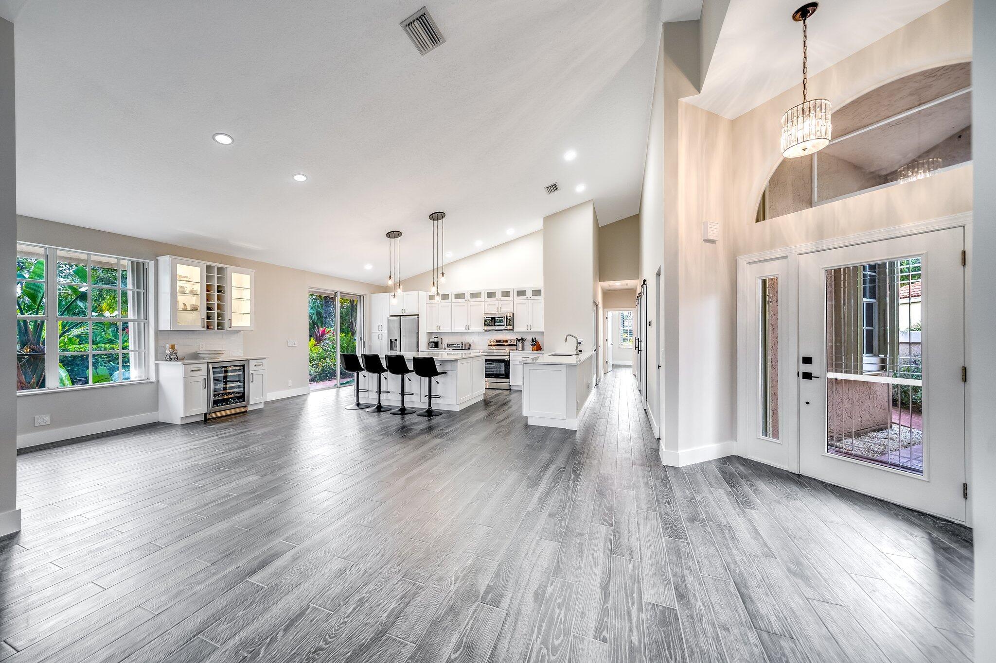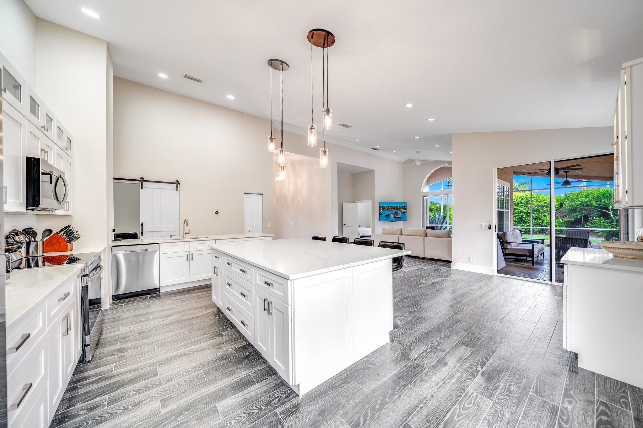 Nestled in the heart of Palm Beach Gardens, within the highly desirable Golf and Country Club Community of Eastpointe, this fully renovated 3 bedroom, 2 full bath property is move-in ready! Remodeled in 2023, it features a bright open spacious living area boasting high ceilings, the gourmet kitchen features a beautiful island, stainless steel appliances and separate bar area. Multiple sliders leading to the screened lanai extend the living area to the outdoors. The wrap around patio, which can be accessed from the kitchen, living room and primary bedroom, is surrounded by lush landscaping and offers plenty of room to relax in privacy and enjoy the fresh air. The primary bedroom boasts high ceilings, a large custom designed walk-in-closet & a brand new luxurious en-suite (cont.)