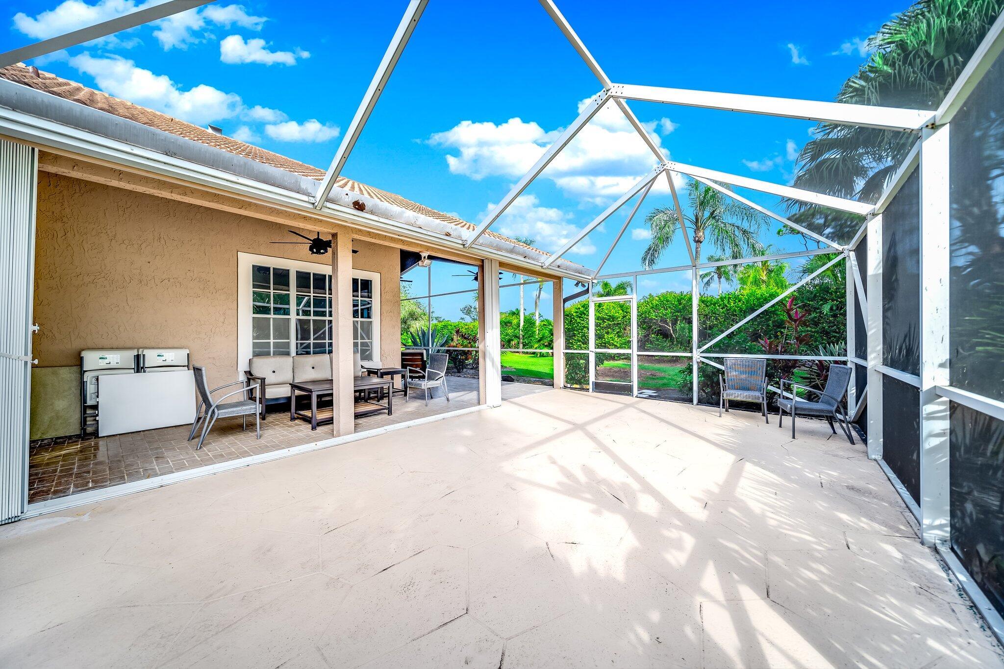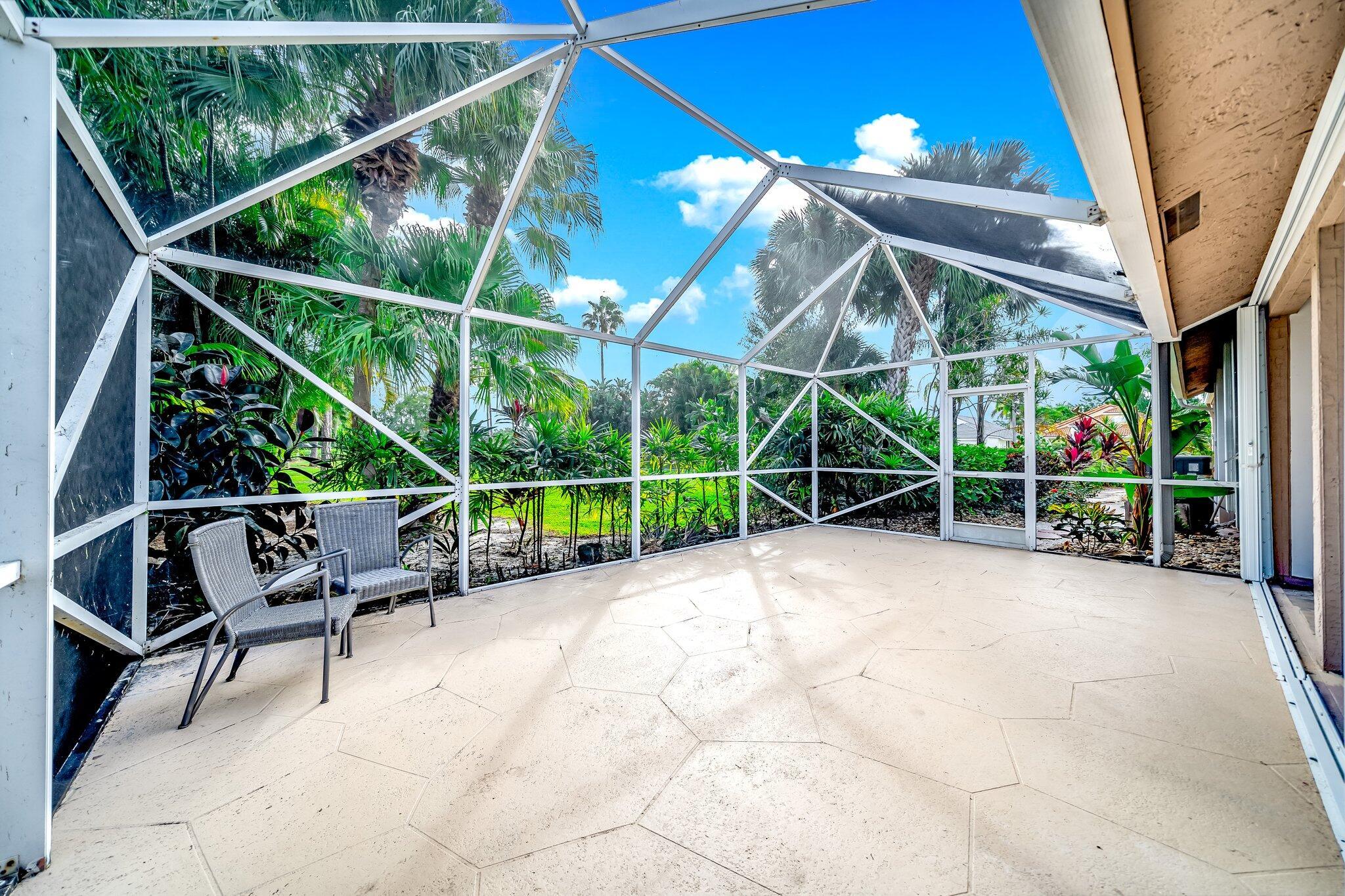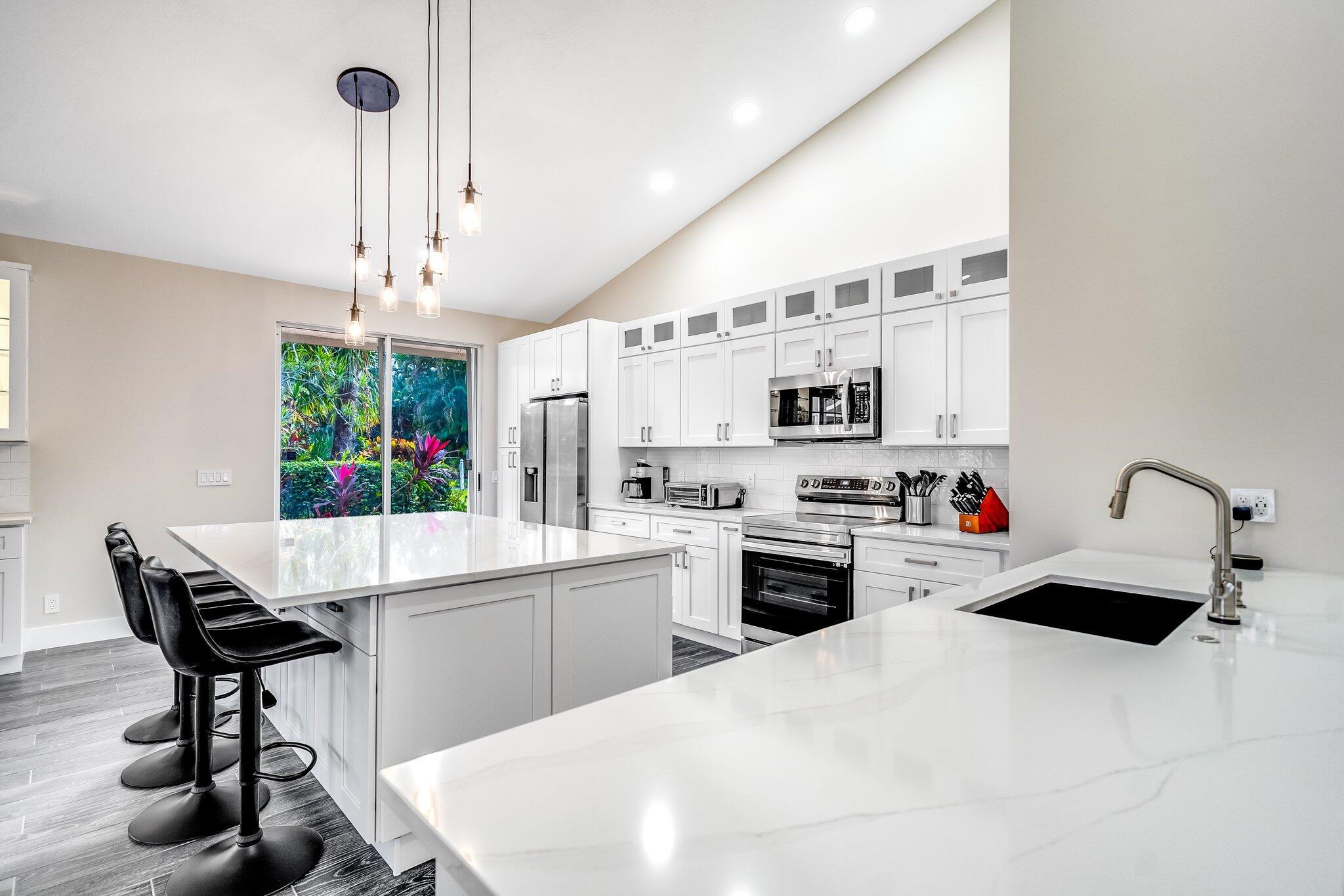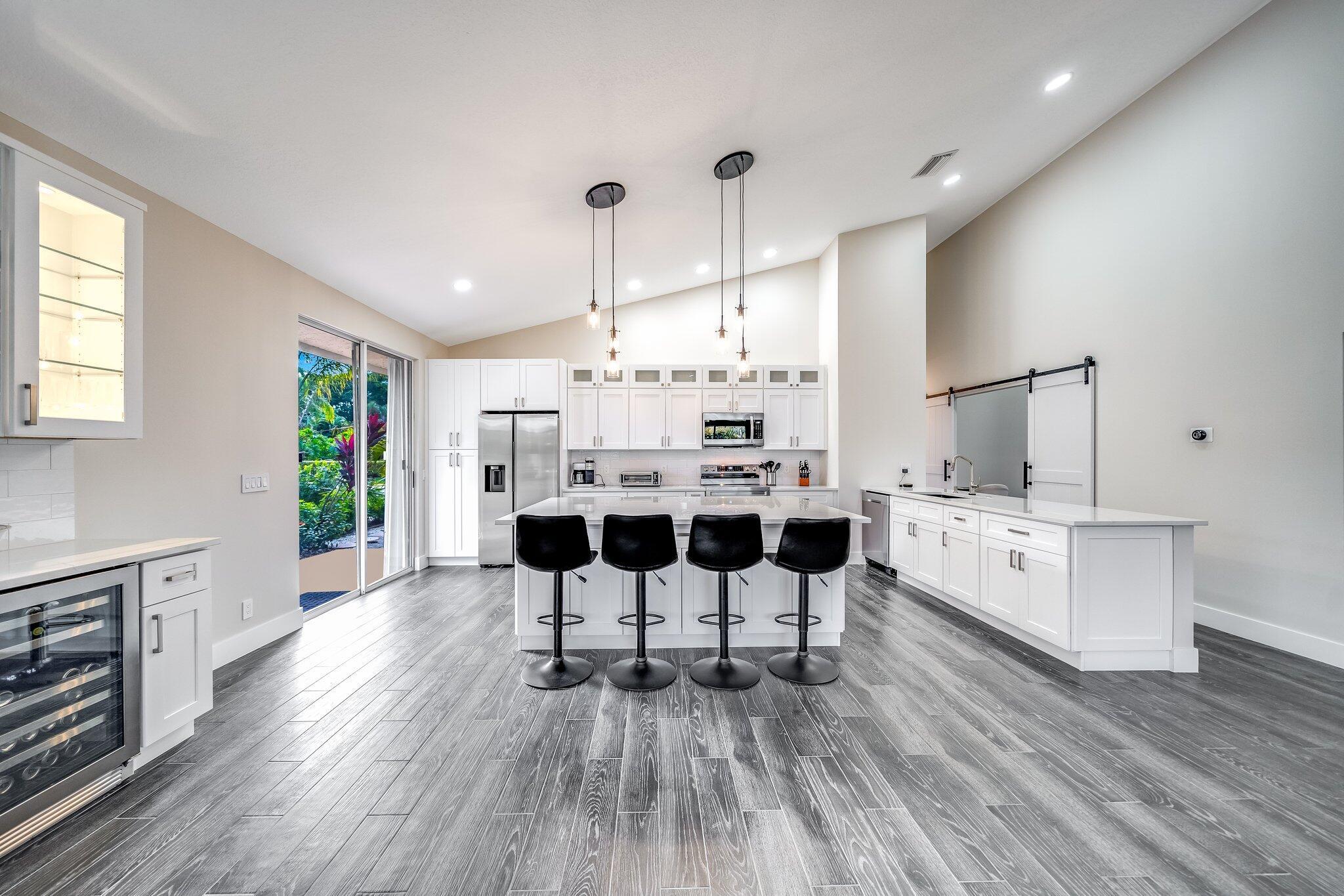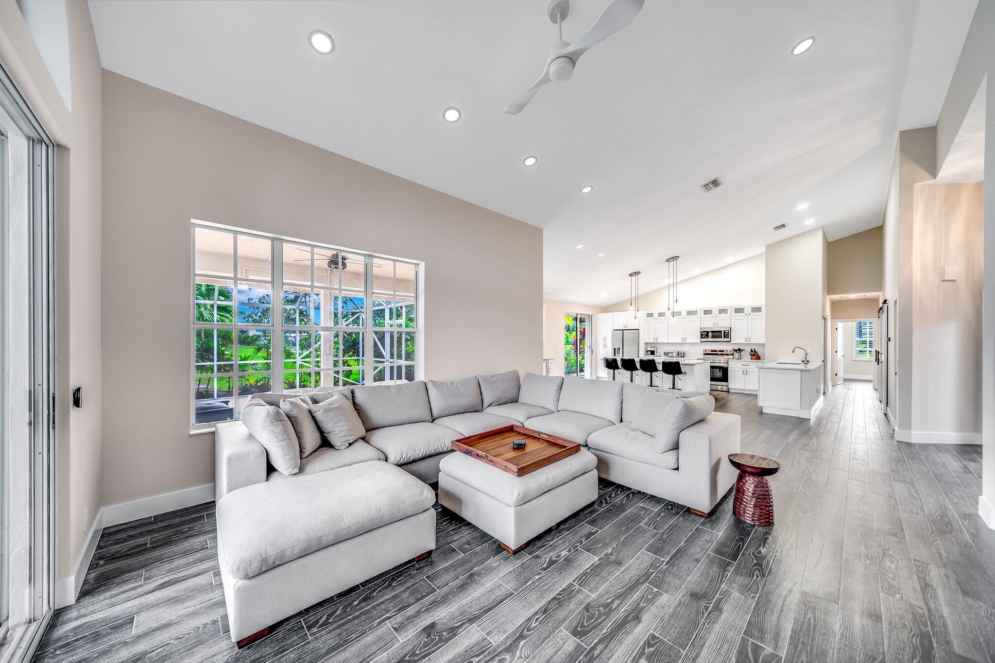 Nestled in the heart of Palm Beach Gardens, within the highly desirable Golf and Country Club Community of Eastpointe, this fully renovated 3 bedroom, 2 full bath property is move-in ready! Remodeled in 2023, it features a bright open spacious living area boasting high ceilings, the gourmet kitchen features a beautiful island, stainless steel appliances and separate bar area. Multiple sliders leading to the screened lanai extend the living area to the outdoors. The wrap around patio, which can be accessed from the kitchen, living room and primary bedroom, is surrounded by lush landscaping and offers plenty of room to relax in privacy and enjoy the fresh air. The primary bedroom boasts high ceilings, a large custom designed walk-in-closet & a brand new luxurious en-suite (cont.)