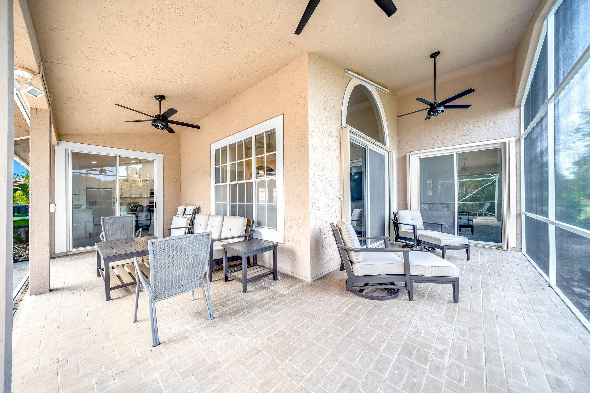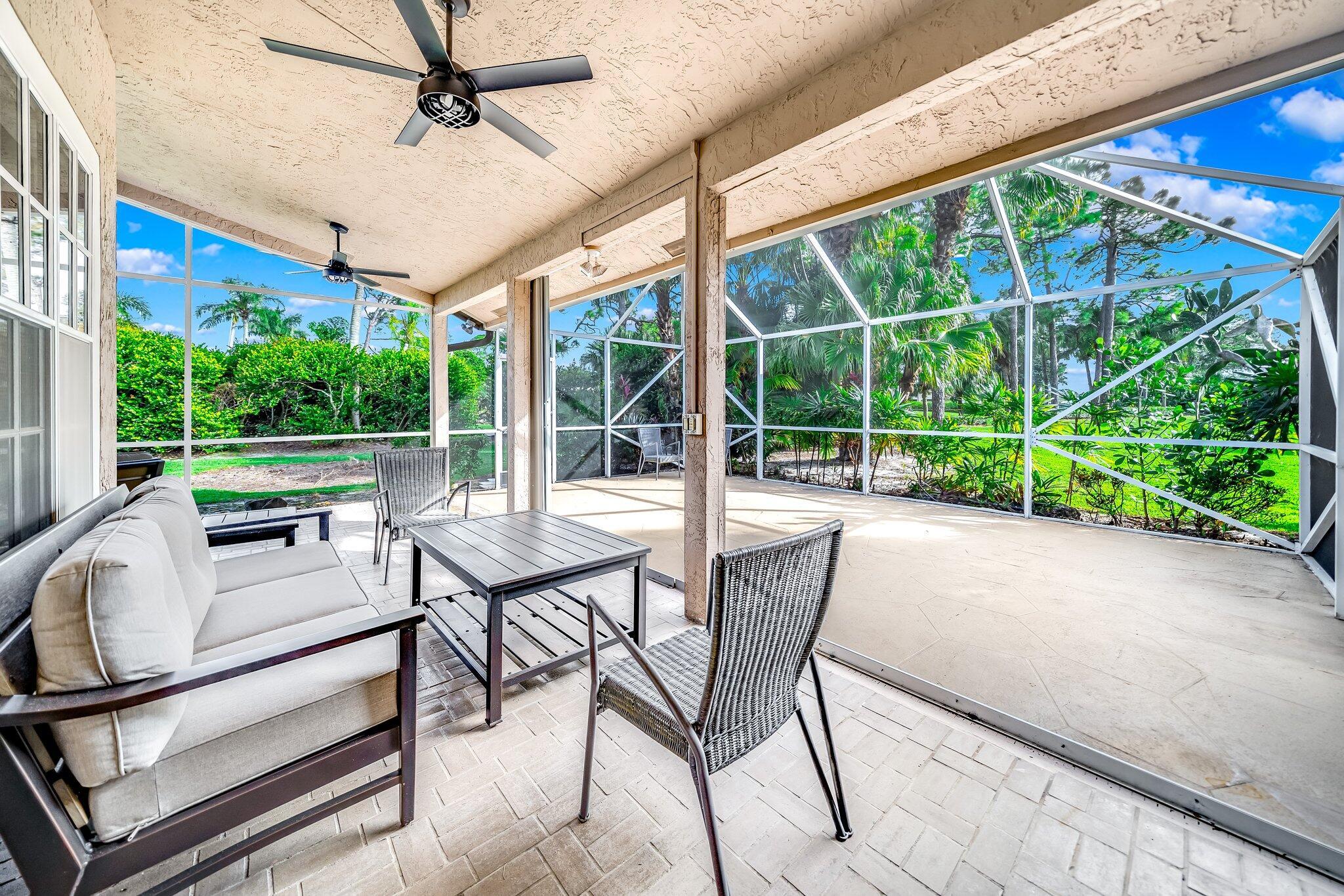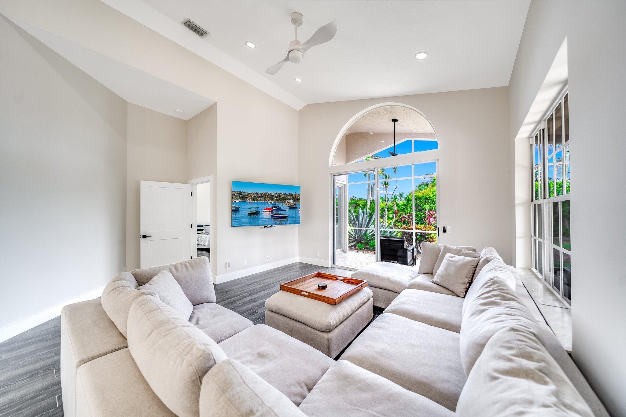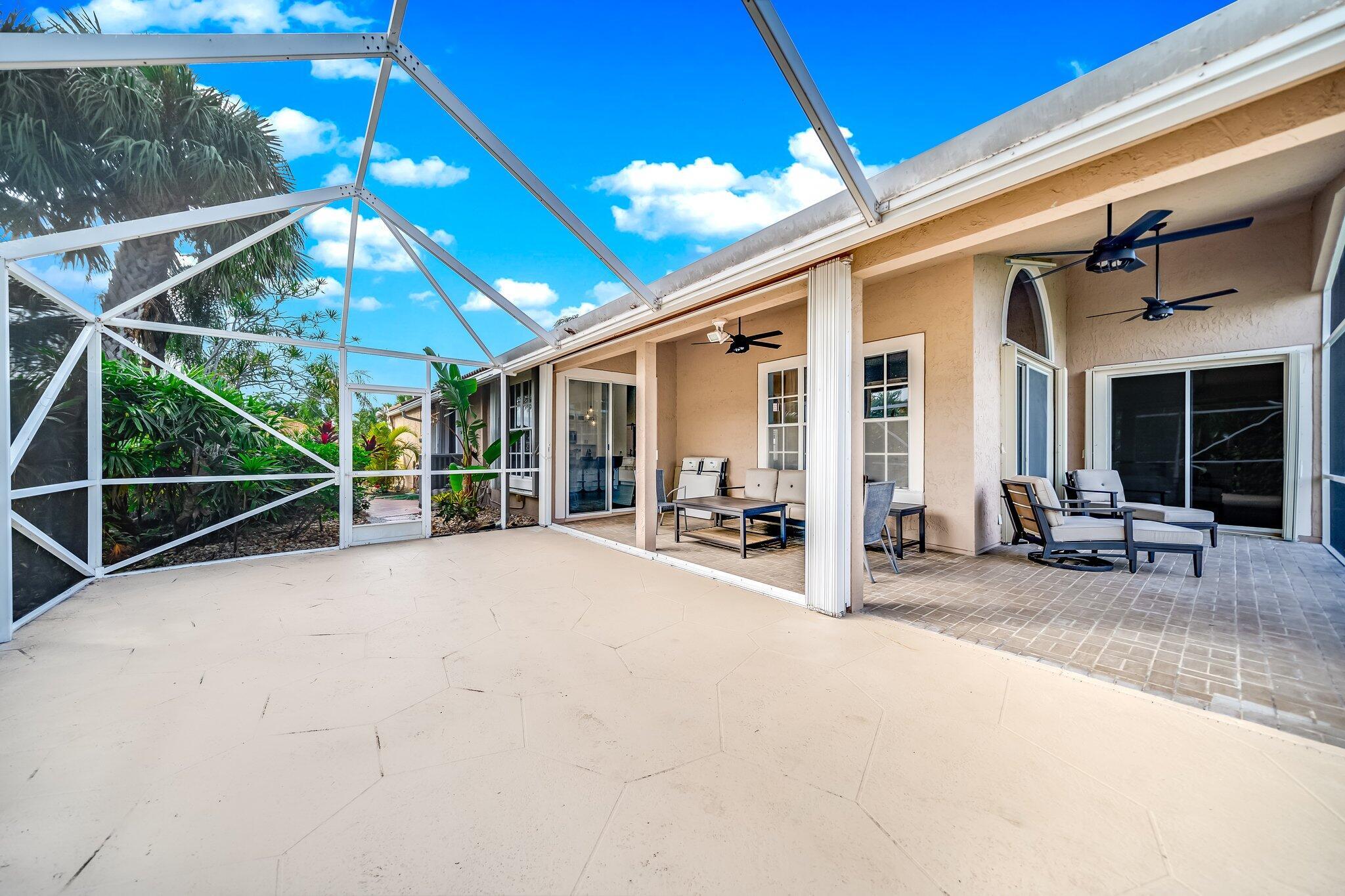 Nestled in the heart of Palm Beach Gardens, within the highly desirable Golf and Country Club Community of Eastpointe, this fully renovated 3 bedroom, 2 full bath property is move-in ready! Remodeled in 2023, it features a bright open spacious living area boasting high ceilings, the gourmet kitchen features a beautiful island, stainless steel appliances and separate bar area. Multiple sliders leading to the screened lanai extend the living area to the outdoors. The wrap around patio, which can be accessed from the kitchen, living room and primary bedroom, is surrounded by lush landscaping and offers plenty of room to relax in privacy and enjoy the fresh air. The primary bedroom boasts high ceilings, a large custom designed walk-in-closet & a brand new luxurious en-suite (cont.)