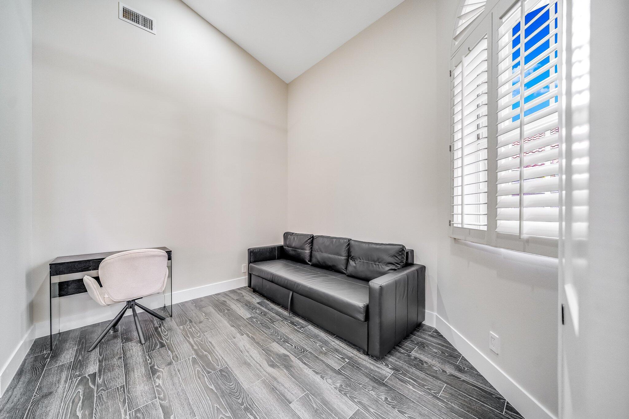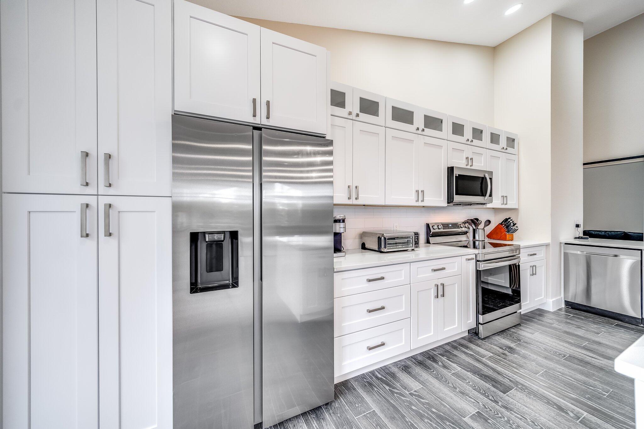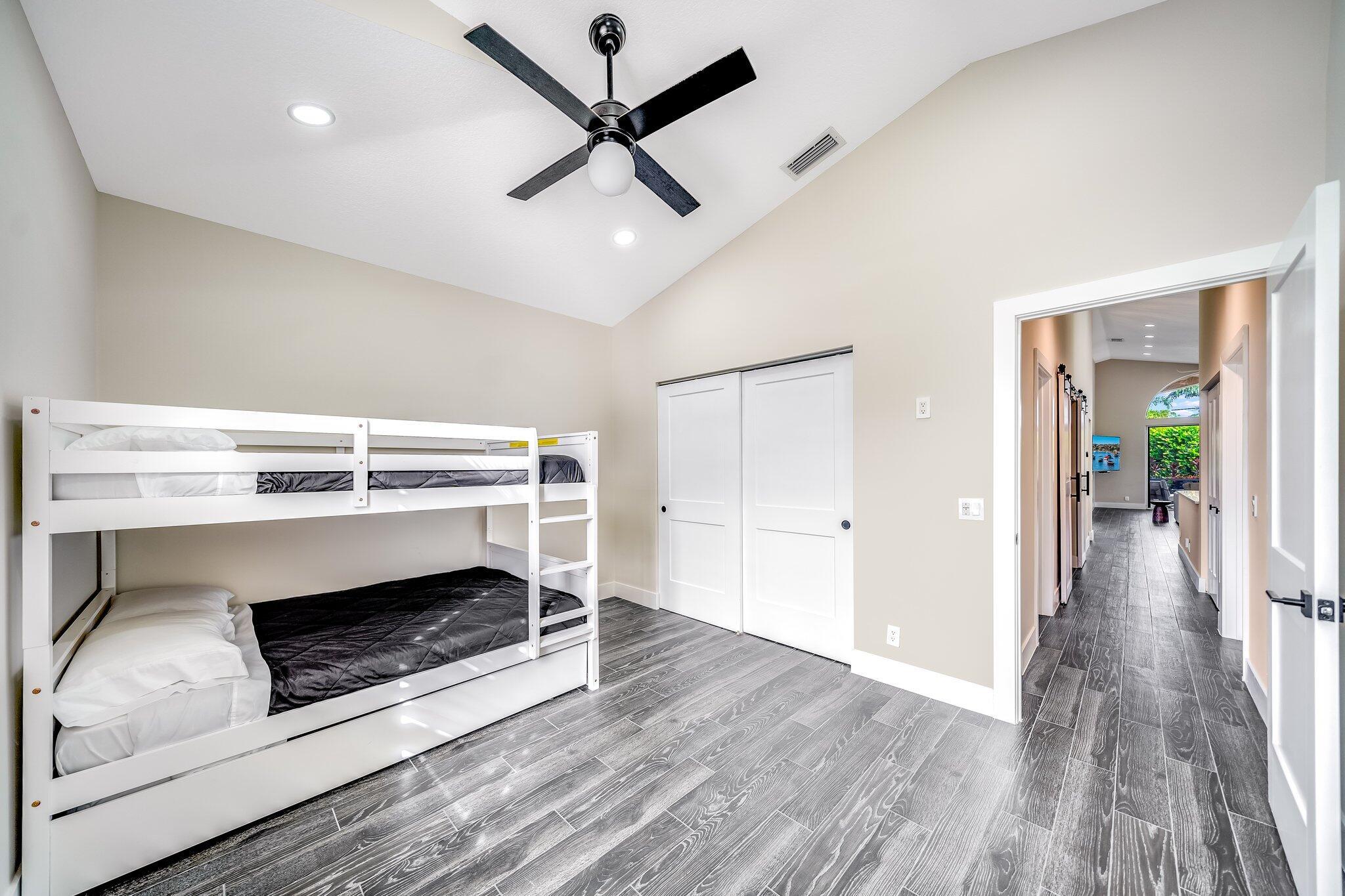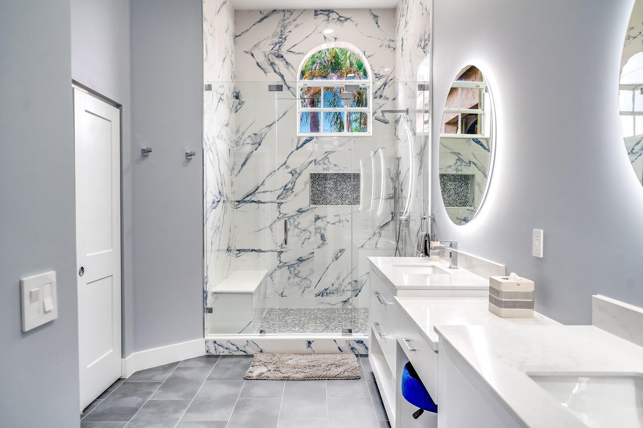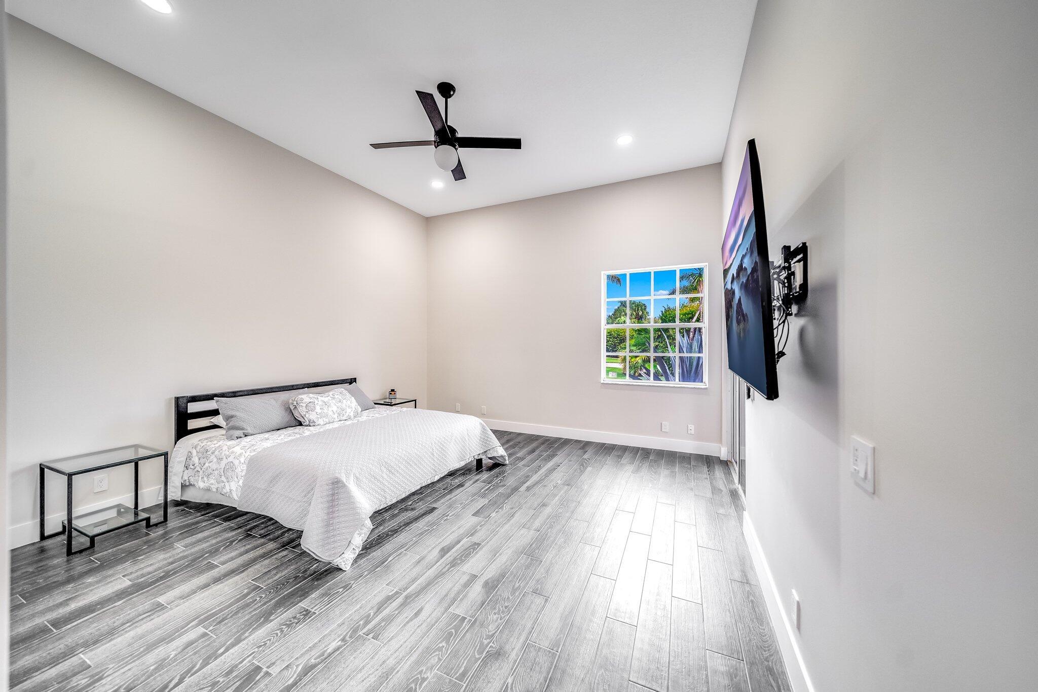 Nestled in the heart of Palm Beach Gardens, within the highly desirable Golf and Country Club Community of Eastpointe, this fully renovated 3 bedroom, 2 full bath property is move-in ready! Remodeled in 2023, it features a bright open spacious living area boasting high ceilings, the gourmet kitchen features a beautiful island, stainless steel appliances and separate bar area. Multiple sliders leading to the screened lanai extend the living area to the outdoors. The wrap around patio, which can be accessed from the kitchen, living room and primary bedroom, is surrounded by lush landscaping and offers plenty of room to relax in privacy and enjoy the fresh air. The primary bedroom boasts high ceilings, a large custom designed walk-in-closet & a brand new luxurious en-suite (cont.)