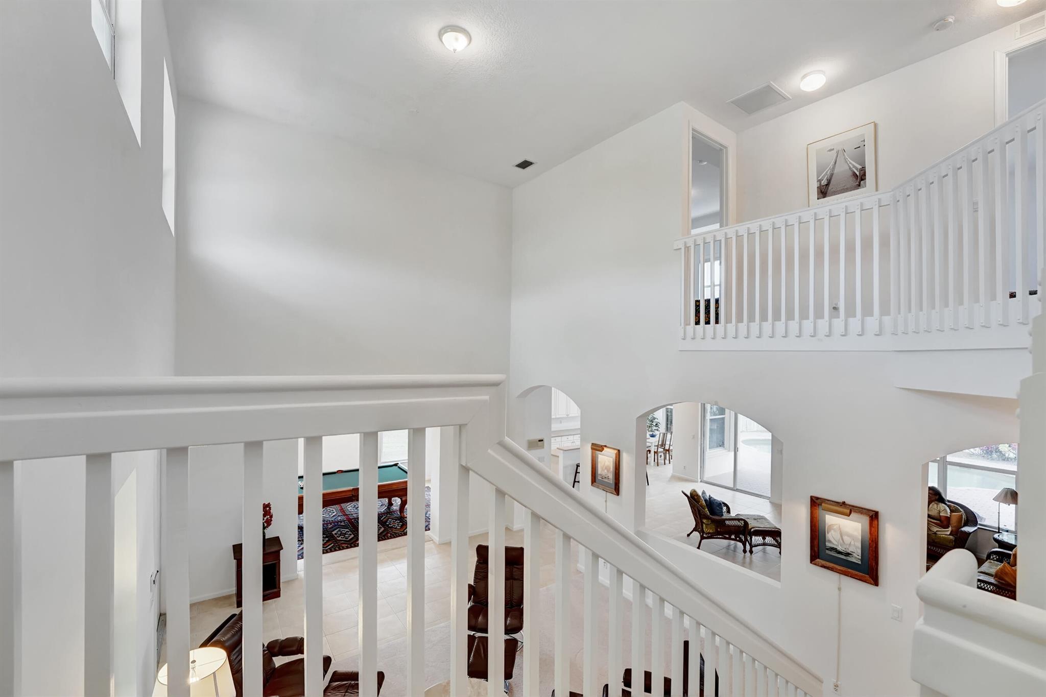 Welcome to the spacious and popular Oakley model, situated on one of the best premium lots with a lake view and a Mediterranean inspired pool. This 5-bedroom, 3-bathroom home with soaring ceilings has 1 bedroom and full cabana bathroom on the 1st floor. The home has been meticulously maintained, is move-in ready and showcases both casual and formal living with an eat-in kitchen which is open to the casual living area overlooking the lanai and pool. The kitchen is well appointed with extensive cabinetry, pantry and features granite countertops with a snack/breakfast bar. The upstairs primary suite overlooking the water is expansive with a seating/gym area off the bedroom and large walk-in closets. The Palm Beach Plantation community is