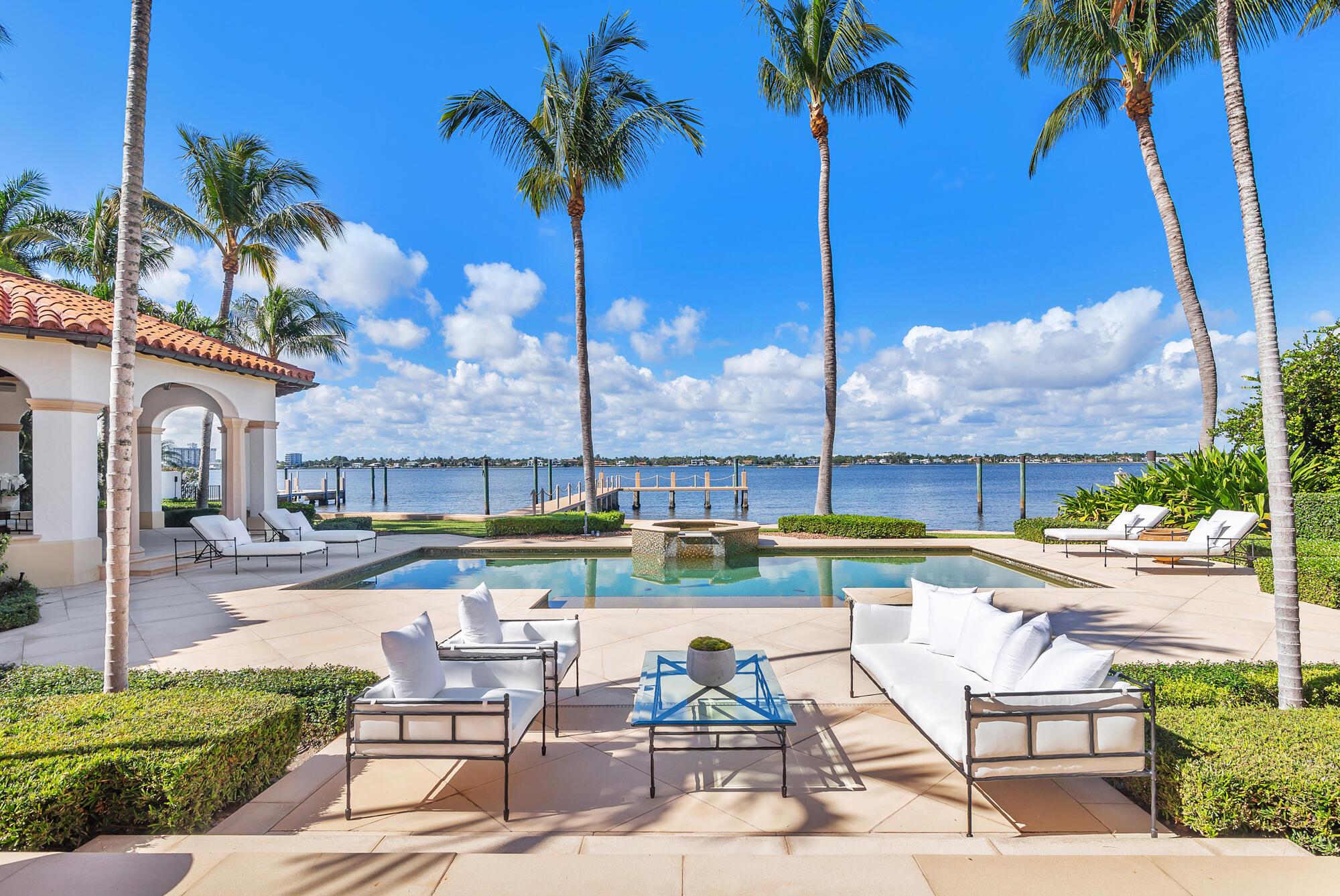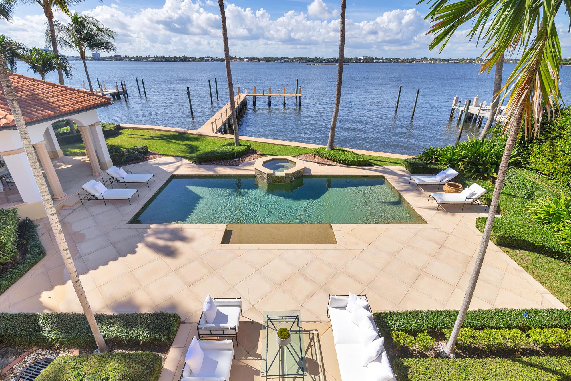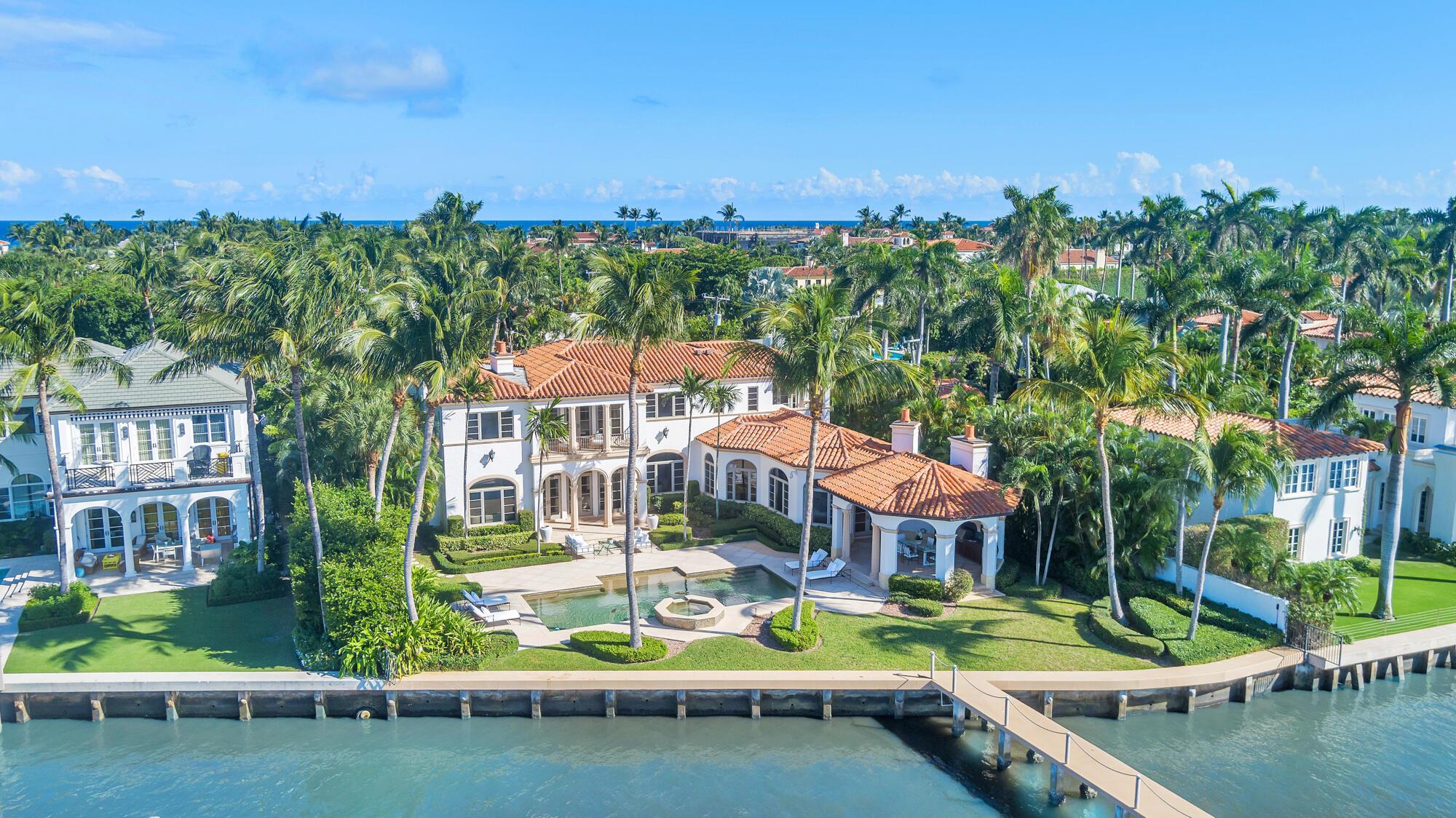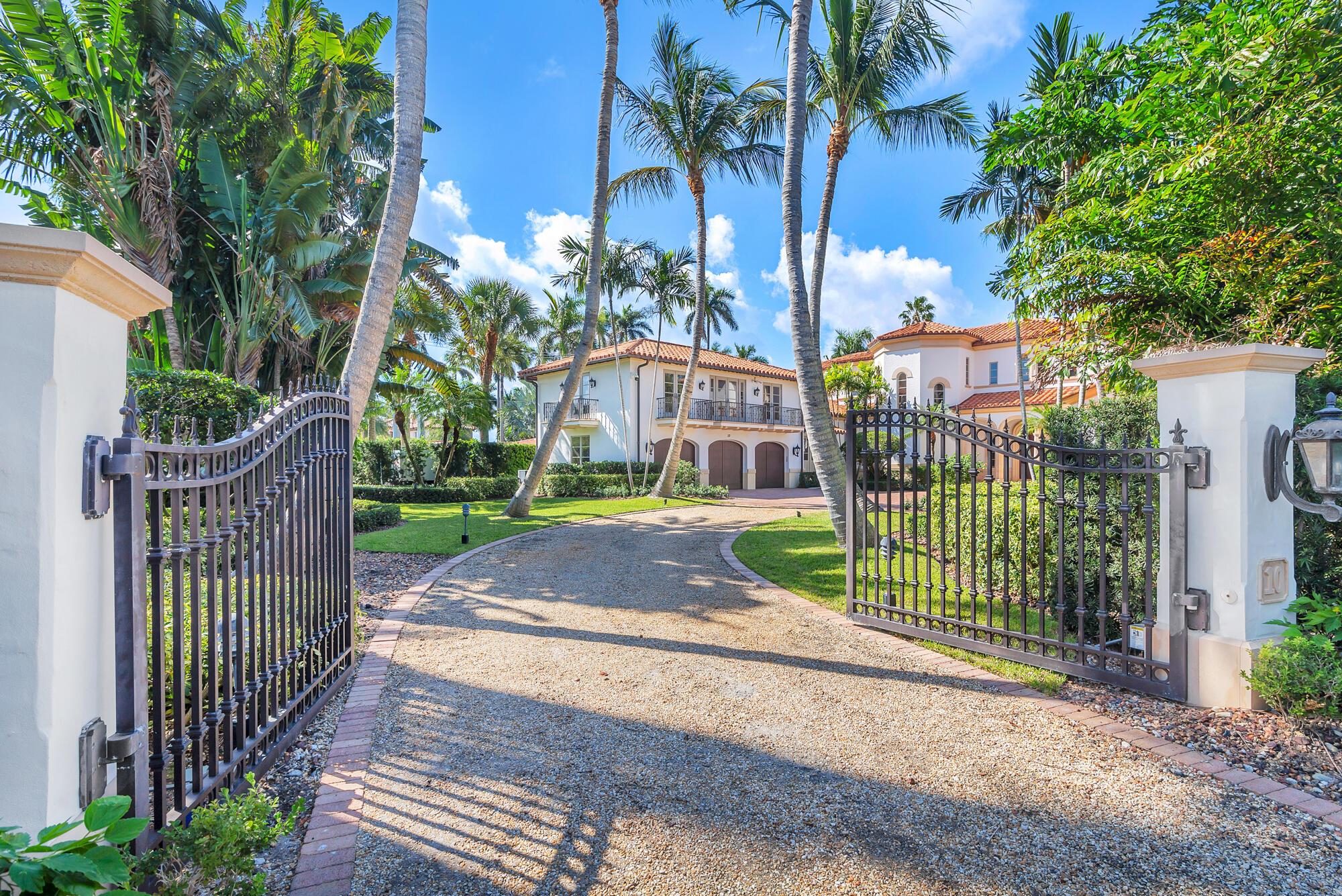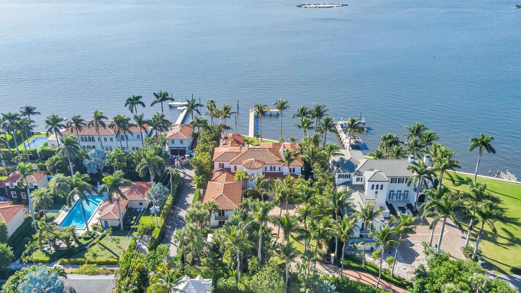 Water, Water Everywhere from the moment you walk in to this magnificent direct lakefront Mediterranean estate on over 2/3 of an acre located in the exclusive Estate Section of Palm Beach. Gated and lushly landscaped, the property is surrounded by mature foliage providing maximum privacy before opening up to 117' of commanding Intracoastal views. The gracious floor plan offers 5 bedrooms/7.5 baths and volume ceilings throughout. Highlights include luxurious second floor primary suite with private balcony and sitting room, chef's kitchen with butler's pantry, wood paneled library, oversized family room, wine cellar, media room, elevator, 100' x 40' concrete dock, full house generator and 3 car garage. Fabulous outdoor spaces with grand covered loggia ideal for dining and entertaining.