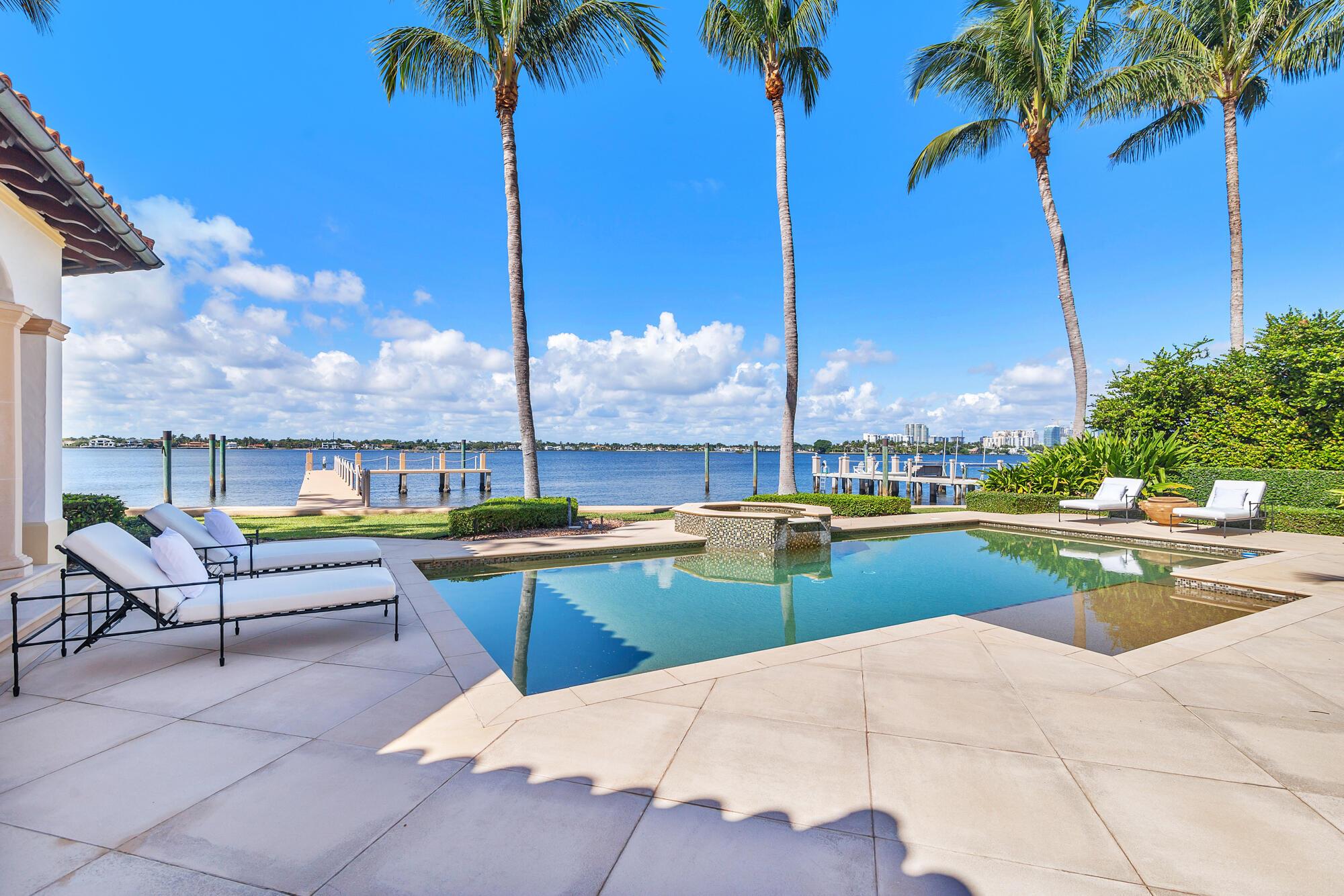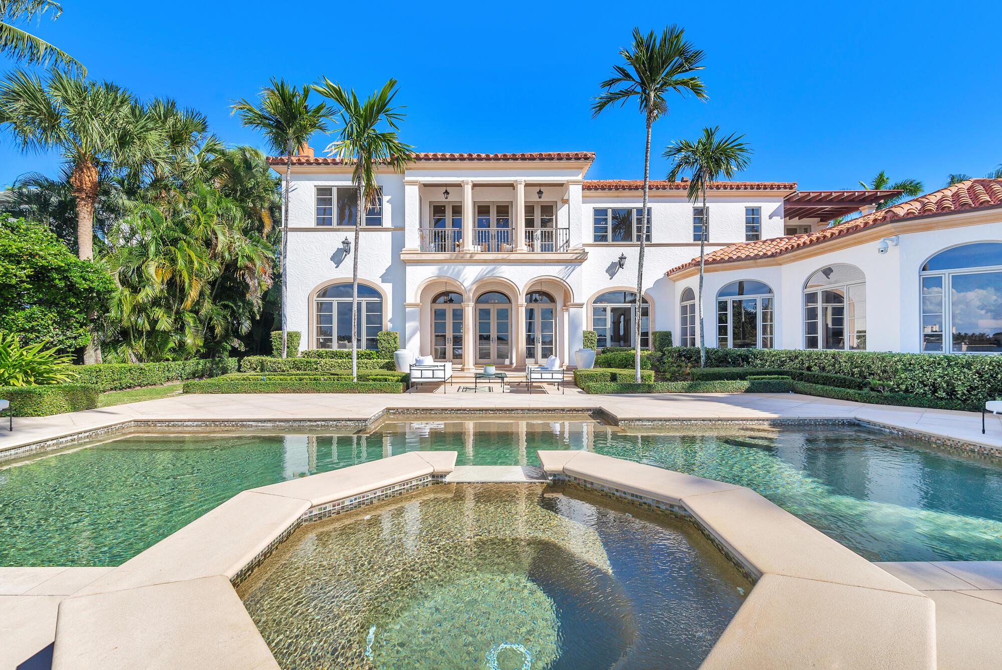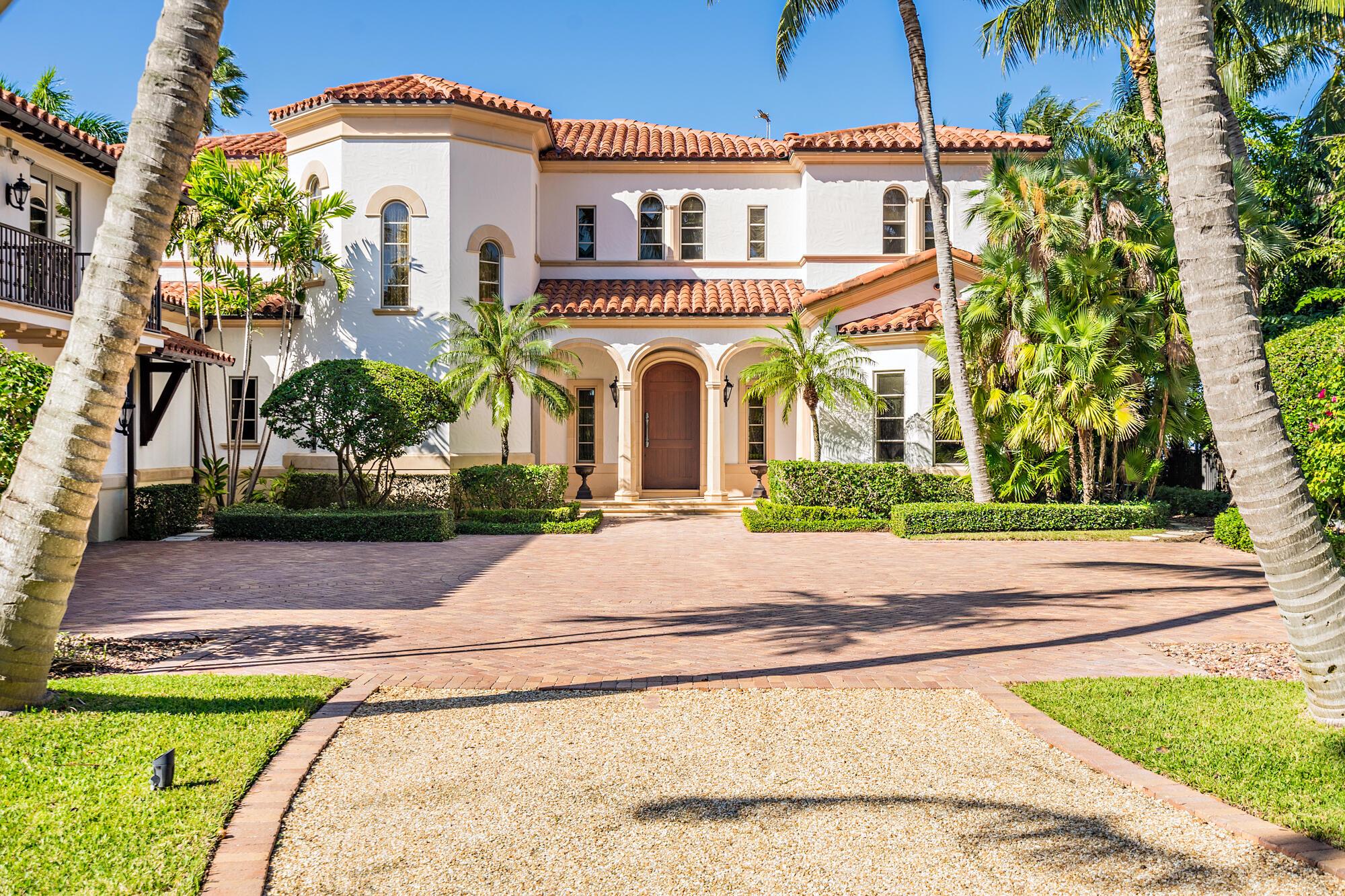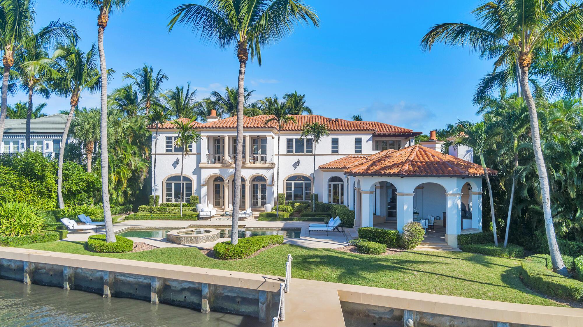 Water, Water Everywhere from the moment you walk in to this magnificent direct lakefront Mediterranean estate on over 2/3 of an acre located in the exclusive Estate Section of Palm Beach. Gated and lushly landscaped, the property is surrounded by mature foliage providing maximum privacy before opening up to 117' of commanding Intracoastal views. The gracious floor plan offers 5 bedrooms/7.5 baths and volume ceilings throughout. Highlights include luxurious second floor primary suite with private balcony and sitting room, chef's kitchen with butler's pantry, wood paneled library, oversized family room, wine cellar, media room, elevator, 100' x 40' concrete dock, full house generator and 3 car garage. Fabulous outdoor spaces with grand covered loggia ideal for dining and entertaining.
