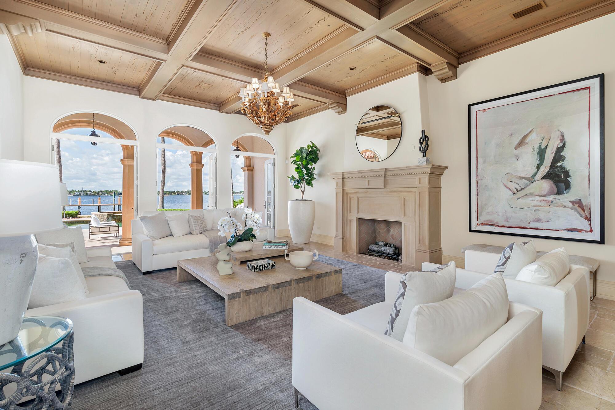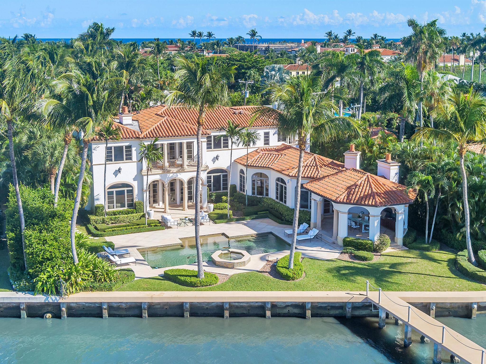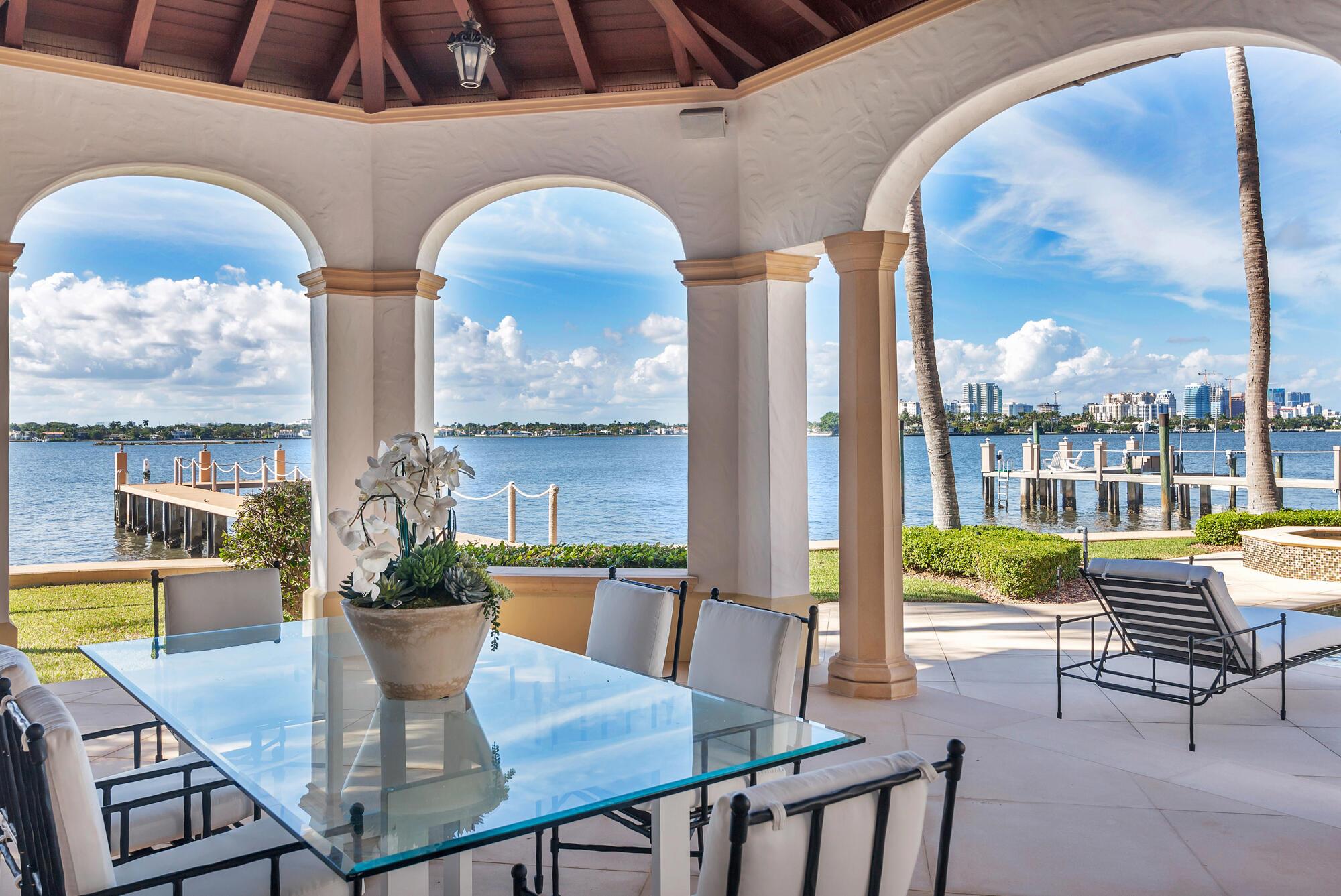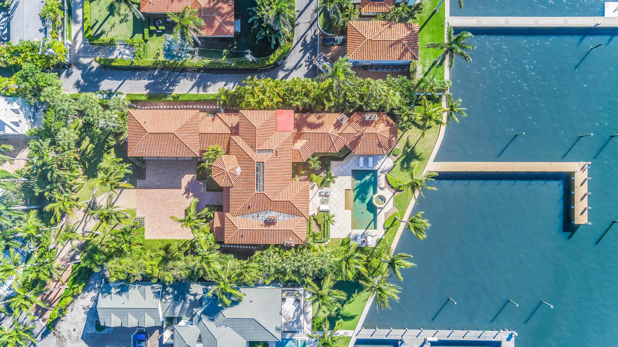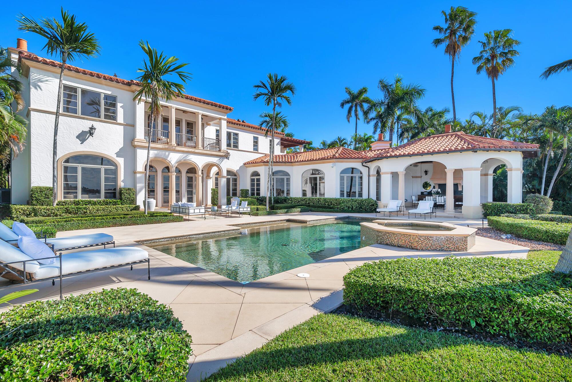 Water, Water Everywhere from the moment you walk in to this magnificent direct lakefront Mediterranean estate on over 2/3 of an acre located in the exclusive Estate Section of Palm Beach. Gated and lushly landscaped, the property is surrounded by mature foliage providing maximum privacy before opening up to 117' of commanding Intracoastal views. The gracious floor plan offers 5 bedrooms/7.5 baths and volume ceilings throughout. Highlights include luxurious second floor primary suite with private balcony and sitting room, chef's kitchen with butler's pantry, wood paneled library, oversized family room, wine cellar, media room, elevator, 100' x 40' concrete dock, full house generator and 3 car garage. Fabulous outdoor spaces with grand covered loggia ideal for dining and entertaining.