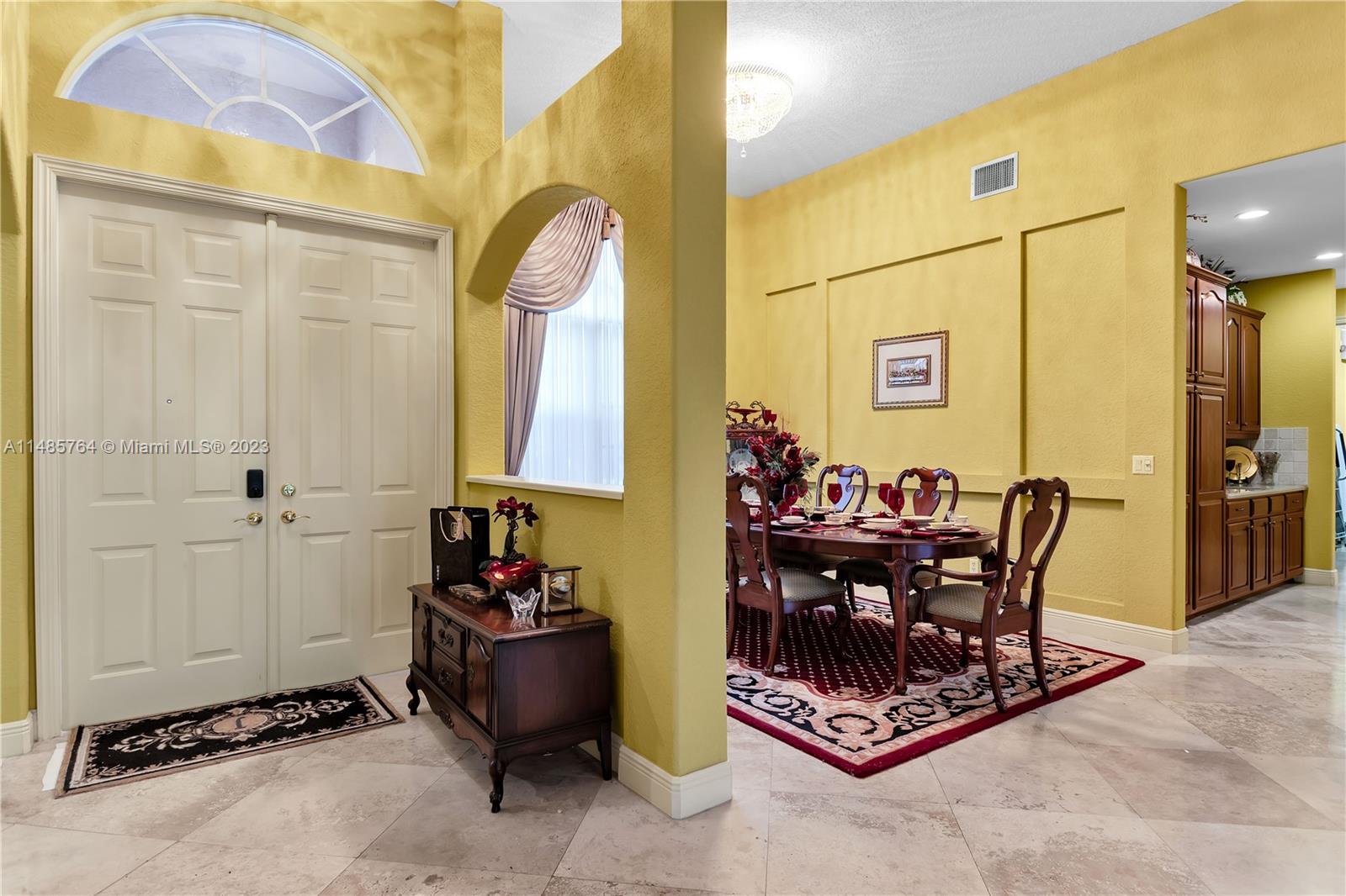 This stunning property features high ceilings, split floorplan, 4 bedrooms + an office, plantation shutters & 2 a/c units. Large windows invite an influx of natural light that amplifies the sense of space, casting a natural glow upon the high ceilings & beautiful travertine tiled flooring adding to the grandeur of the home. The kitchen is well appointed, designed with modern ss appliances, including a double wall oven, an island & a convenient butler’s pantry makes preparing meals a delightful experience. The inclusion of an eat-in counter & eat-in kitchen provide ample room to enjoy meals. The exquisite primary suite boasts a tray ceiling, a walk-in closet, a 2nd closet, wooden flooring, & en-suite bathroom w/2 sinks, walk-in shower & soaker tub ensuring total repose after a long day.