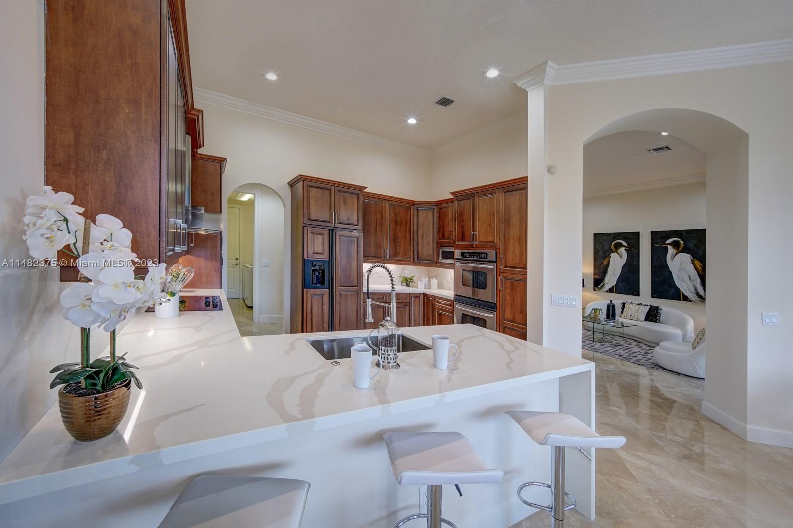 Don't miss this newly renovated 5/3 in the gated community of Hawks Landing. One story ranch bright and spacious w/ high volume ceilings, marble floors throughout the main living areas and new hardwood floors in the bedrooms. Freshly painted inside and out including ceilings in the entire home. New 36” counters in the kitchen w/ waterfall quartz counters, full backsplash, new sink & faucet. Triple split floor plan. The owners suite and bath features high volume ceilings, double walk-in closets and spa bath. The primary bath features marble spa tub & shower and a double sink vanity. Relax in the tranquil sounds of the waterfront pool w/ its covered lanai. Enjoy the country club lifestyle, playing tennis, fitness center, palatial clubhouse, pickle-ball, basketball or Olympic size pool.