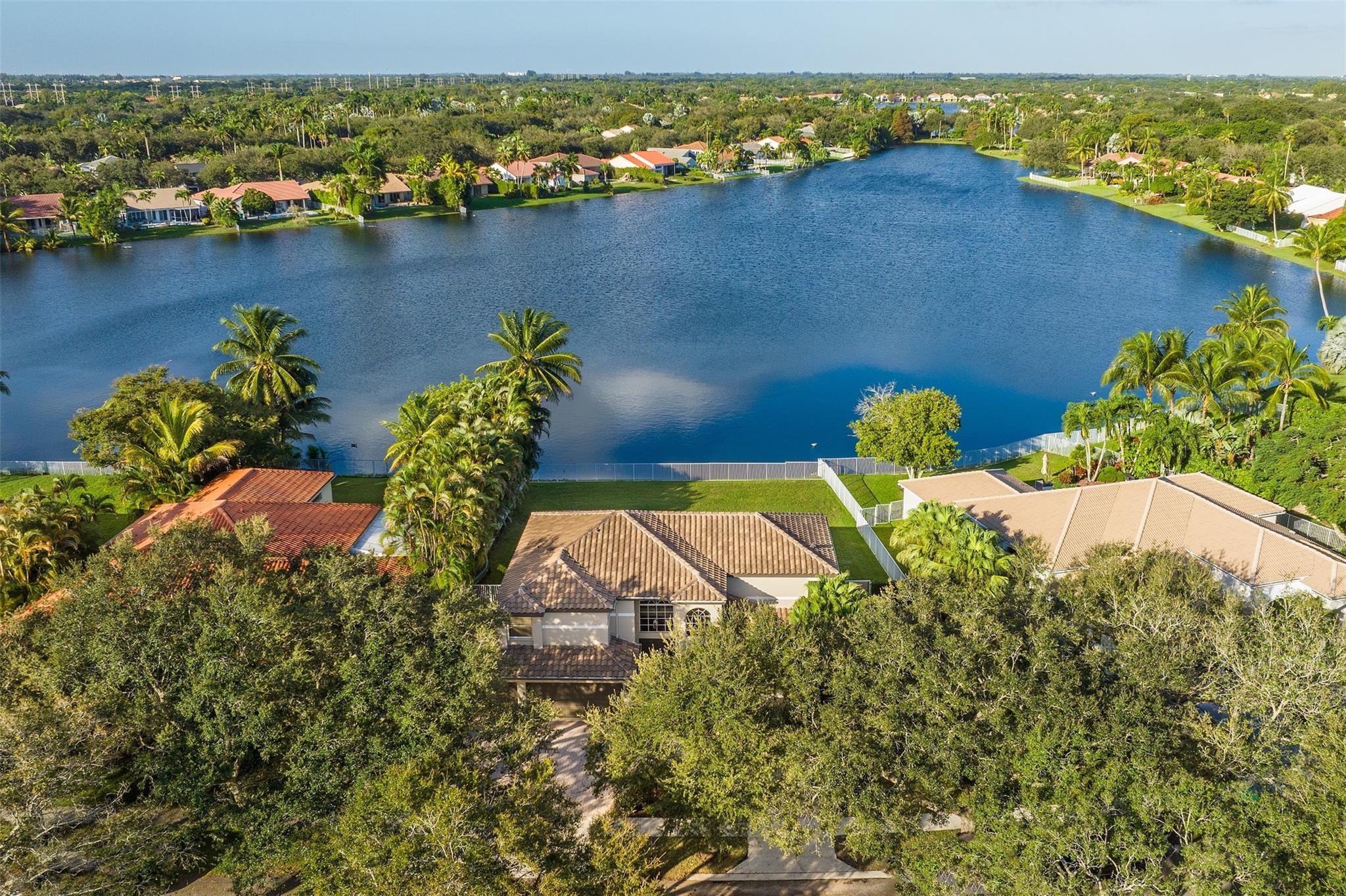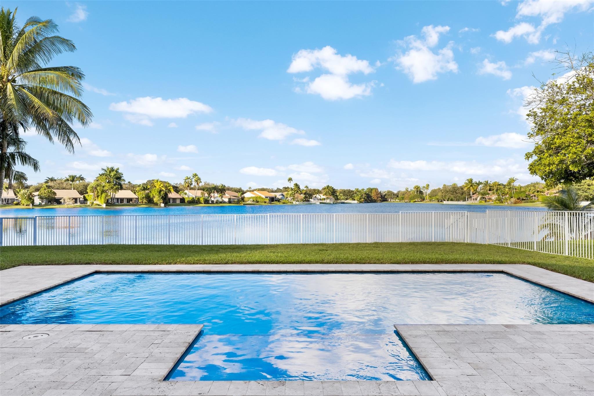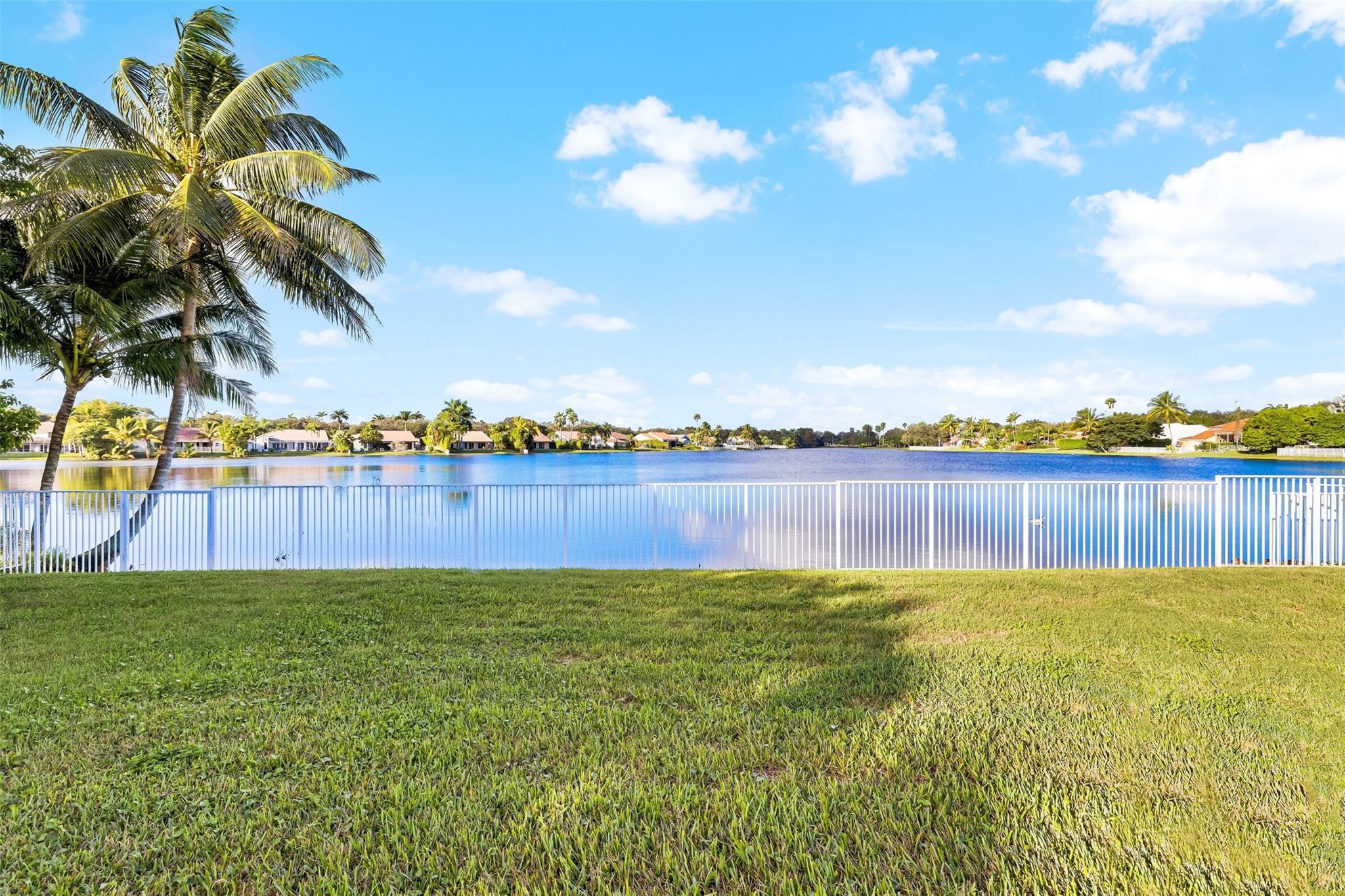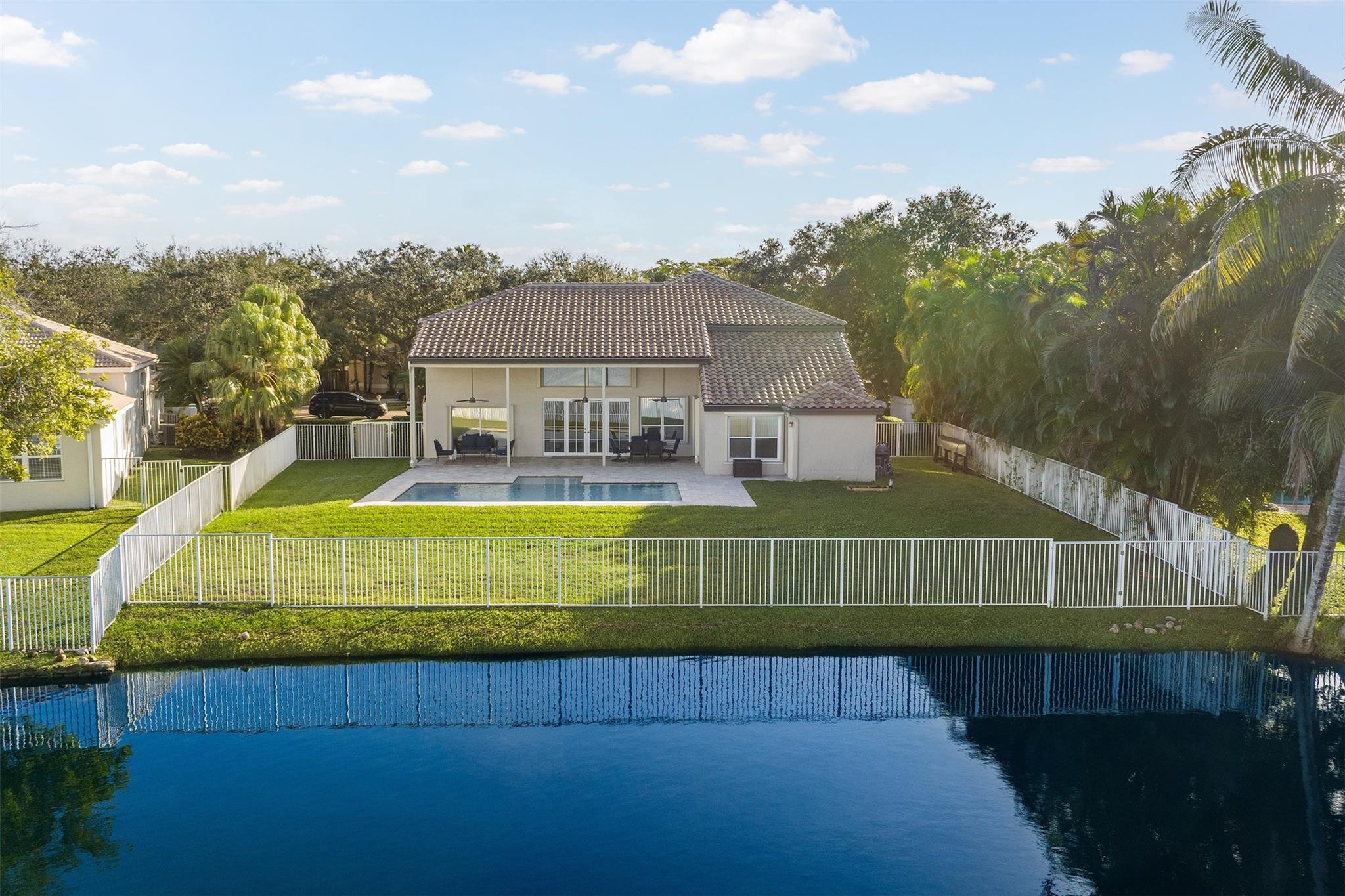 Spectacular lake-front home in The Estates of Embassy Lakes. This home is positioned with long water views on the lake and beautiful sunsets in the evening. The roof was replaced in 2022, new pool was installed in the last few years with a large travertine deck, sun-deck and bubbler, fully-fenced yard, renovated kitchen, new electric panel, wood floors, renovated primary-suite bathroom, indoor and outdoor Sonos speakers, partial impact windows, accordion shutters, 3-car garage and more. Come and see for yourself the manicured neighborhood of Embassy Lakes and this meticulously maintained home in The Estates. Full-time security and guard-gate.