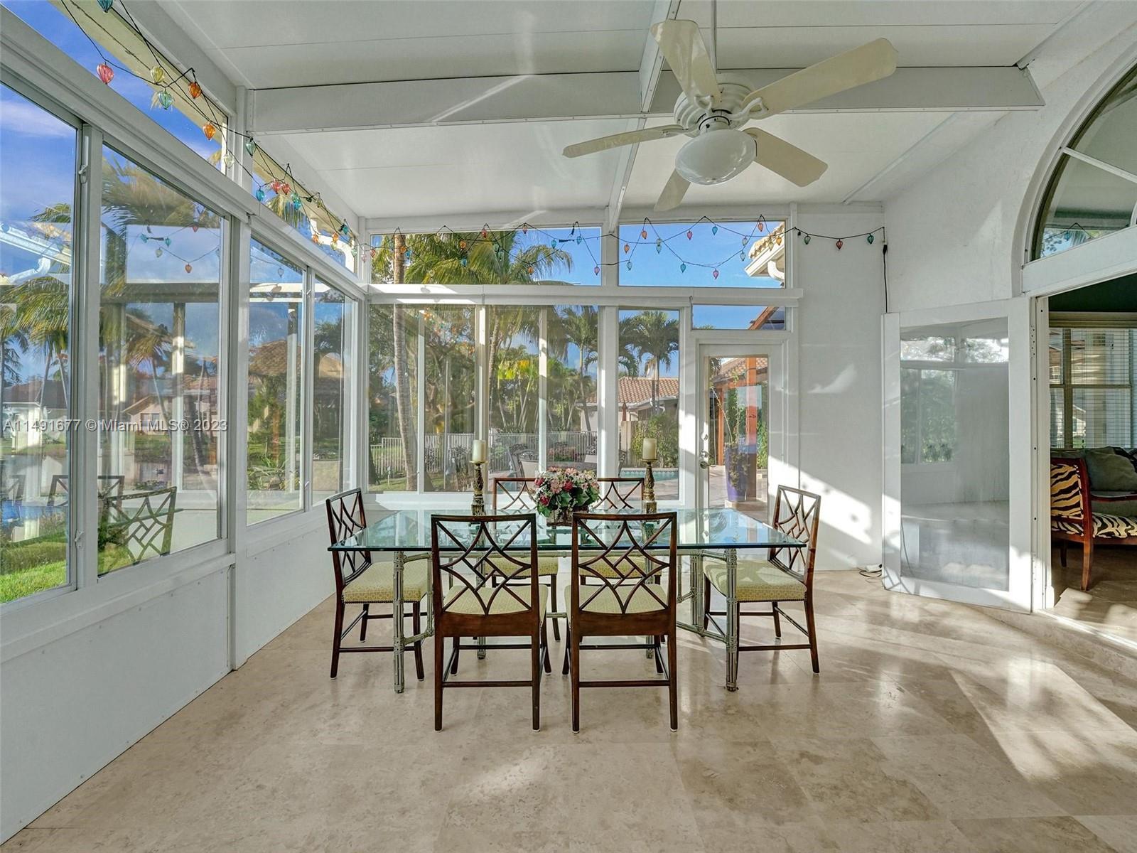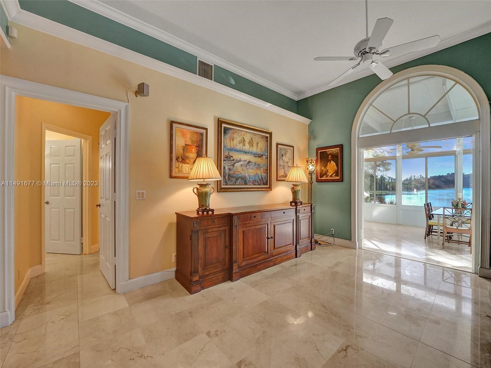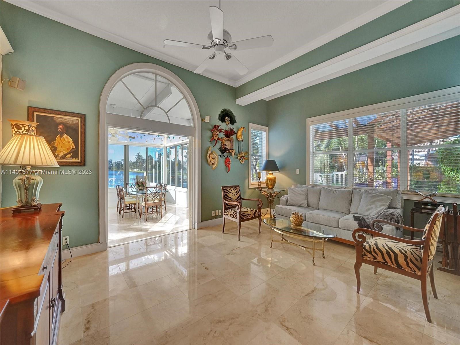 Tucked in a quiet cul-de-sac, this 4 Br + office + study/gym, waterfront gem offers an elegant interior with 12 ft ceilings & luxurious marble floors. Large kitchen featuring mahogany wood cabinetry, plenty of storage & workspace, updated appliances & gas stove. New air-conditioned sunroom w/remote-controlled shades. Outdoor oasis with a solar-heated salt pool, travertine deck & cedar pergola, views of the lake/wildlife preserve & memorable sunsets year-round. Oversized driveway, 3-year-old roof, new A/C unit. This haven is part of a welcoming community. Bonus features: New lake-fed irrigation system, new pool equipment, accordion shutters. Ideal location, closest to the resident gate, tennis court & playground, 4 mins from shopping & I-75. Nearby 7-1/2 miles of trails for biking/walking