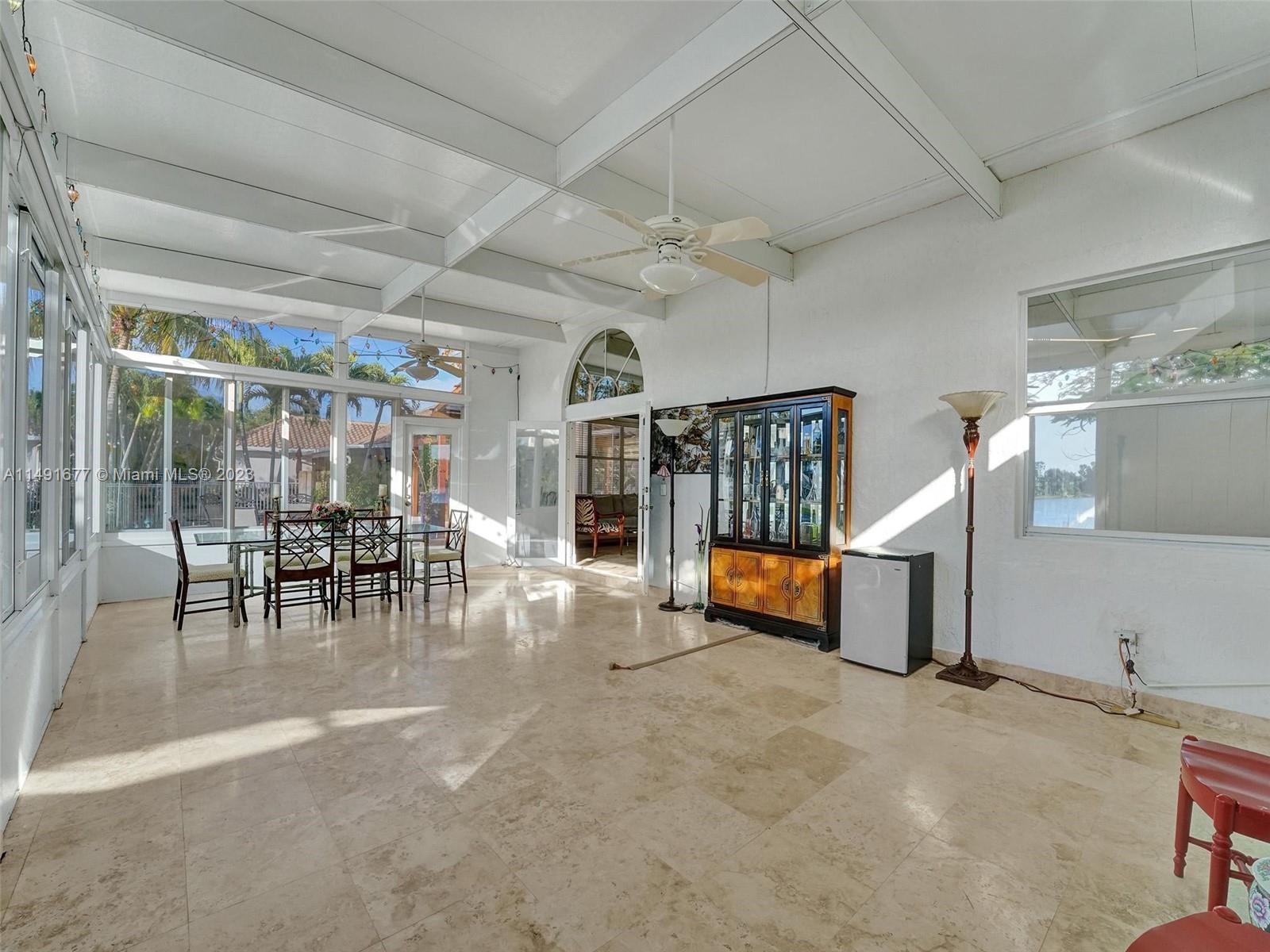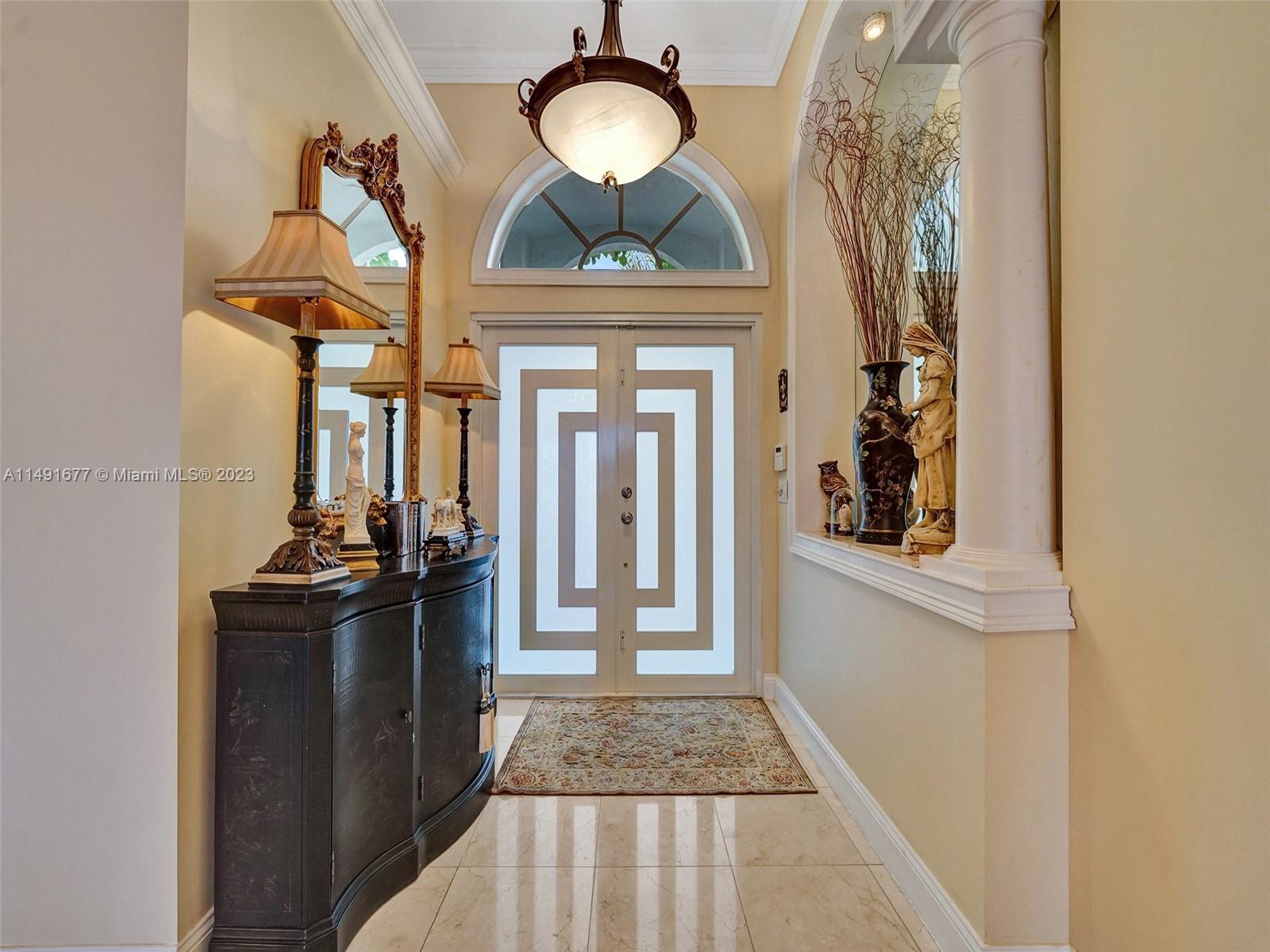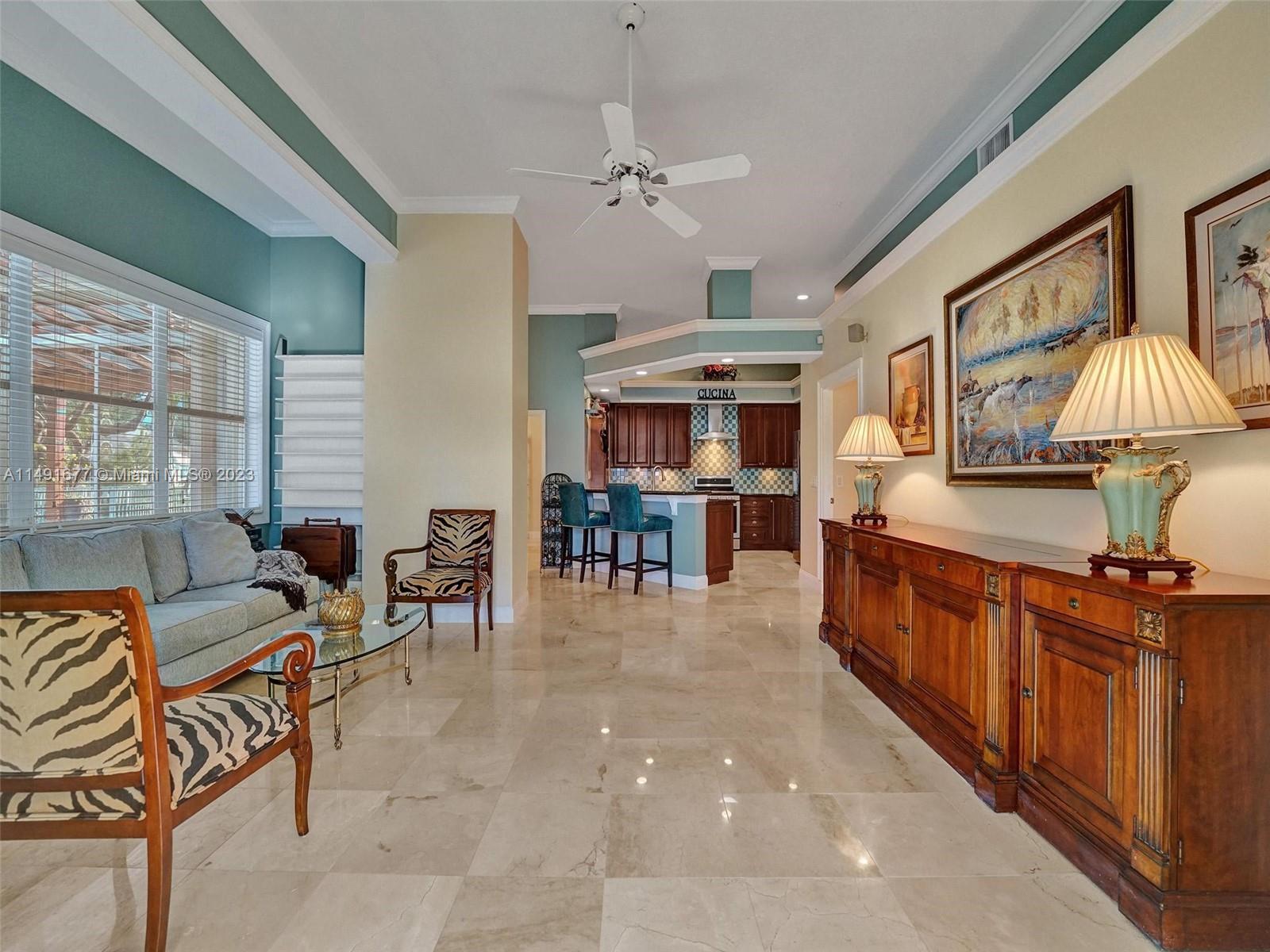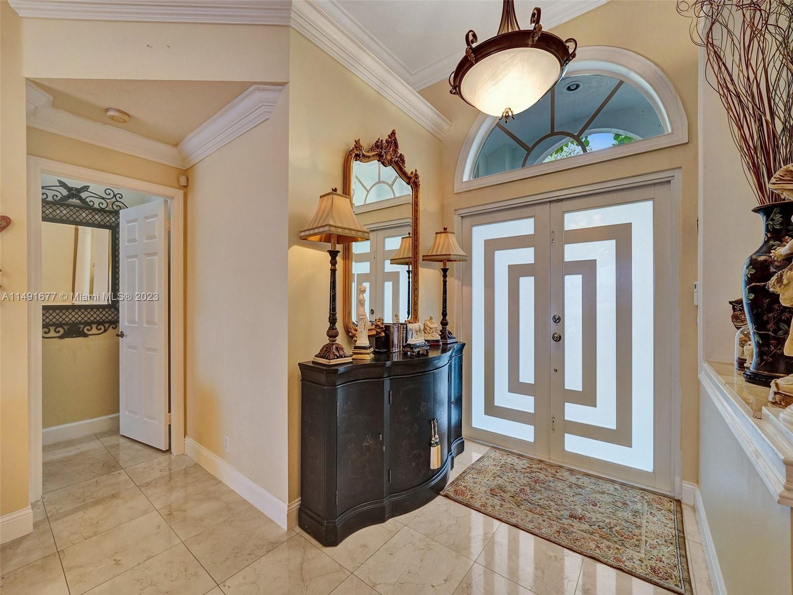 Tucked in a quiet cul-de-sac, this 4 Br + office + study/gym, waterfront gem offers an elegant interior with 12 ft ceilings & luxurious marble floors. Large kitchen featuring mahogany wood cabinetry, plenty of storage & workspace, updated appliances & gas stove. New air-conditioned sunroom w/remote-controlled shades. Outdoor oasis with a solar-heated salt pool, travertine deck & cedar pergola, views of the lake/wildlife preserve & memorable sunsets year-round. Oversized driveway, 3-year-old roof, new A/C unit. This haven is part of a welcoming community. Bonus features: New lake-fed irrigation system, new pool equipment, accordion shutters. Ideal location, closest to the resident gate, tennis court & playground, 4 mins from shopping & I-75. Nearby 7-1/2 miles of trails for biking/walking