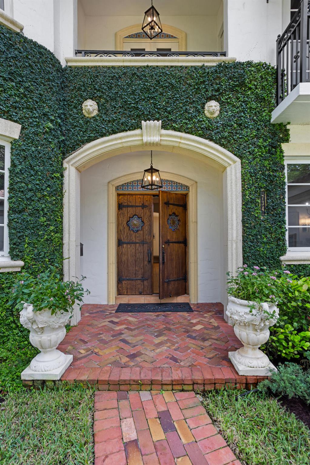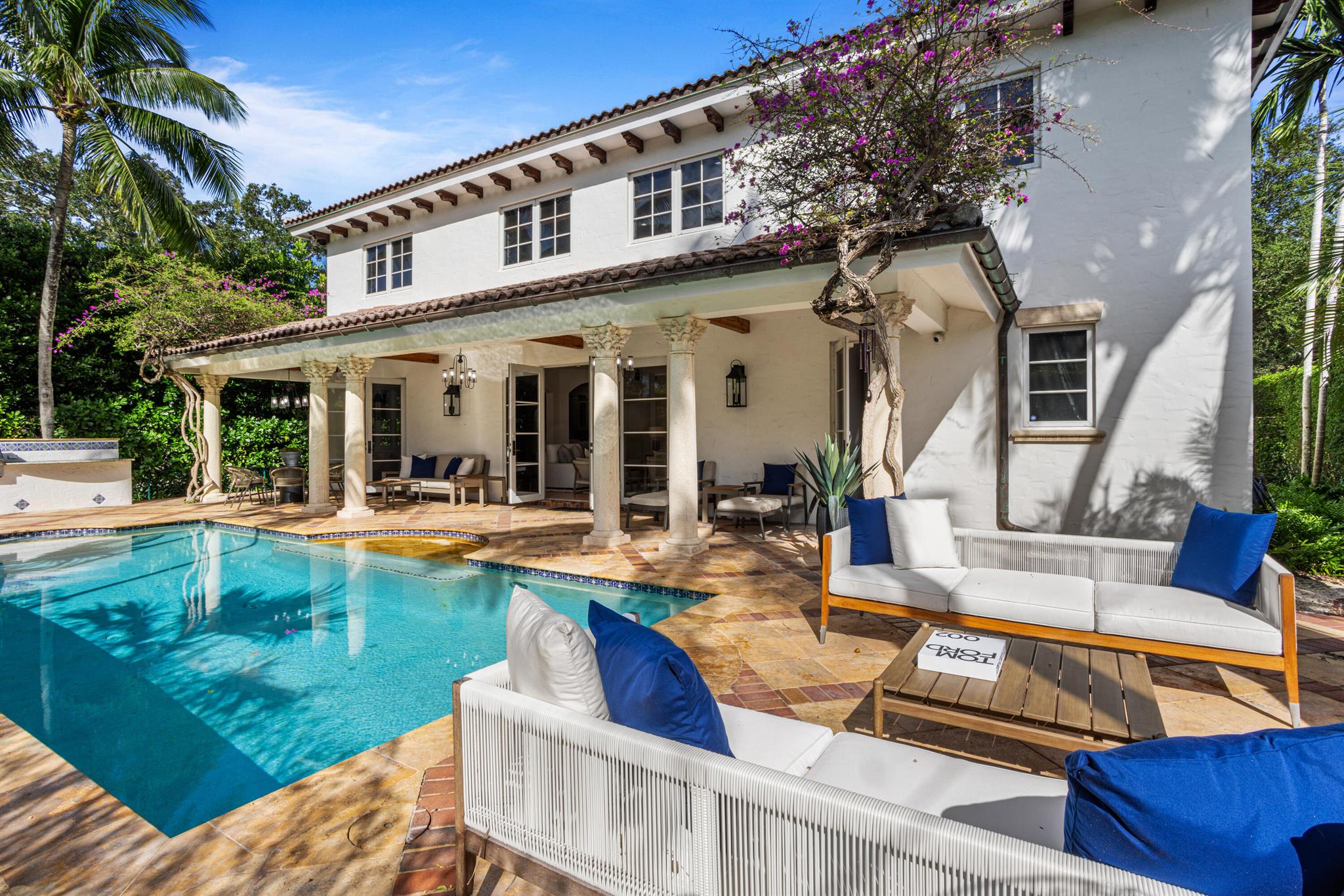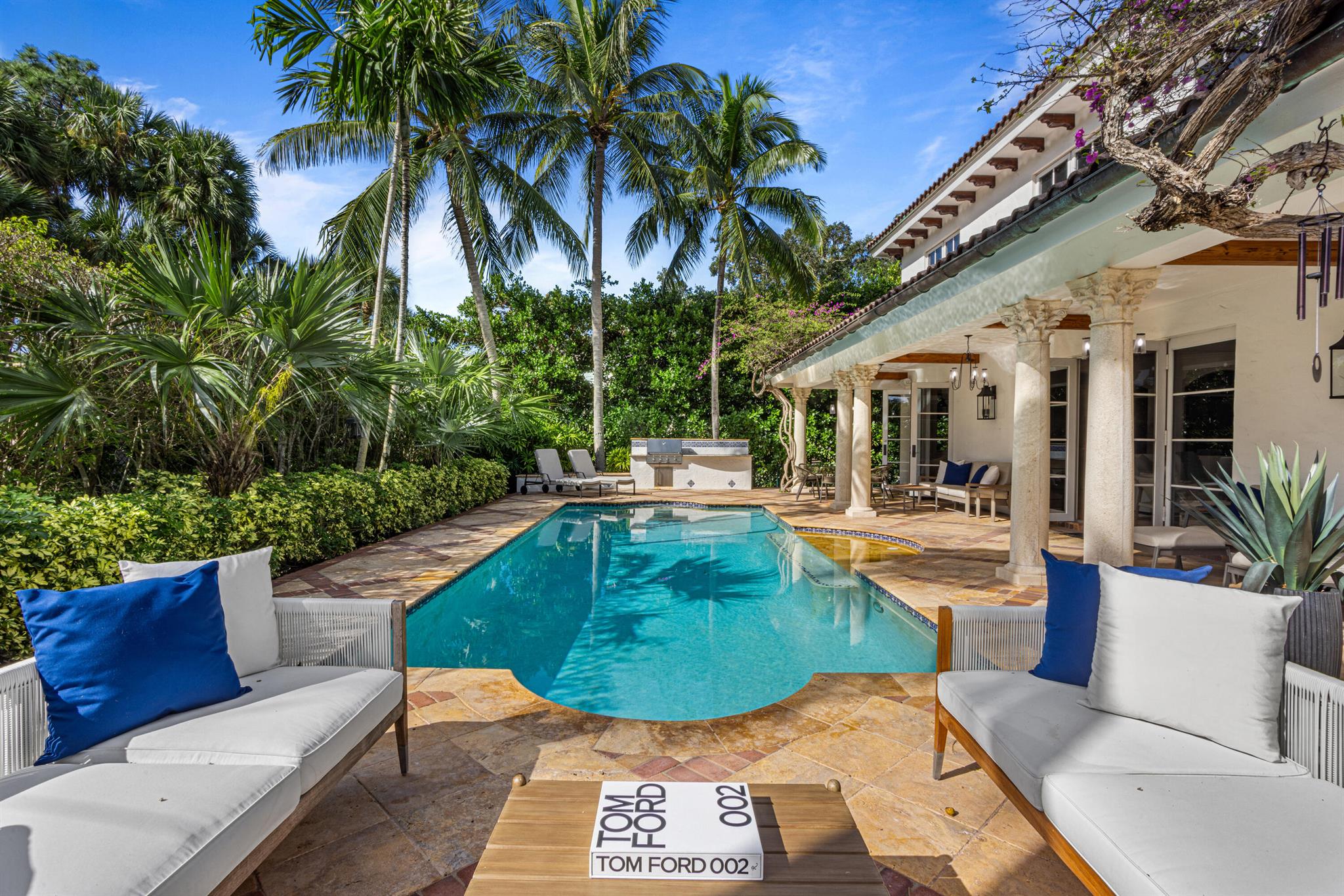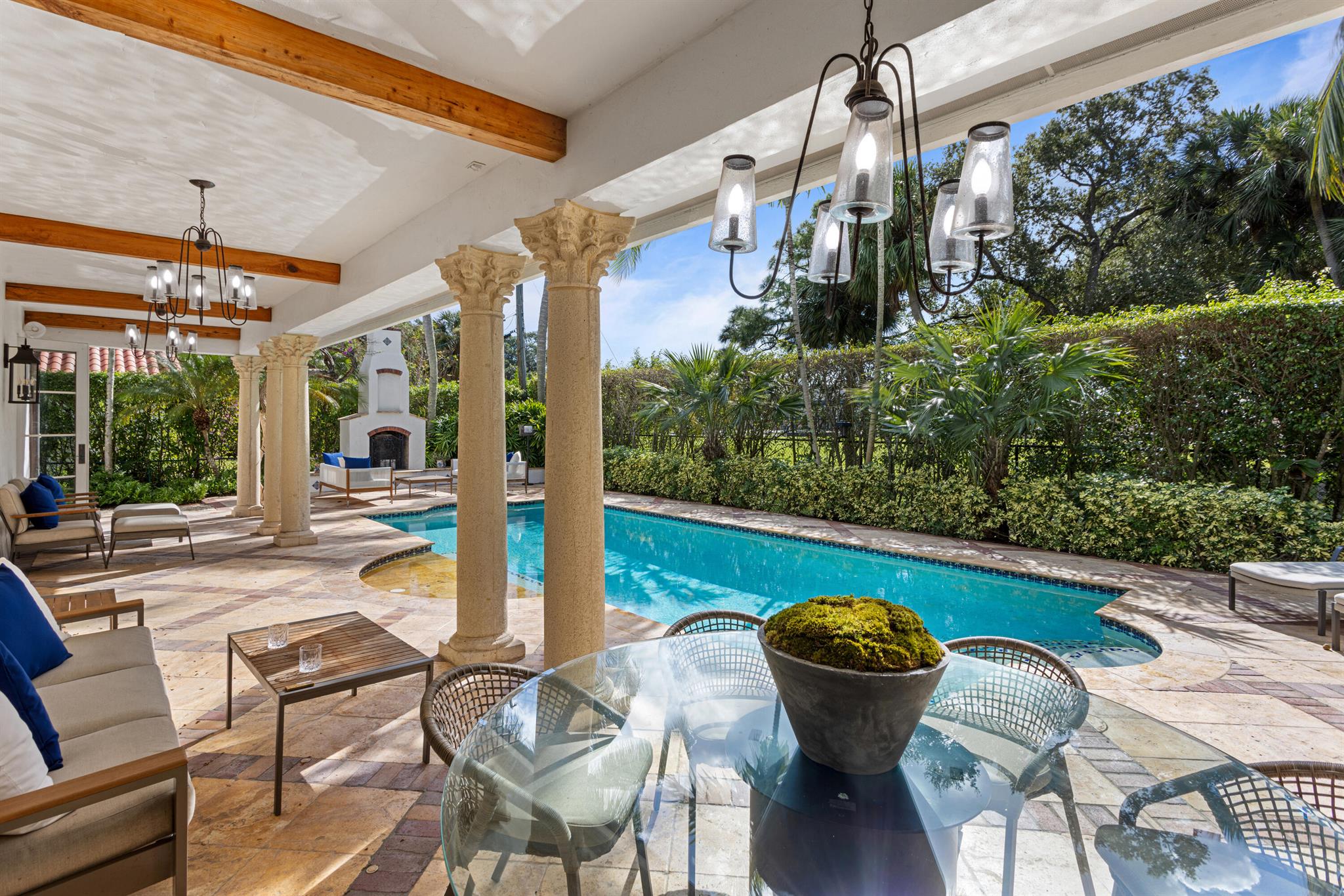 In a privately treed garden setting, this transitional jewel fluently captures Addison Mizner's classic style. Pecky cypress corbels and beams, barrel tile roof, copper gutters, Spanish-tiled fountain, antiqued brick walkways, and columned loggia. A monumental outdoor fireplace anchors the brick-inlaid Portuguese limestone patio around the beautiful fountained pool with swim shelves all controlled by a Jandy automated pool operating system. A summer kitchen and built-in professional DACOR gas grill allow alfresco dining under the coconut palms and chandelier lit loggia/patio.