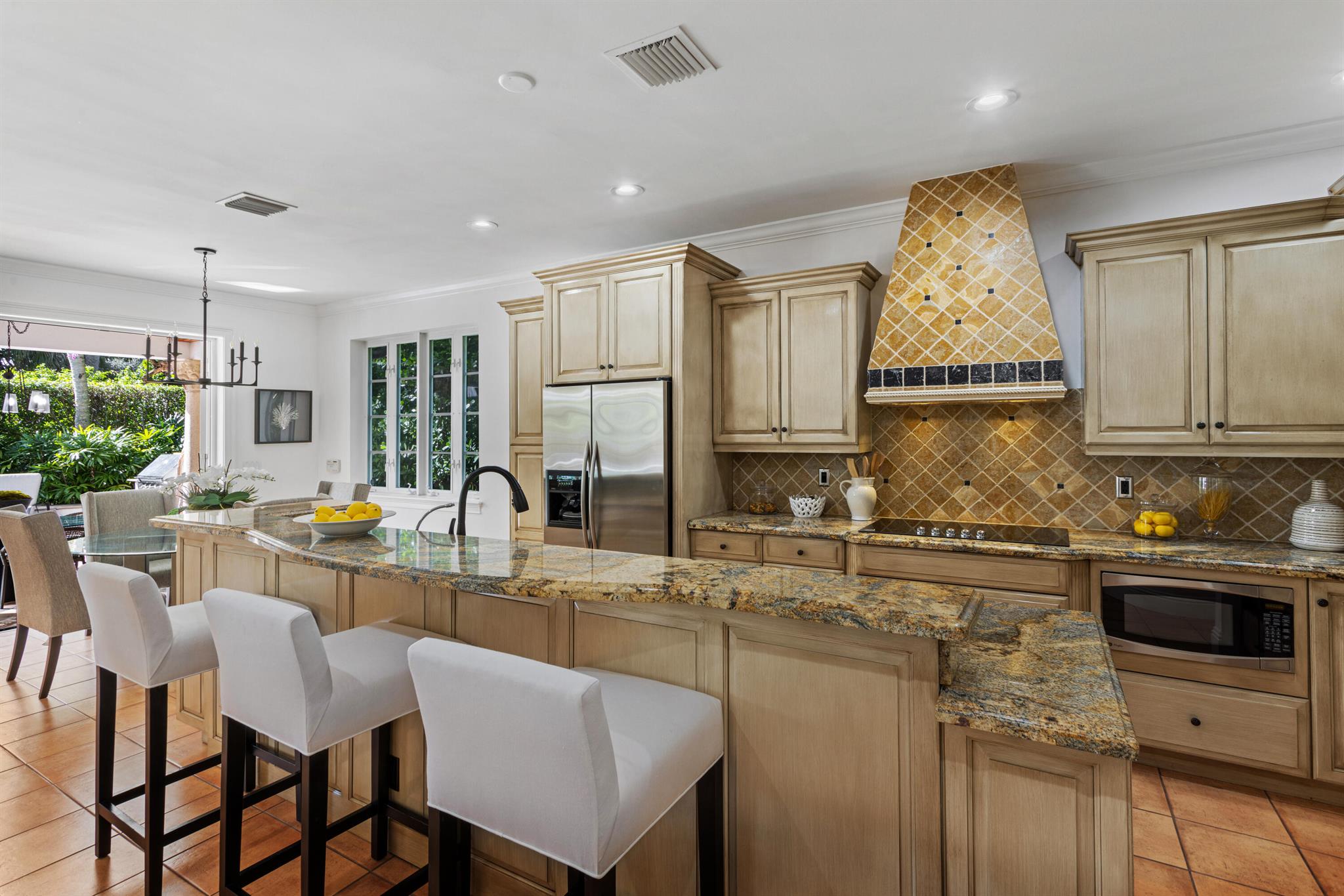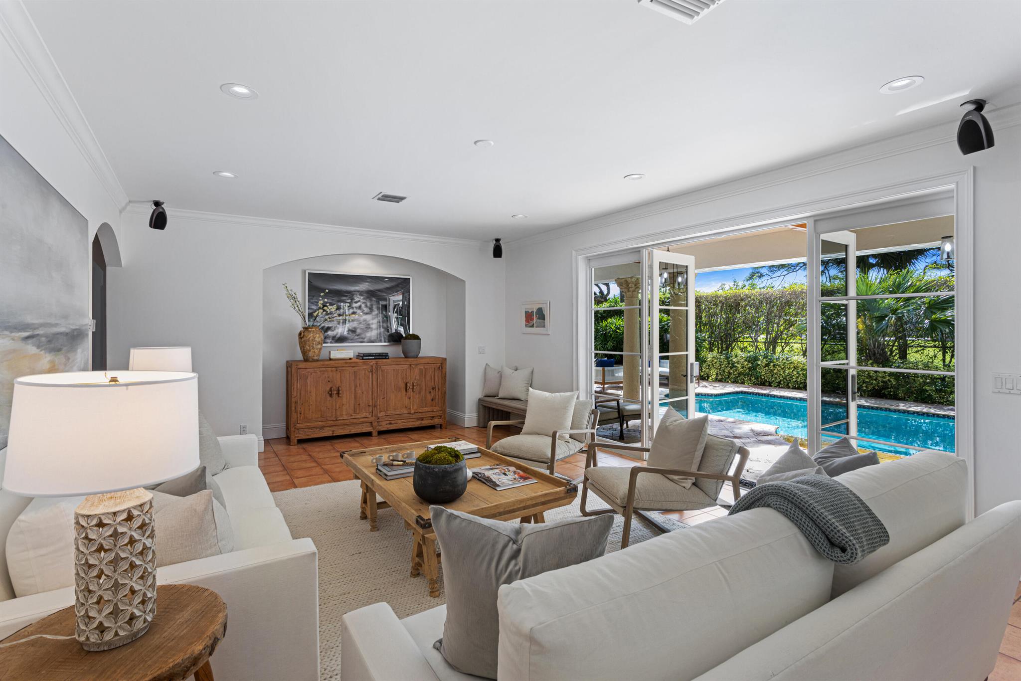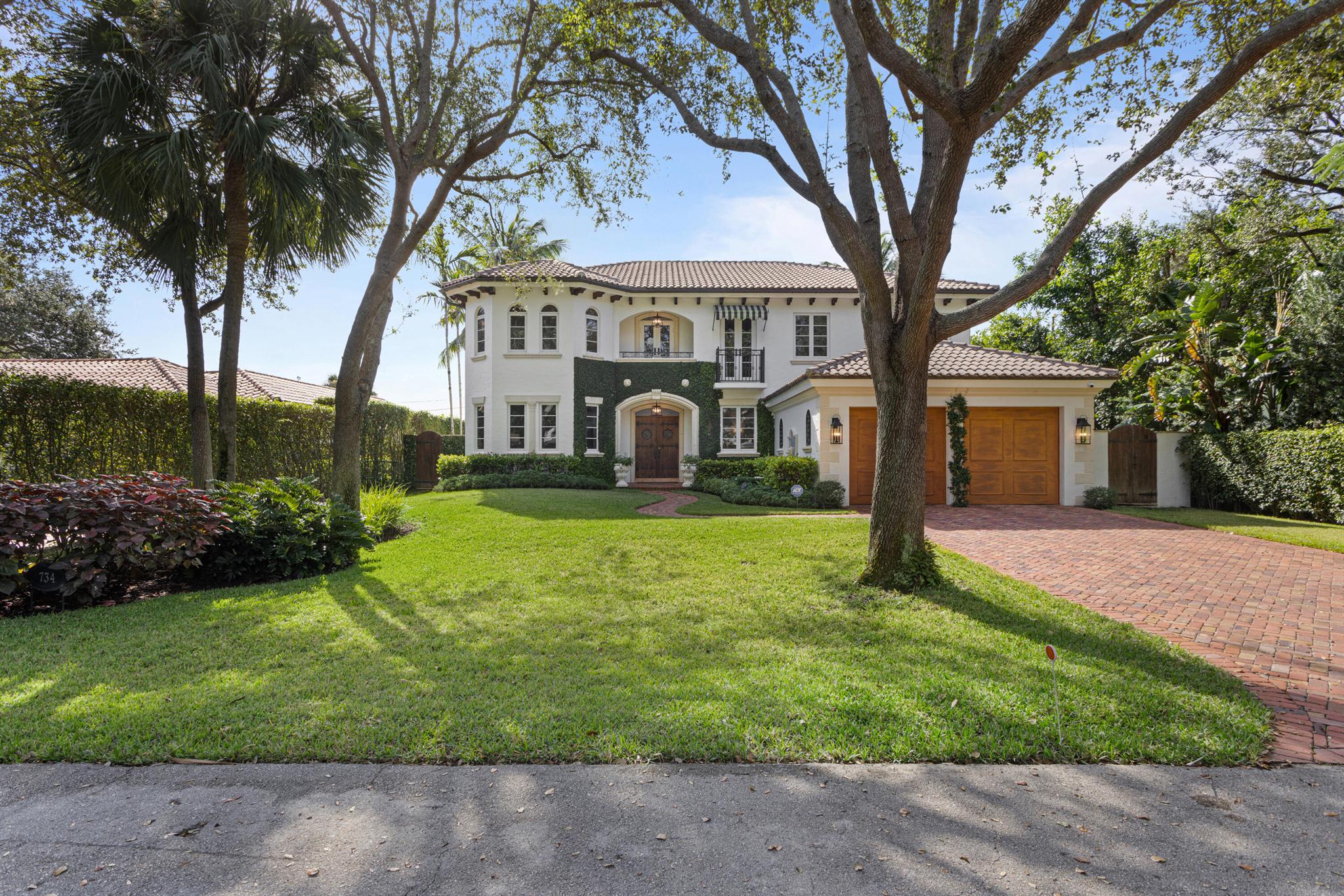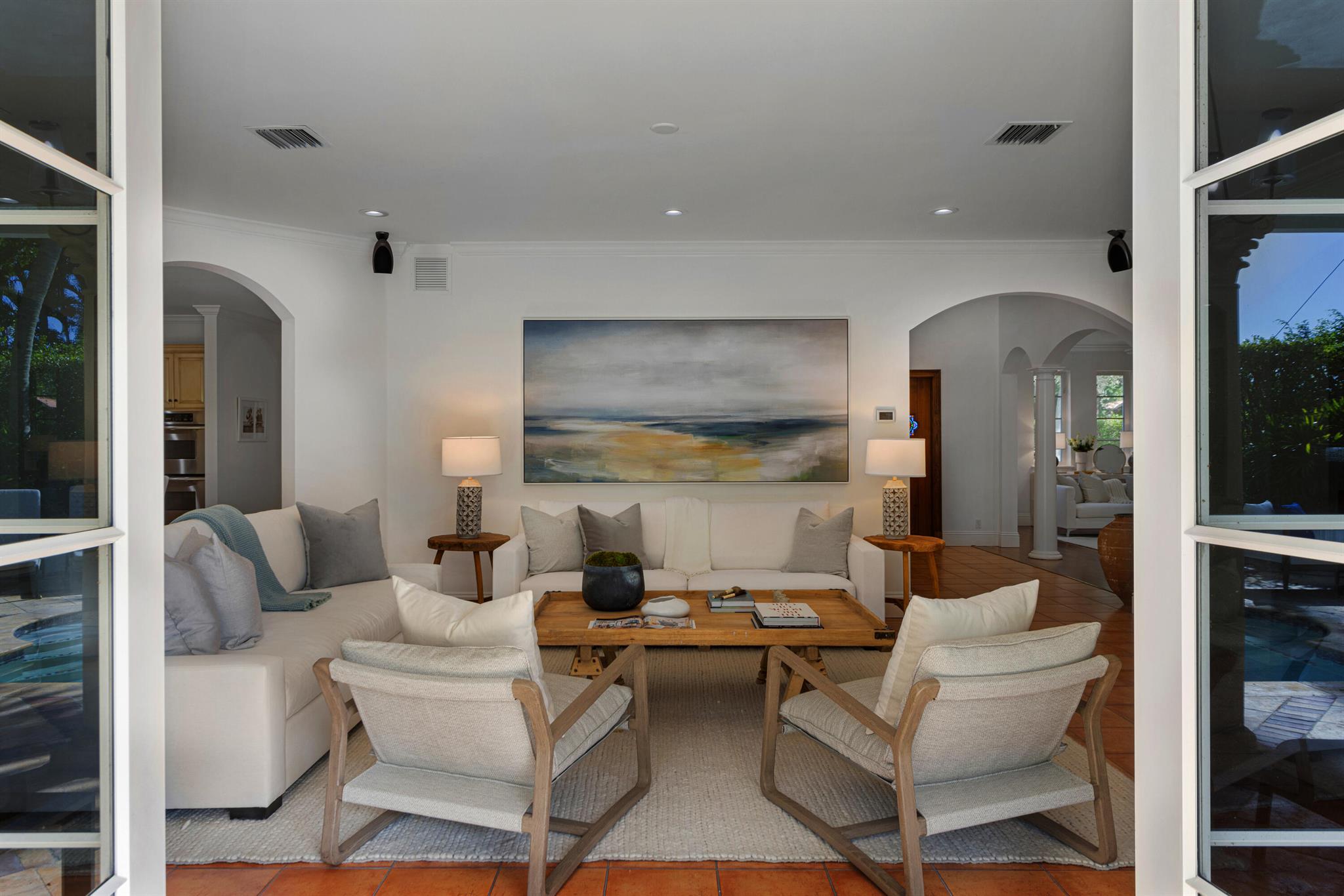In a privately treed garden setting, this transitional jewel fluently captures Addison Mizner's classic style. Pecky cypress corbels and beams, barrel tile roof, copper gutters, Spanish-tiled fountain, antiqued brick walkways, and columned loggia. A monumental outdoor fireplace anchors the brick-inlaid Portuguese limestone patio around the beautiful fountained pool with swim shelves all controlled by a Jandy automated pool operating system. A summer kitchen and built-in professional DACOR gas grill allow alfresco dining under the coconut palms and chandelier lit loggia/patio.