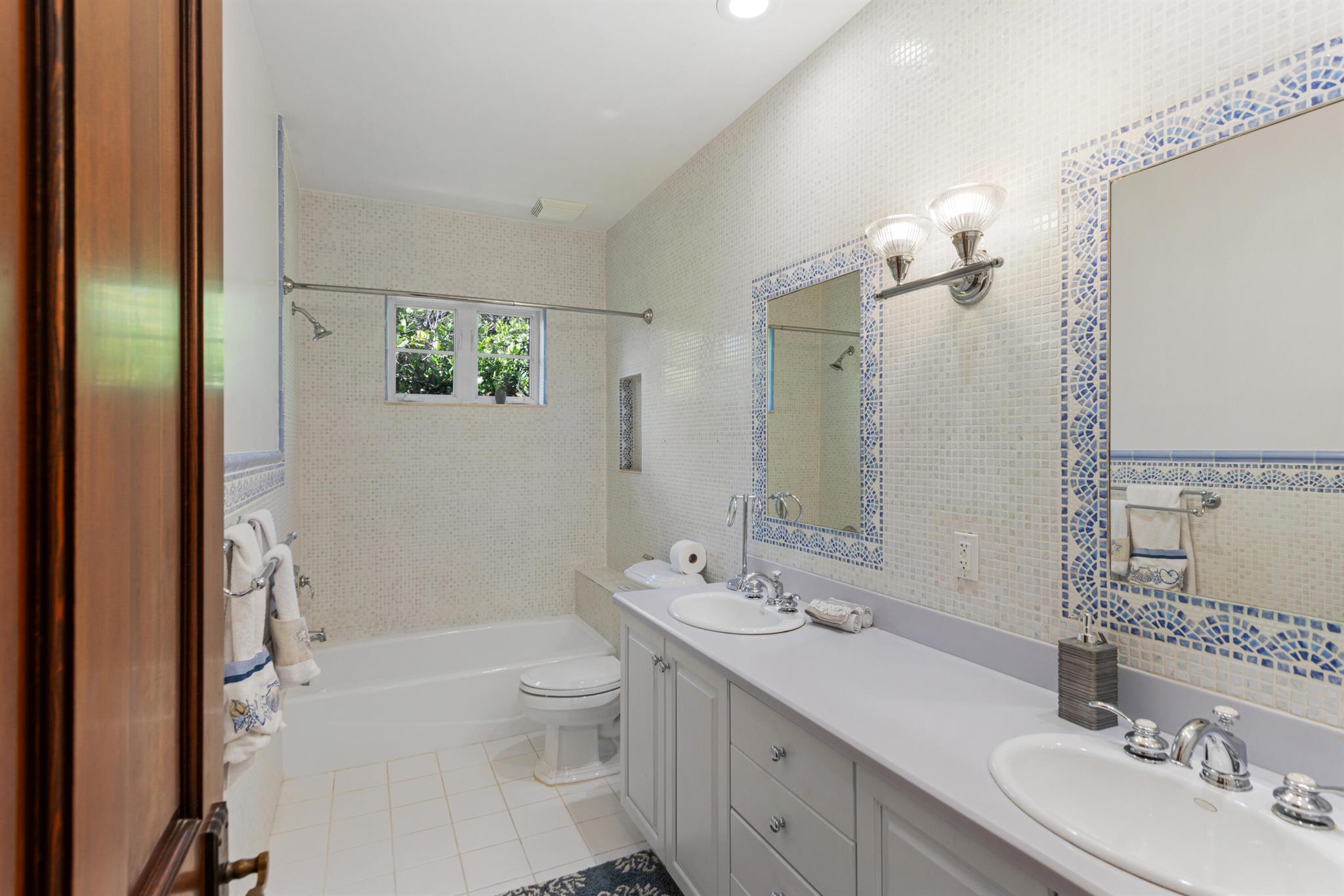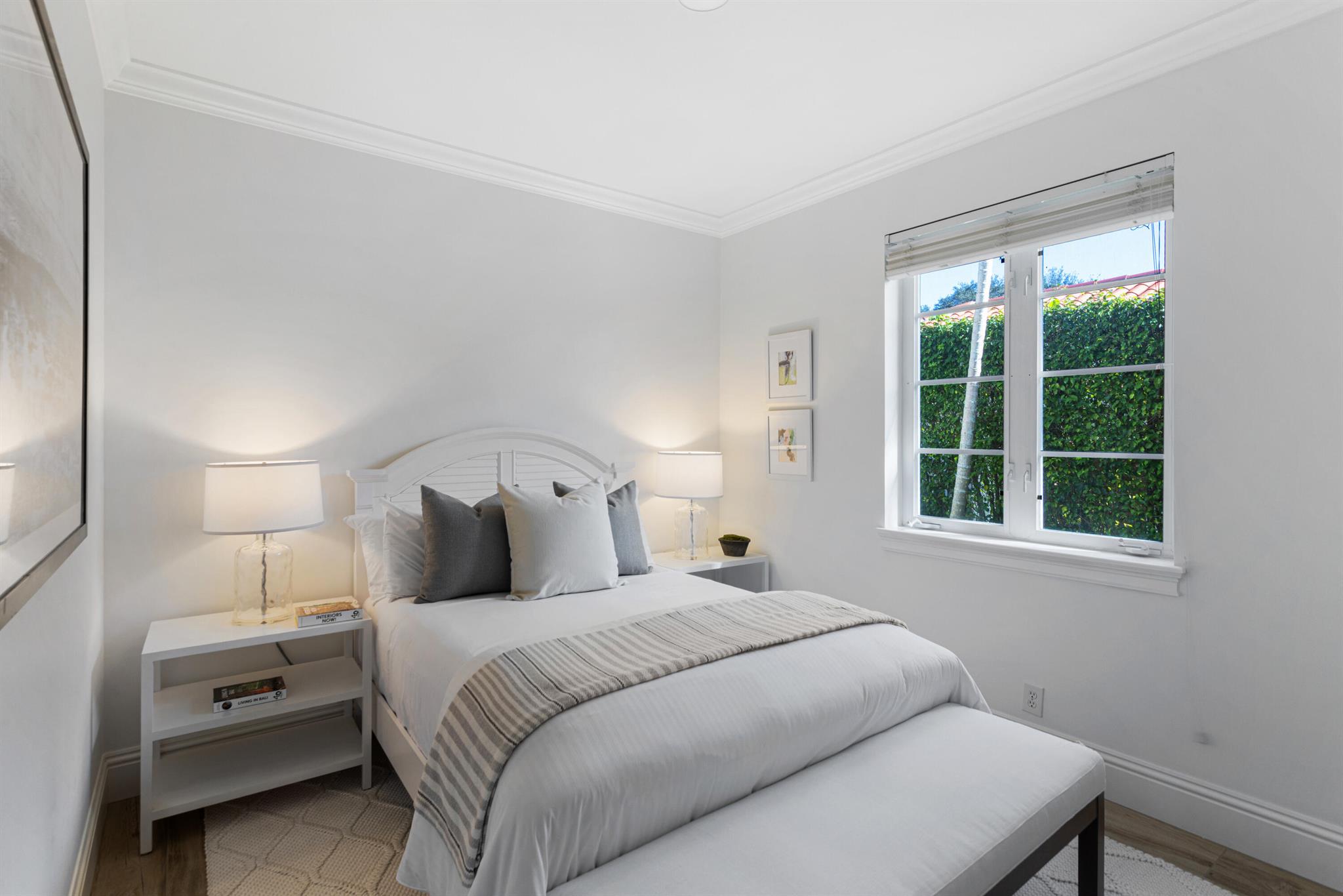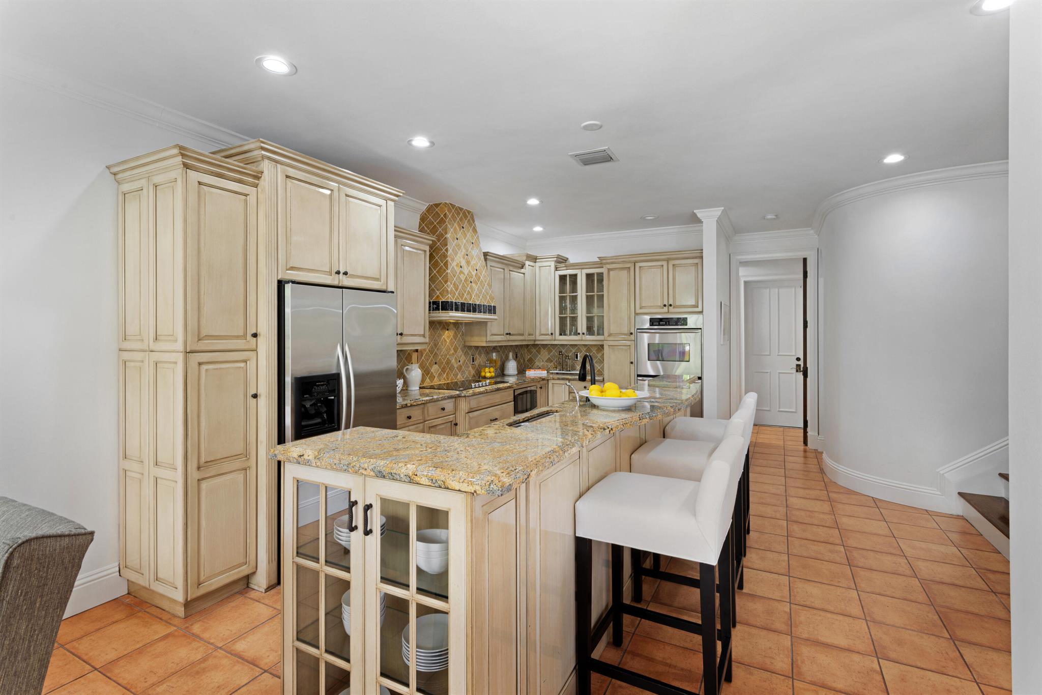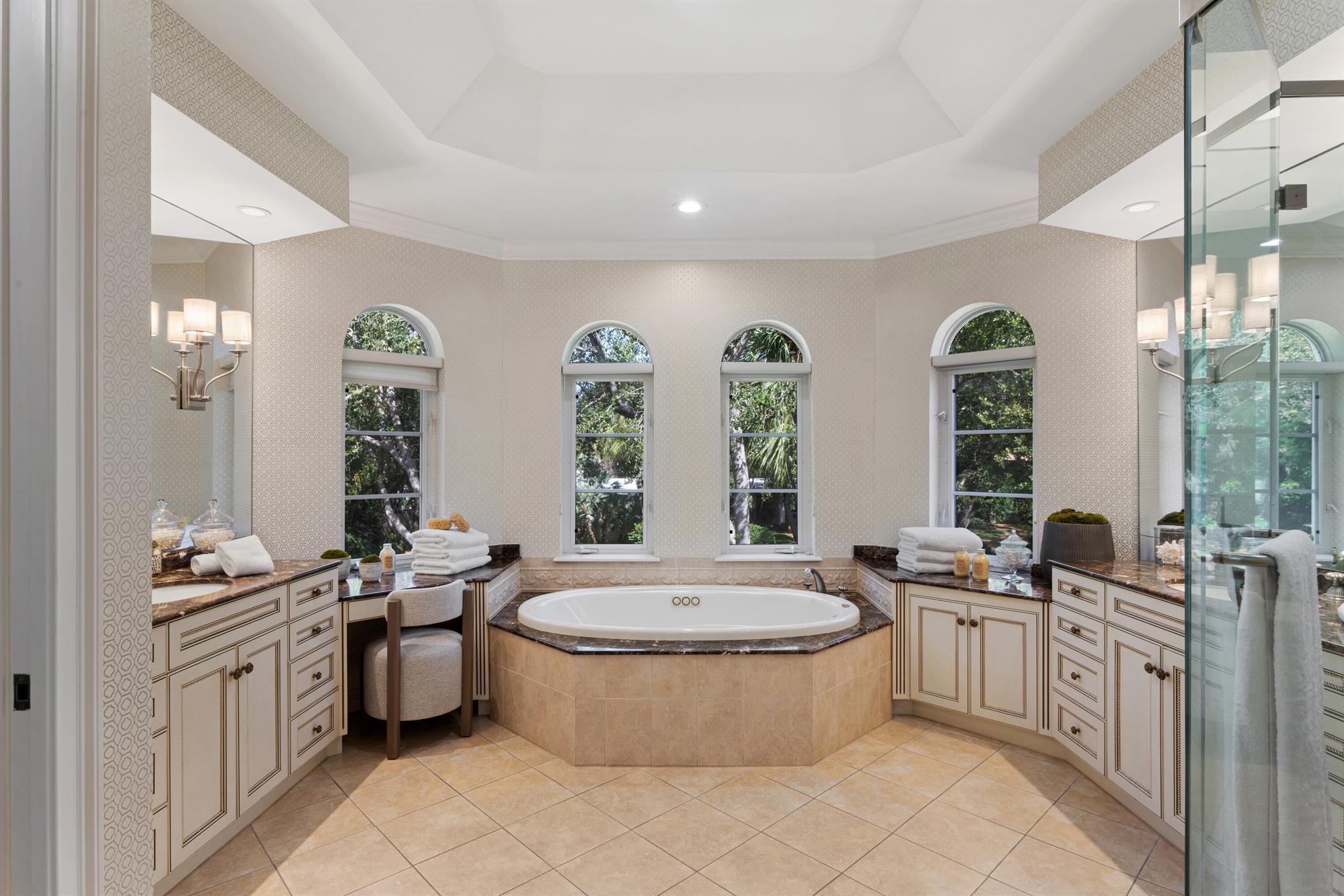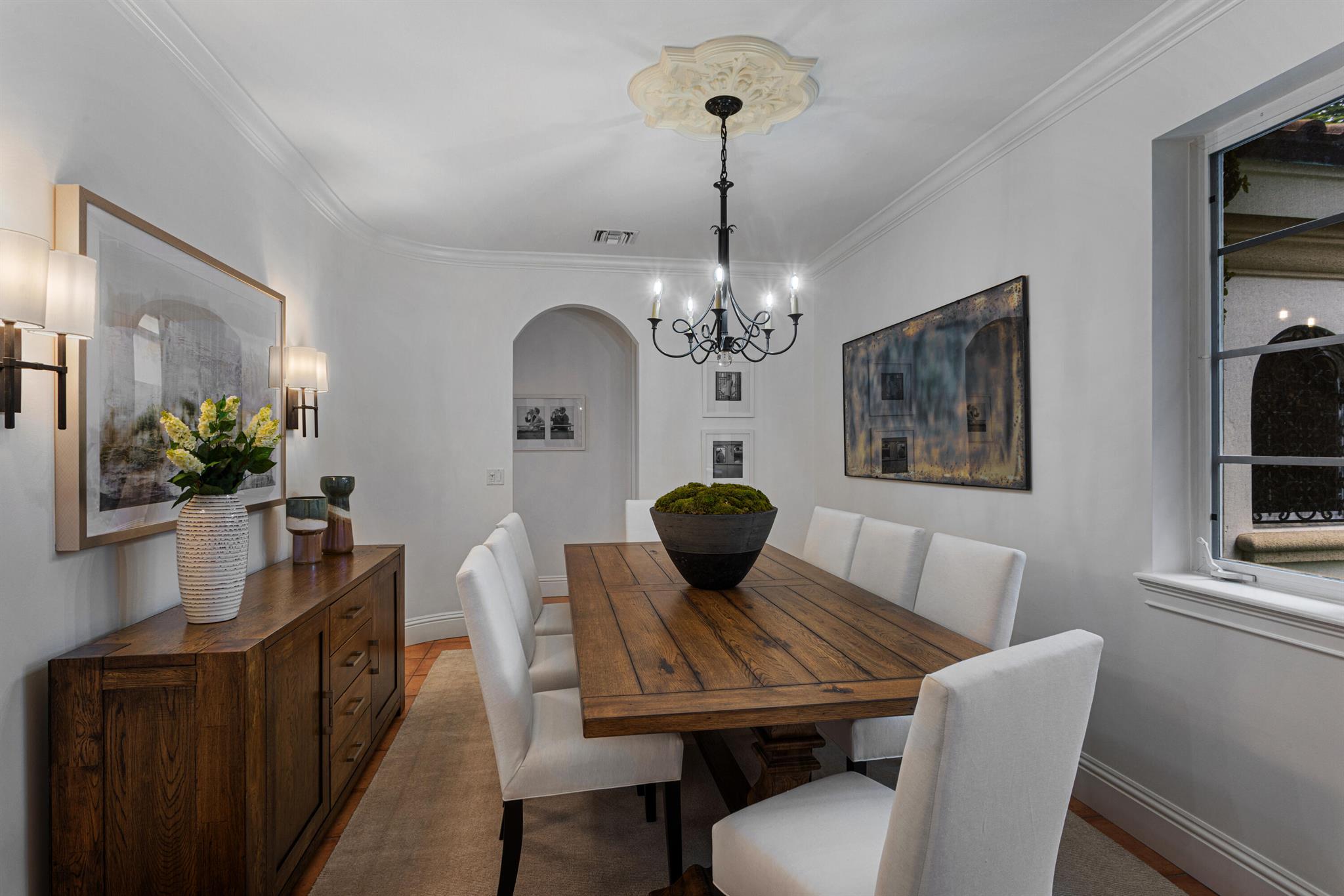 In a privately treed garden setting, this transitional jewel fluently captures Addison Mizner's classic style. Pecky cypress corbels and beams, barrel tile roof, copper gutters, Spanish-tiled fountain, antiqued brick walkways, and columned loggia. A monumental outdoor fireplace anchors the brick-inlaid Portuguese limestone patio around the beautiful fountained pool with swim shelves all controlled by a Jandy automated pool operating system. A summer kitchen and built-in professional DACOR gas grill allow alfresco dining under the coconut palms and chandelier lit loggia/patio.