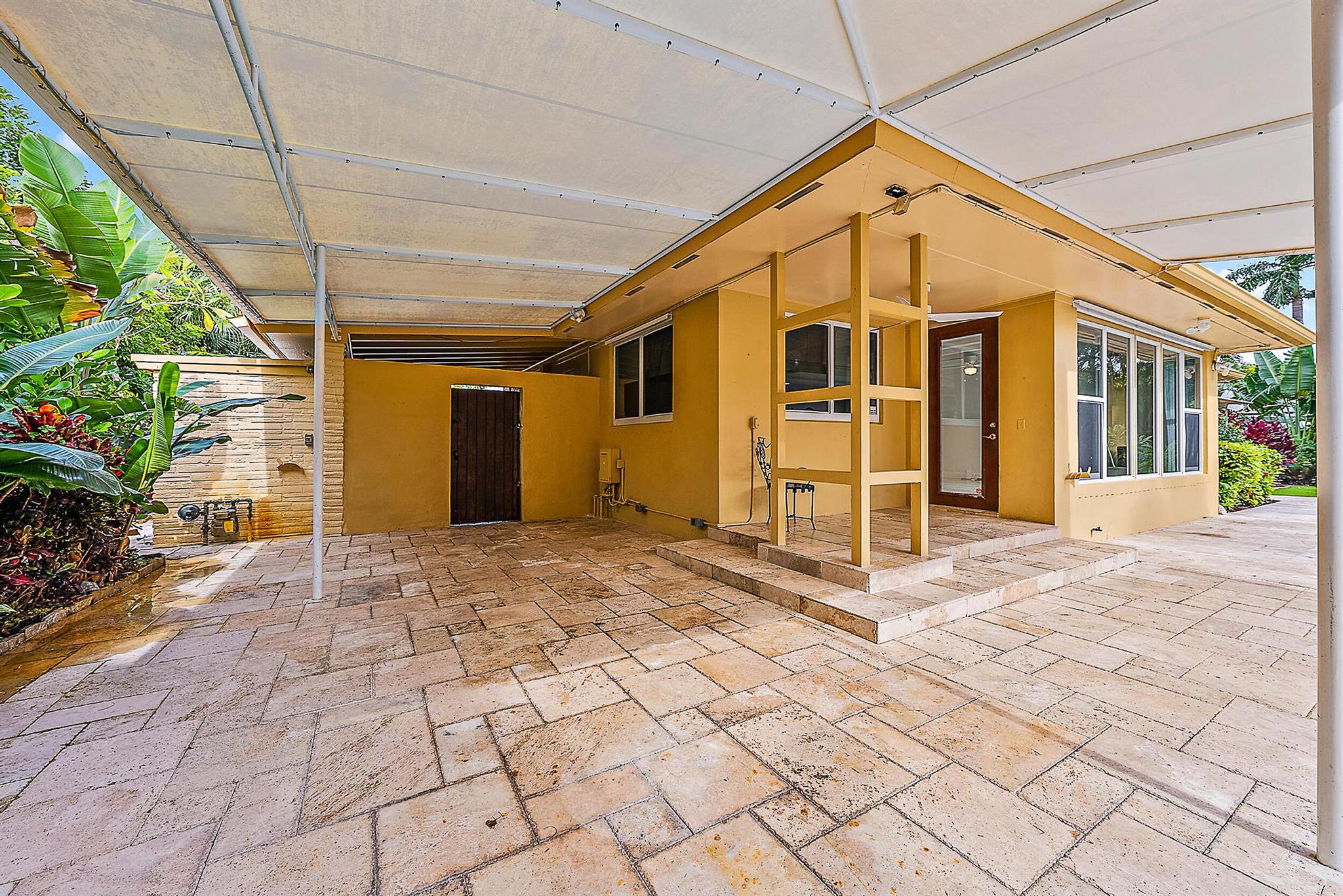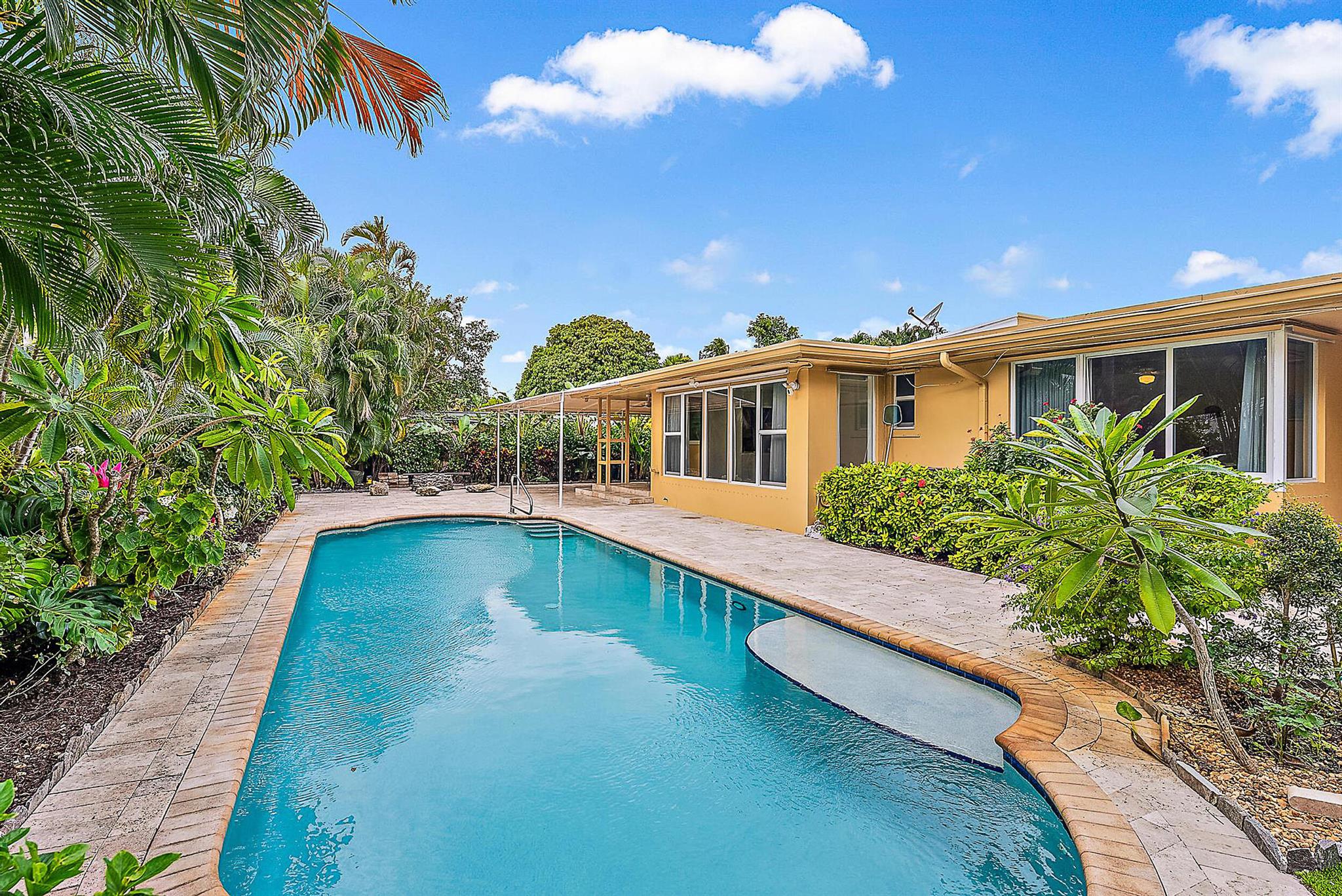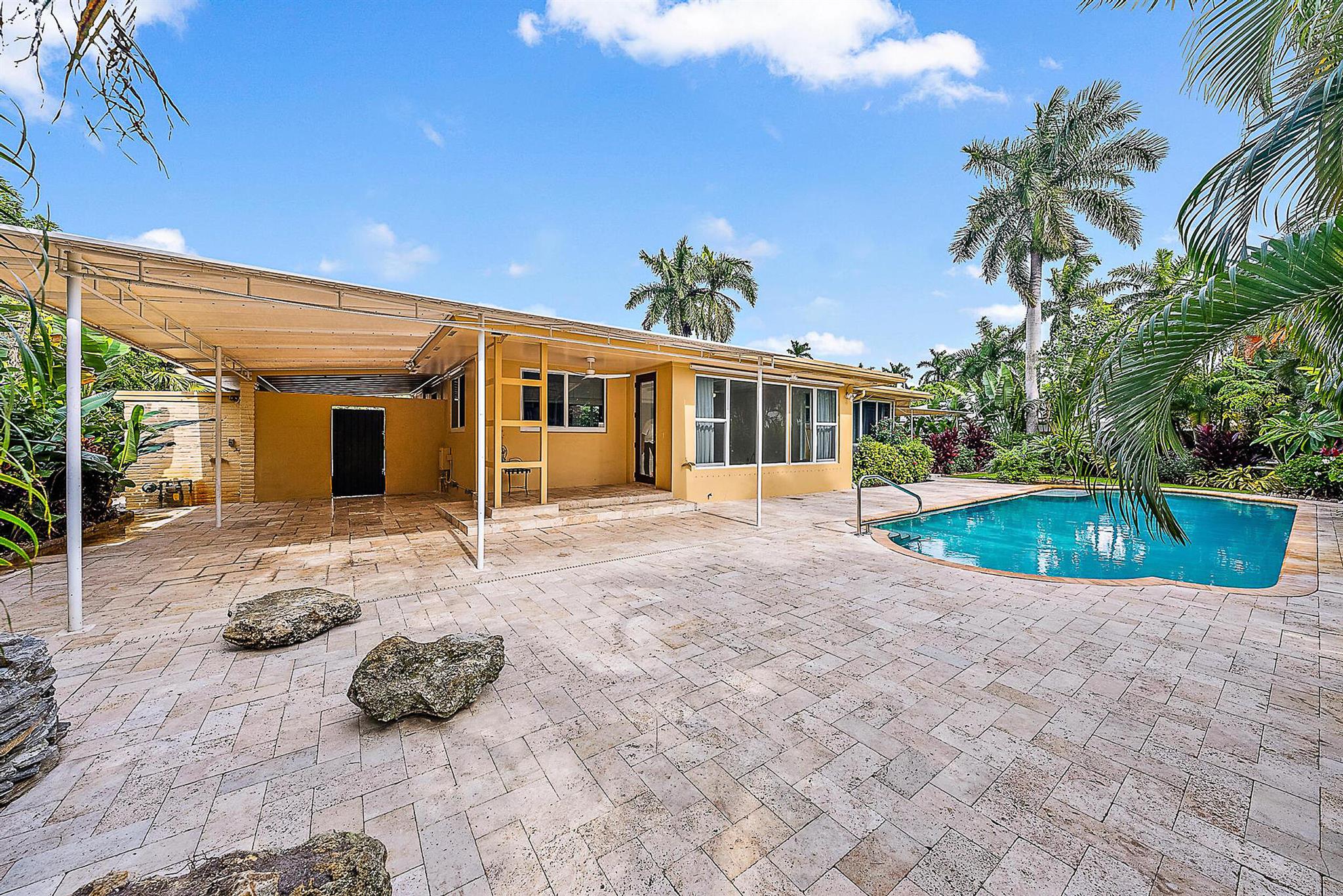 Discover your secluded retreat nestled in the highly coveted Northwood Shores. Beautifully updated 3 bedroom/3 full bath Midcentury Modern home is thoughtfully renovated preserving its original charm. Privacy hedges enclose a huge double lot, a brick paver courtyard warmly welcomes. An elegant foyer w/ impact doors leads to exquisite porcelain tile flooring, & walls of impact windows that bathe the interior in natural light. The gourmet kitchen w/ gas stove, SS appliances, restored original cabinets, & granite counters are an entertainer's delight! Spacious living area, generous sized bedrooms, old-style mudroom w/ laundry complete the indoor layout. Entertaining extends to 2 travertine patios shaded by awnings that overlook a 42-foot pool, exterior lighting, exotic landscaping, & more!