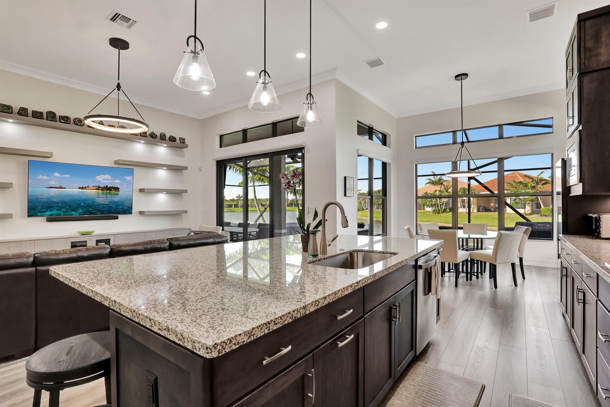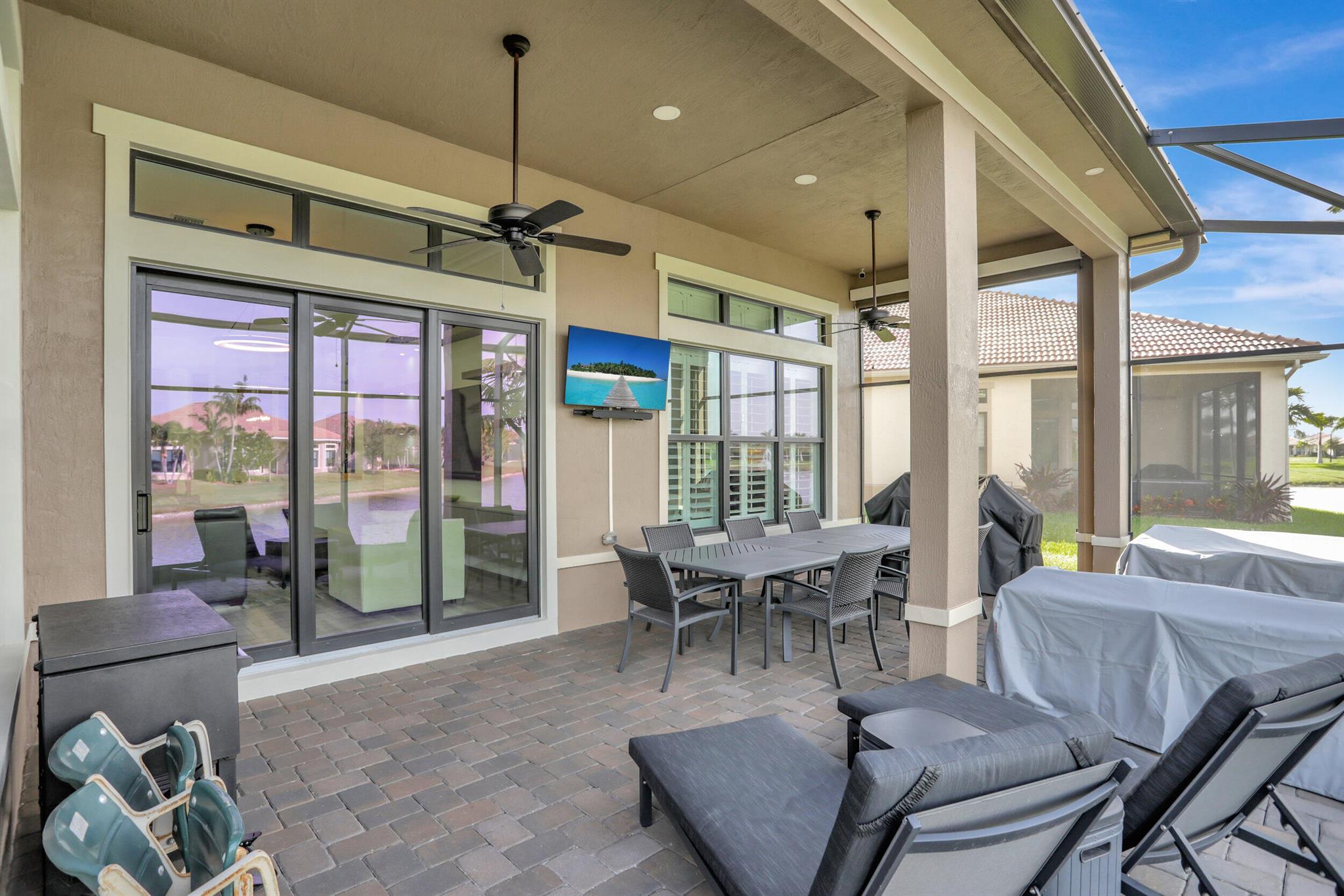 Fabulous Vera model situated on a cul-d-sac with long lake and fountain views, this 3 bedroom, 2 1/2 bath home has numerous upgrades, such as full house generator with natural gas, all hurricane glass windows, custom outdoor landscaping with spectacular lighting, incredible custom kitchen with large center island, up graded cabinets with soft closing drawers, tray dividers and double glass display cabinets with lighting. Stainless exhaust fan fully vented to the outdoors. New light fixtures and ceiling fans, and crown molding thru-out. The master bedroom has new flooring all custom closets. Plantation shutters as well as remote controlled shades. A wall of pocket sliding glass doors open to the patio for a huge, fabulous entertaining space. Screened in