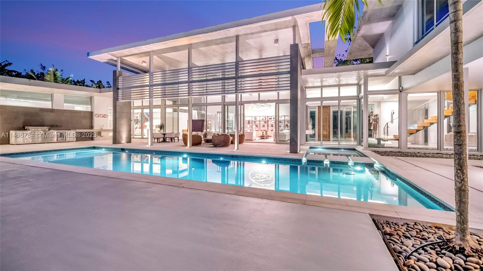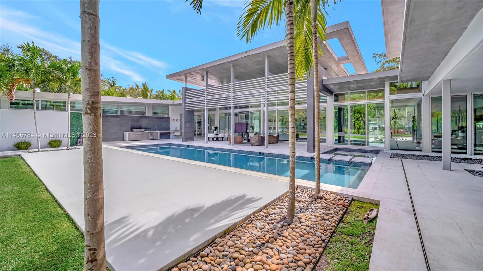 Smart, exceptional modern masterpiece with custom architecture and engineering by KZ Architecture. Sophisticated interior designed by designer owner. Experience the work of art upon entering this spectacular home boasting soaring high ceilings. Full glass framed views are combined with natural elements. Convenient first floor primary bedroom suite wing with spa bath & patio that extends to the heated pool and N/S tennis court. Home features poured in place cement roof with ceilings floating on beams, sculptural floating wood, glass staircase, kitchen & cabinetry, Wine cellar wall, Smart technology with Lutron Control & Sonos system. Double Expansive driveways and a 2 Car Garage in an extremely private 1.02 Acre corner lot.Offered turn key with custom made furnishings and artwork.