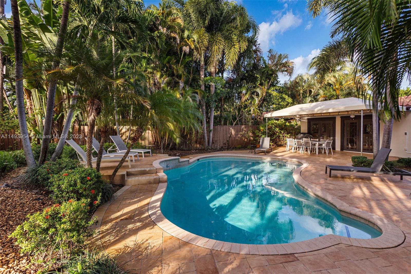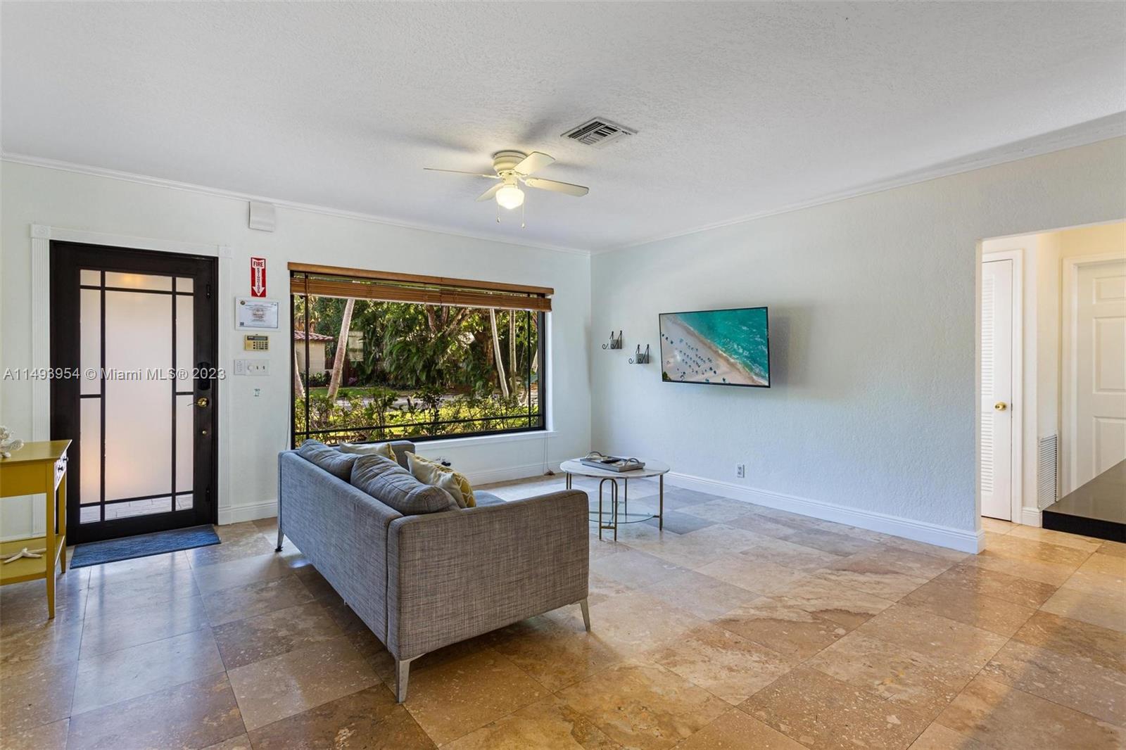 Discover a haven within a tropical paradise, on one of Poinsettia Heights' most beautiful streets. This home blends contemporary elegance with an enviable location in east Ft Lauderdale. Step into a modern kitchen with SS appliances and a generous bar that opens to the inviting living space. Throughout the home, the floors boast stunning travertine marble in rich Mediterranean hues, creating a warm ambiance. French doors beckon towards a Florida room, offering serene views of the expansive backyard adorned with lush landscaping that ensures complete privacy. The garden area is a delight, featuring a dazzling heated pool, a covered patio, and a shed equipped with electricity. Ideal for those who cherish tranquility at home and enjoy the beach and downtown, which are just a 5-min drive away.