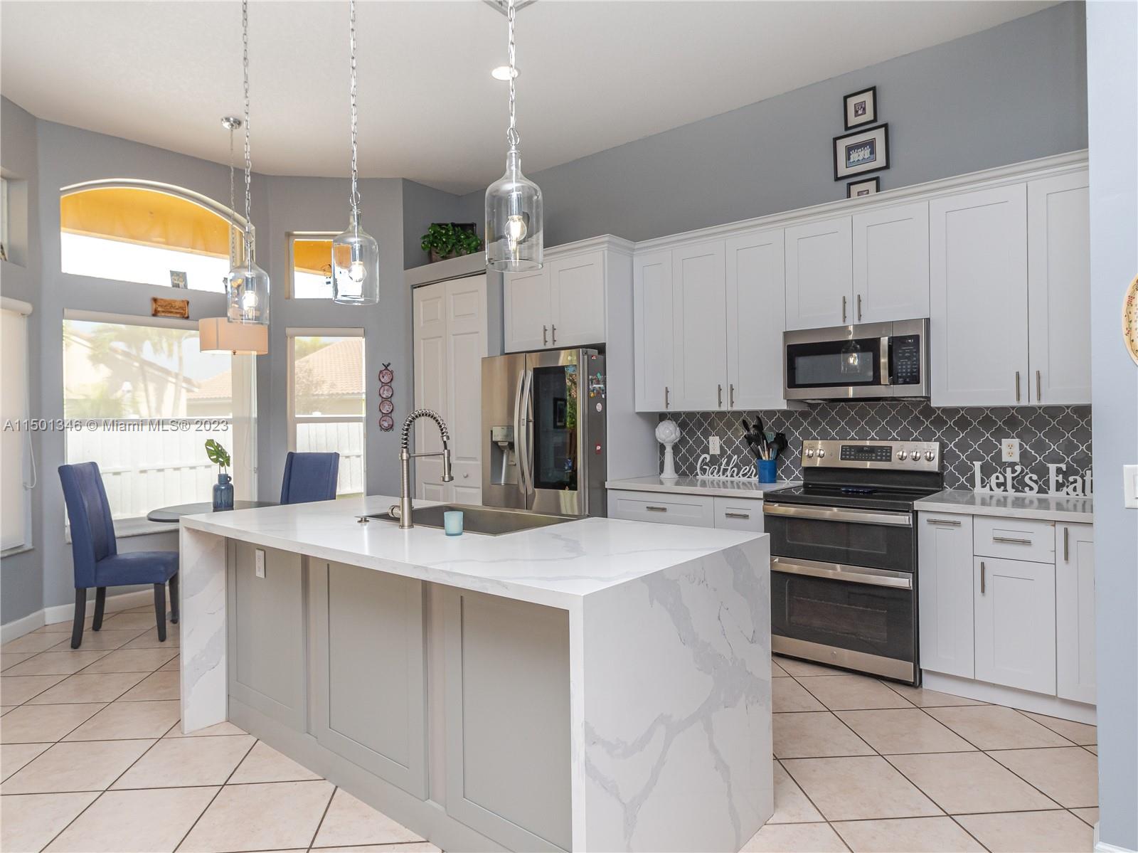 4 BDRM, 3 BATHS, THEATRE ROOM, 2 CAR GAR ONE STORY HOME W/ GREAT OPEN FLOOR PLAN. BUILT IN 2001. RECENTLY REMODELED KITCHEN W/WATERFALL QUARTZ ISLAND. APPLIANCES LESS THAN 2 YRS, BREAKFAST AREA, LG FAM RM, WORK STATION AREA, 11' CEILINGS, TILE FLOORS THROUGHOUT, OVERSIZE MASTER BEDROOM W/ADDTL SITTING AREA & LG WALK IN CLOSET. PREVIOUSLY REMODELED BATHS, A/C (2021), IMPACT DOUBLE ENTRY GLASS DOORS,FARMHOUSE SINK IN LAUNDRY ROOM W/FRONT LOAD WASHER & DRYER. ACCORDIAN SHUTTERS, 65X13 CEMENT PATIO AREA PERFECT FOR ENTERTAINING, CIRCULAR DRIVEWAY, GUARD GATED COMMUNITY W/GYM, TENNIS CTS, VOLLEYBALL,BASKETBALL, PLAYGROUND, OLYMPIC SIZE POOL, KIDS POOL & MORE.