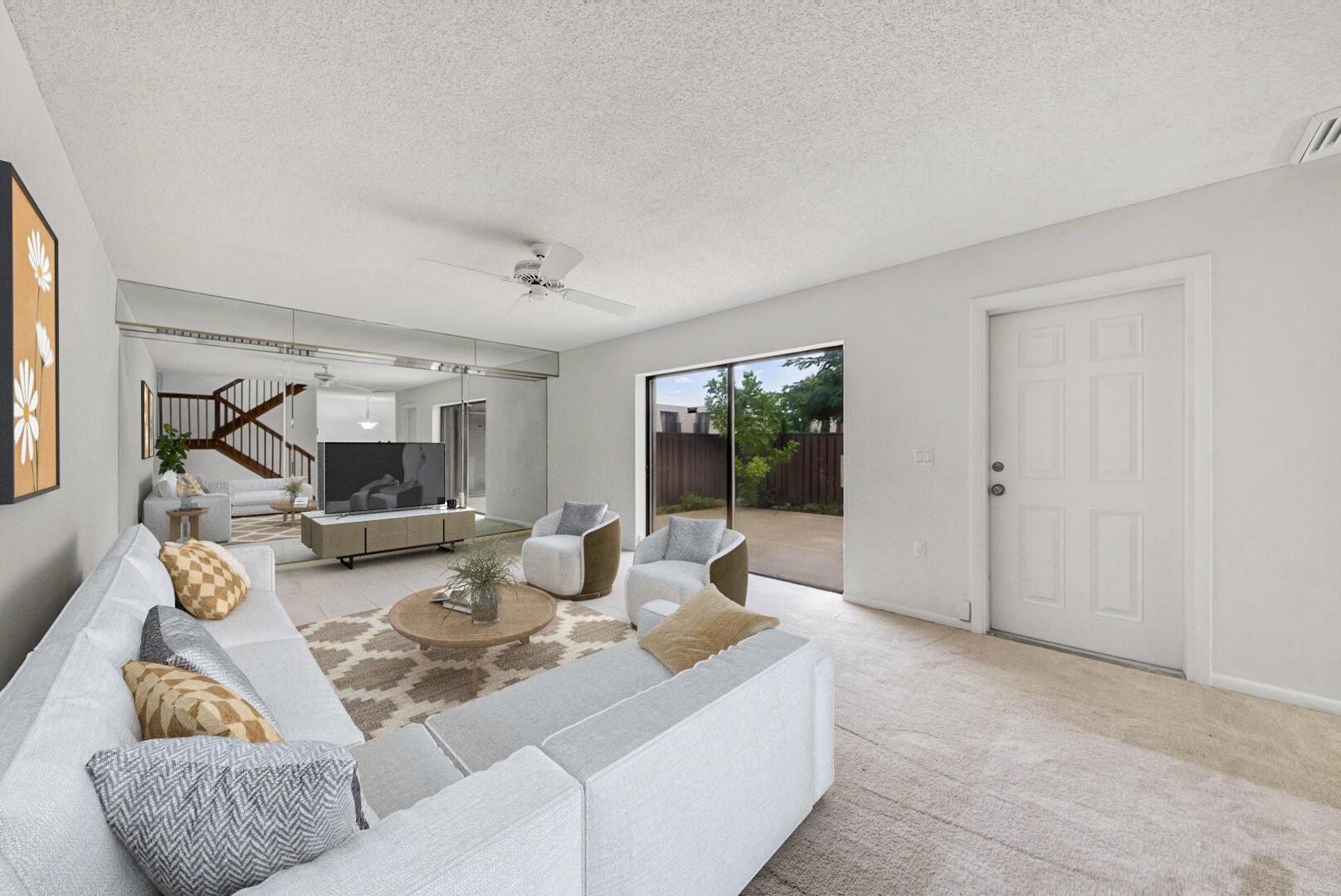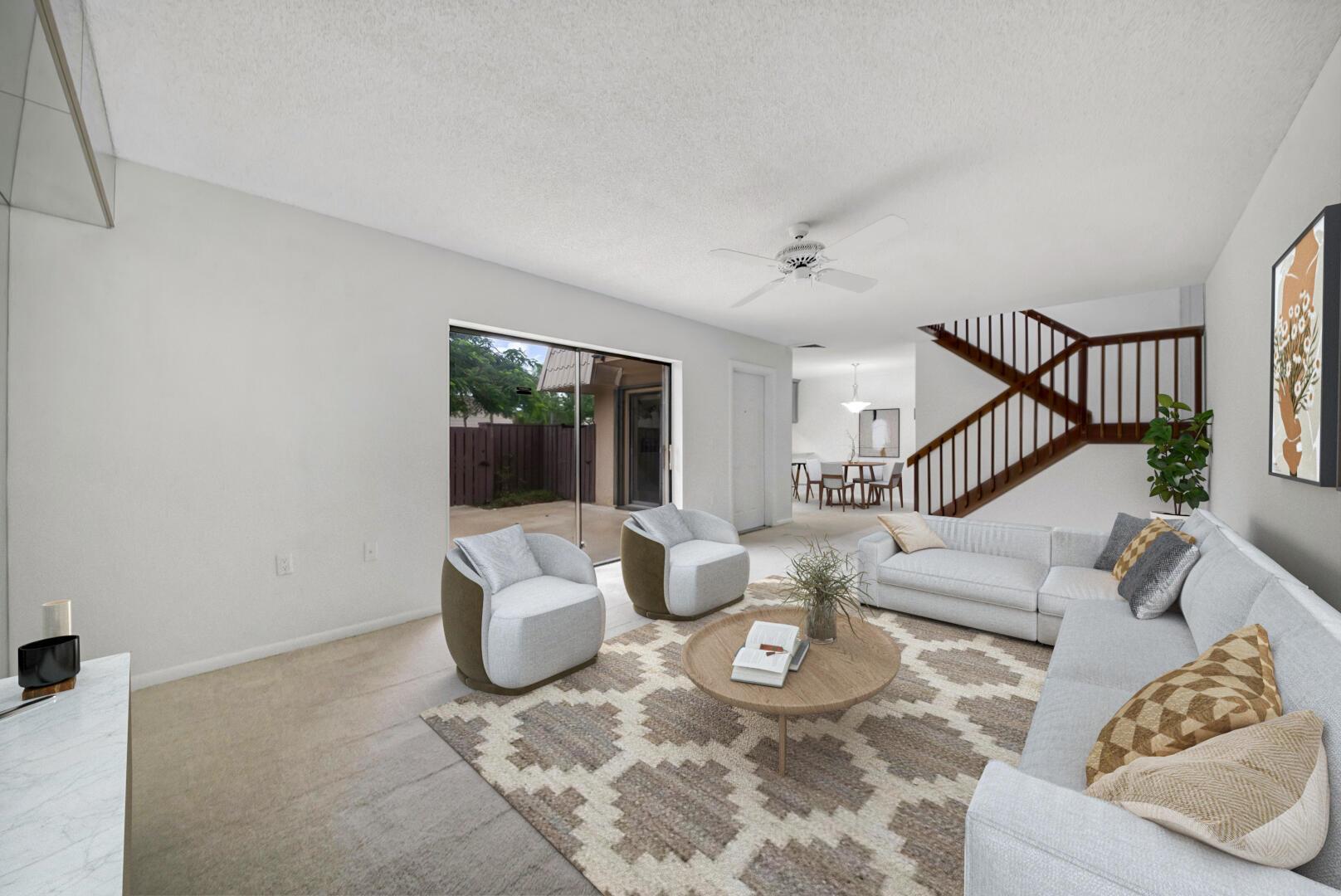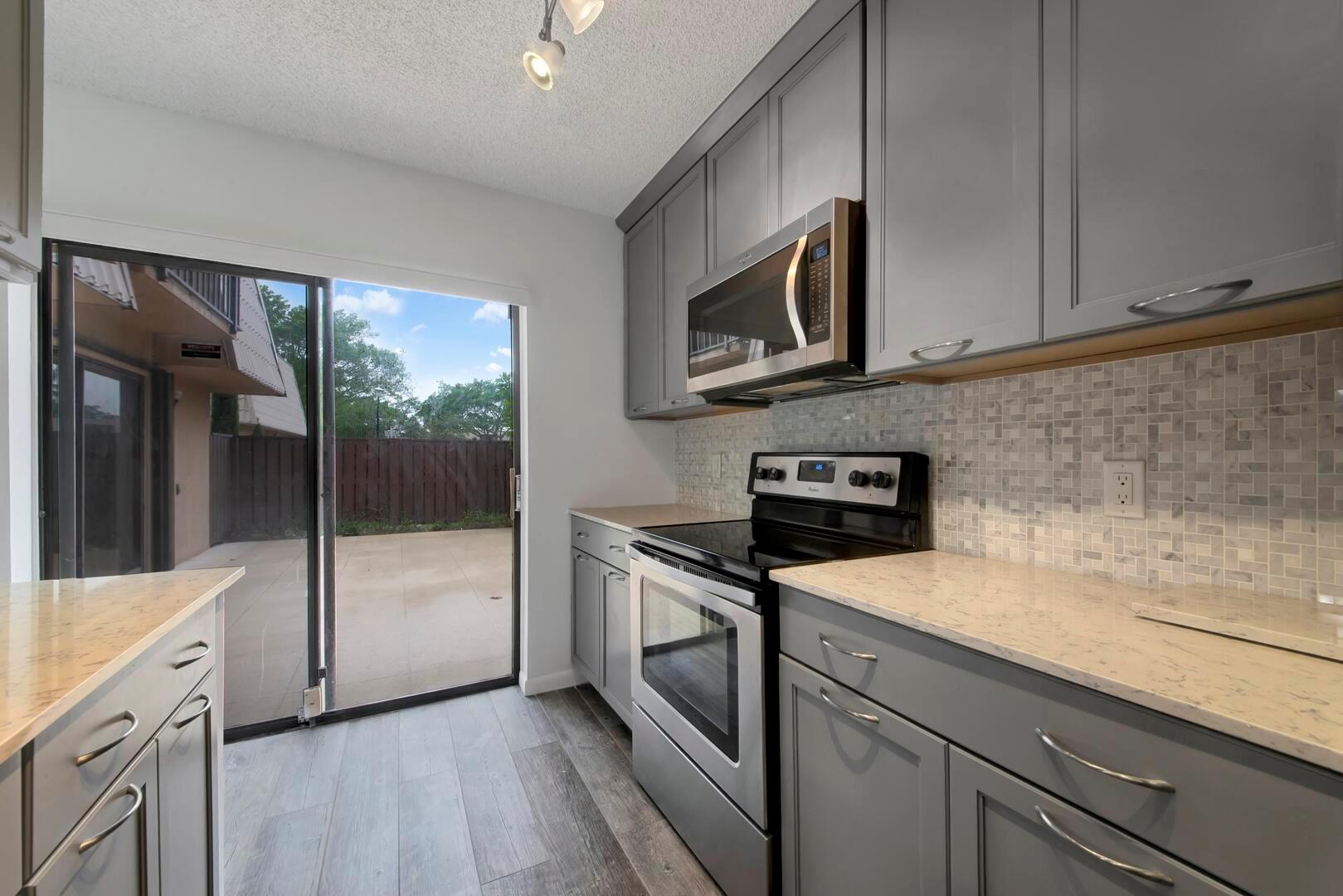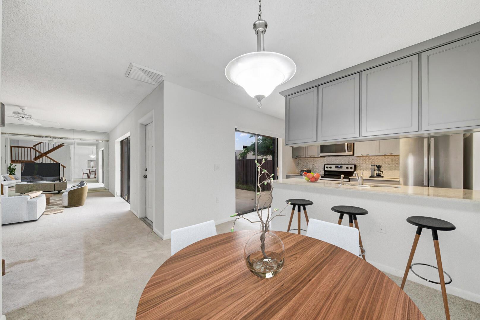 Welcome to your dream home in the sought-after Village of Sandalwood Lakes! This exquisite 2-bedroom, 2.5-bathroom townhome boasts a perfect blend of modern luxury and comfort. Step inside to discover a pristine interior featuring new neutral carpeting and freshly painted walls throughout, creating an inviting and refreshing atmosphere. The spacious living room is bathed in natural light, thanks to sliders that open up to a private fenced enclosed patio, providing an ideal space for relaxation or entertaining guests. The heart of the home, the dream kitchen, is a culinary enthusiast's delight. Elegant grey cabinets, a stylish tiled backsplash, and top-of-the-line stainless steel appliances create a contemporary and functional space that inspires creativity in cooking and entertaining.