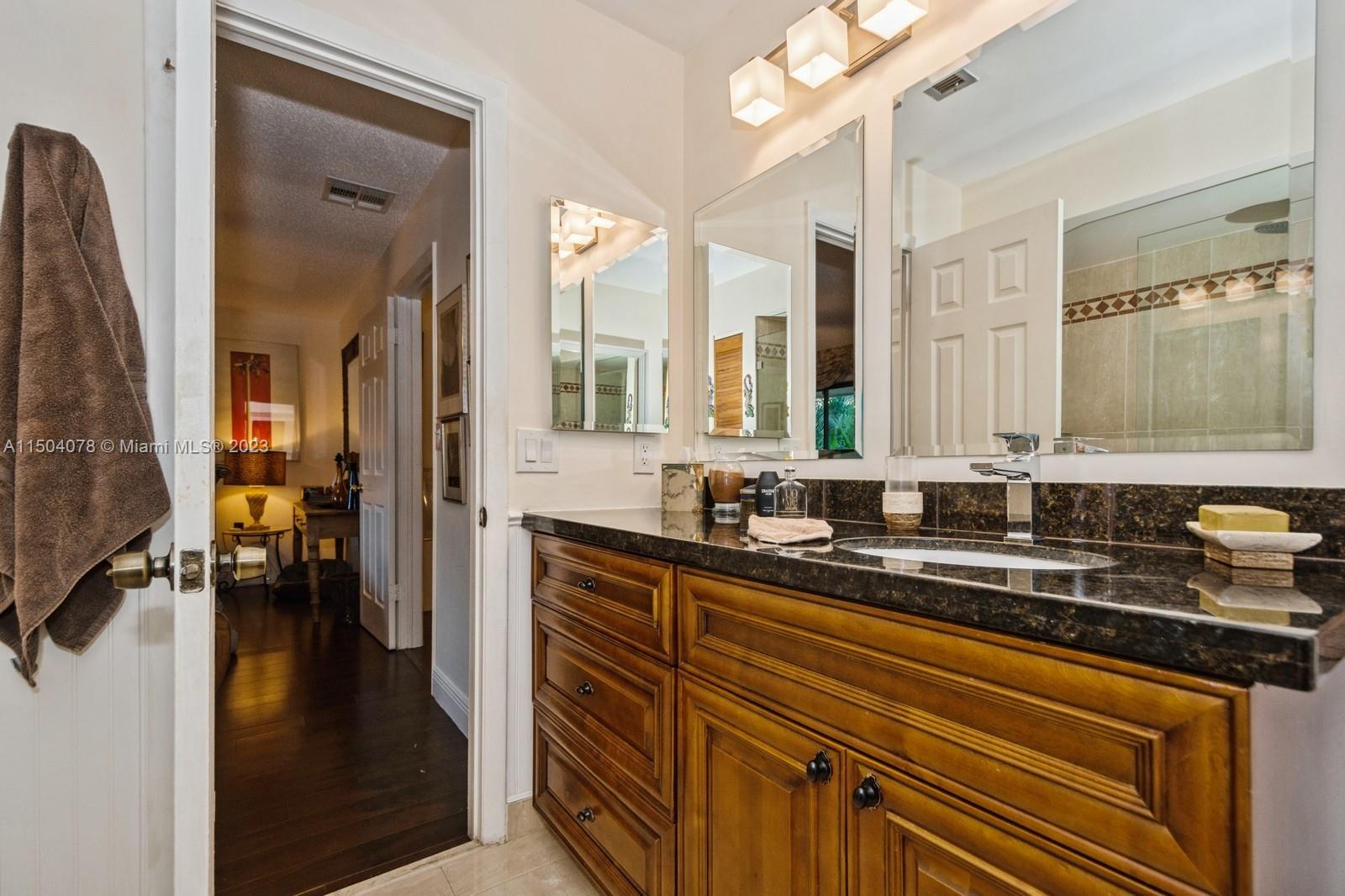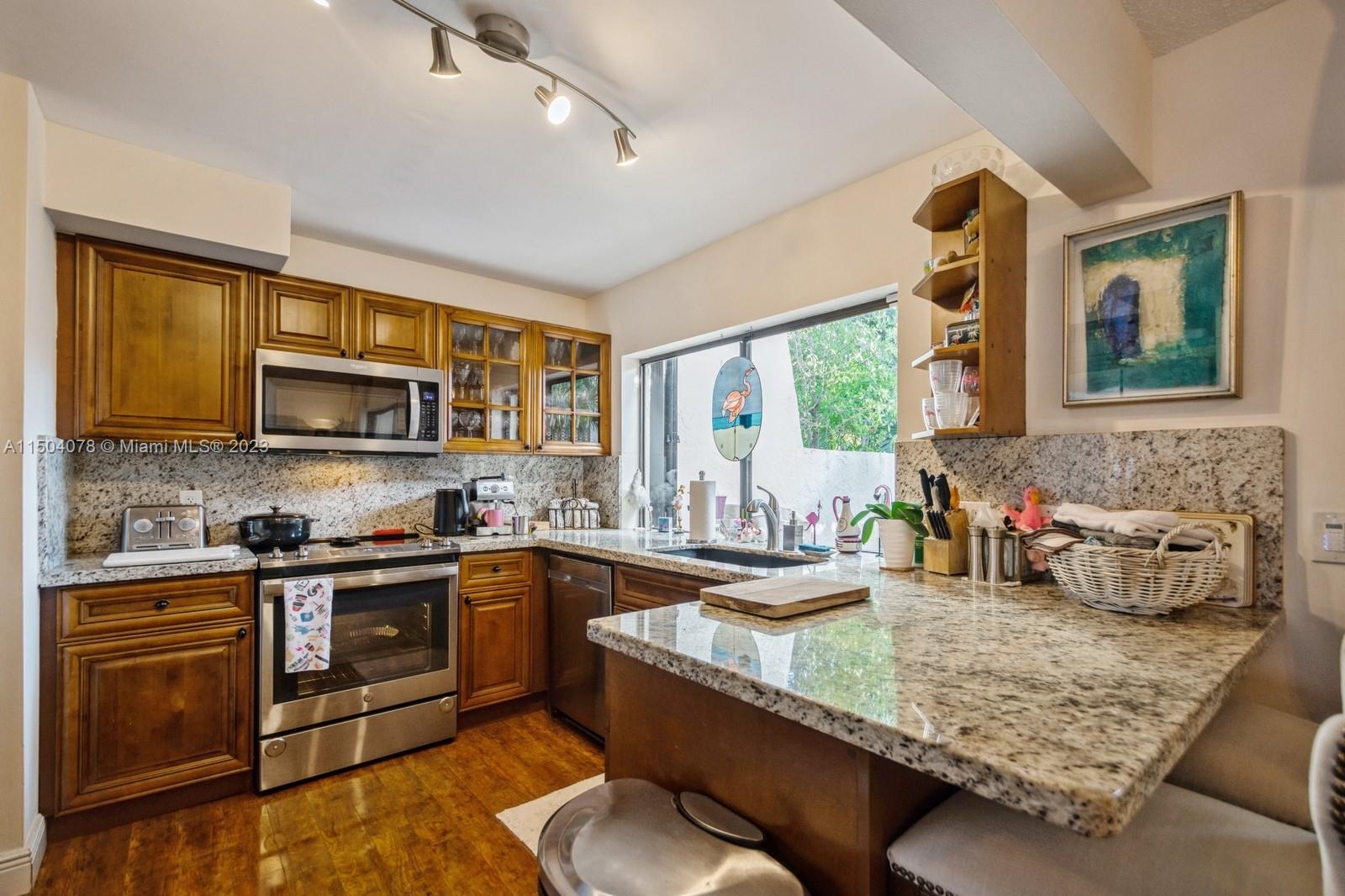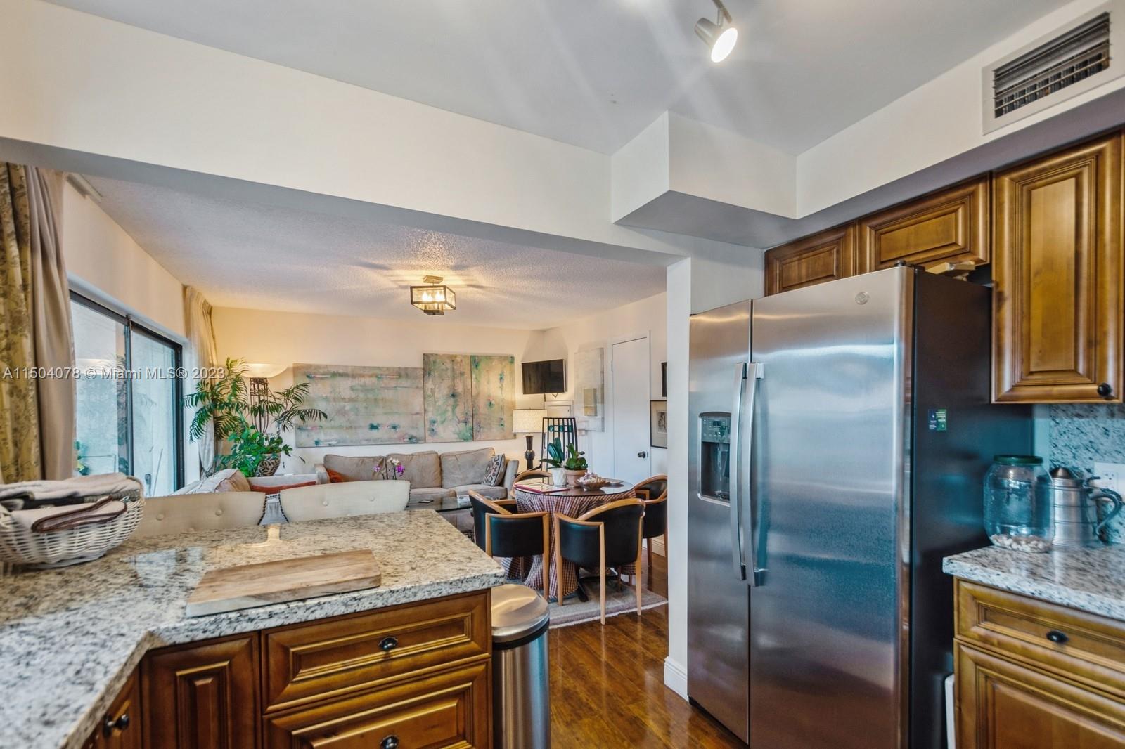 Gracious 3/2.5 townhouse located on a small court of (9) units in The Family Townhouses of the Lakes of Emerald Hills. Downstairs has an entry foyer, spacious living/dining room, open family room/kitchen updated with granite counter tops and stainless appliances, renovated powder room, large front patio/garden, and a large back patio leading to a treed green-space. Second floor has a large primary bedroom with updated ensuite (granite/glass, & linen closet), large walk-in closet, and open balcony, a central foyer with large closet, two amply sized guest bedrooms with large closets, and a renovated full bathroom. No carpet, tile and laminate on all floors. There are two deeded parking spots directly in front of the unit and ample guest parking.