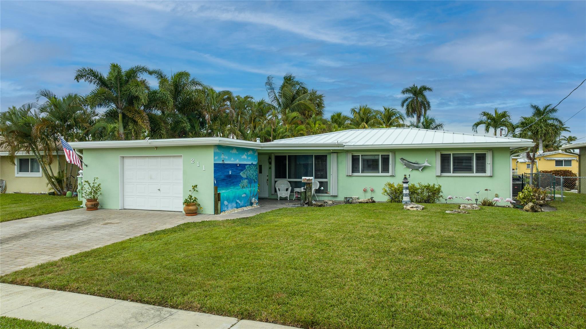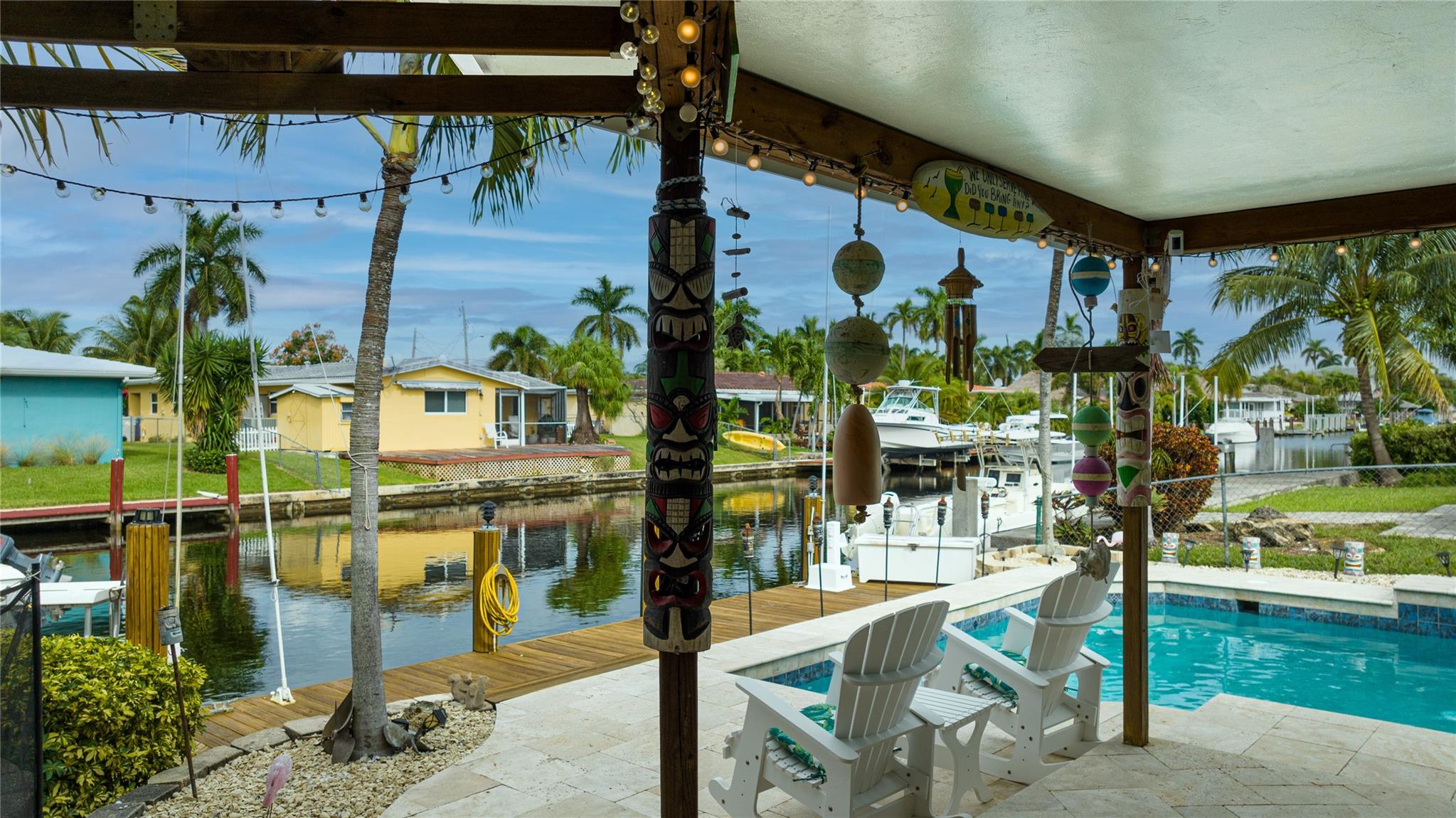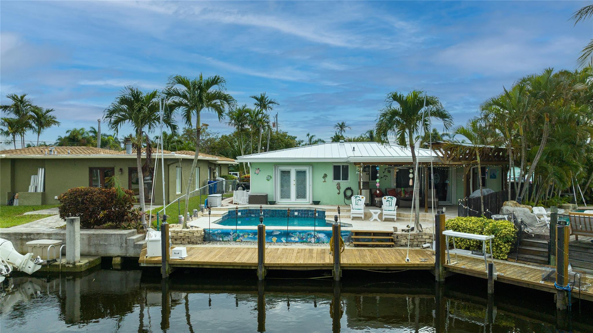 Ocean Access 3bed/2bath/pool on secluded cul de sac. Brand new metal roof, gutters, and 2 ton A/C. Hurricane Accordian Shutters/panels. Enclosed carport with garage door for golf carts, motorcycles, storage and house access. 35' Dock has pilings/bumpers, whips, lighting, electrical and dock box, fits approx 26'boat. 12' bridge clearance MHW. Updated Master bedroom with etched doors to patio, and bath with oversized shower. Updated custom kitchen solid oak cabinets, with SS appliances, double oven, dishwasher, 48" 6 burner gas cook top with exhaust hood and granite counters. Spacious laundry room with 2nd refrigerator. 2 spare bedrooms have carpet, balance tile flooring. Large sliding doors to travertine tile covered and fenced patio to pool with waterfall,AquaCal heater/chiller.