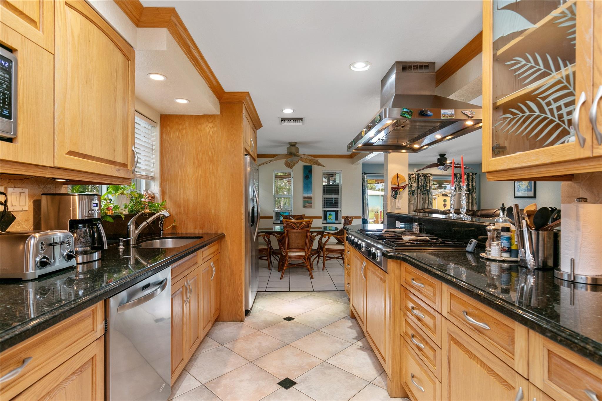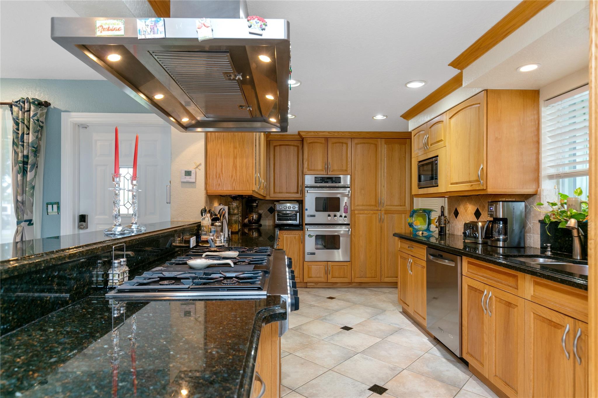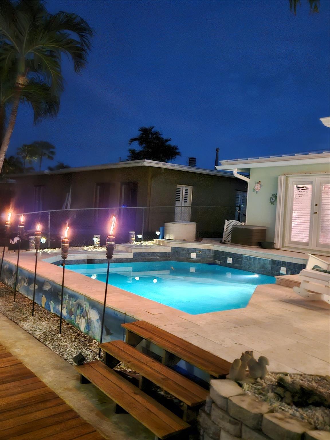 Ocean Access 3bed/2bath/pool on secluded cul de sac. Brand new metal roof, gutters, and 2 ton A/C. Hurricane Accordian Shutters/panels. Enclosed carport with garage door for golf carts, motorcycles, storage and house access. 35' Dock has pilings/bumpers, whips, lighting, electrical and dock box, fits approx 26'boat. 12' bridge clearance MHW. Updated Master bedroom with etched doors to patio, and bath with oversized shower. Updated custom kitchen solid oak cabinets, with SS appliances, double oven, dishwasher, 48" 6 burner gas cook top with exhaust hood and granite counters. Spacious laundry room with 2nd refrigerator. 2 spare bedrooms have carpet, balance tile flooring. Large sliding doors to travertine tile covered and fenced patio to pool with waterfall,AquaCal heater/chiller.