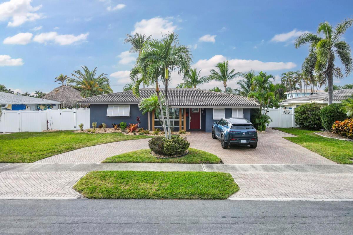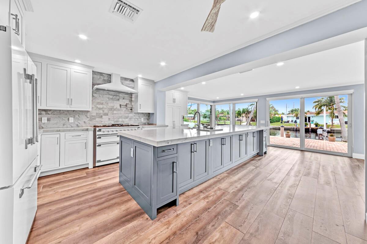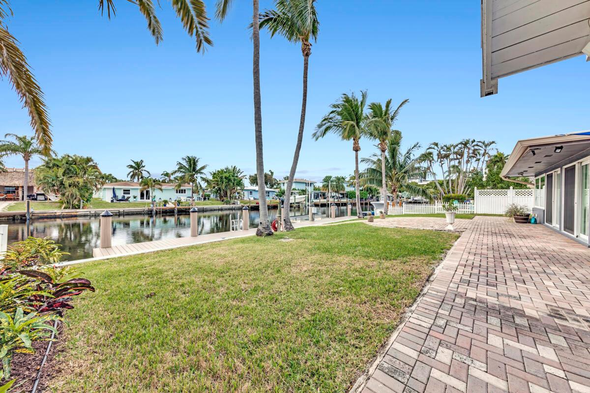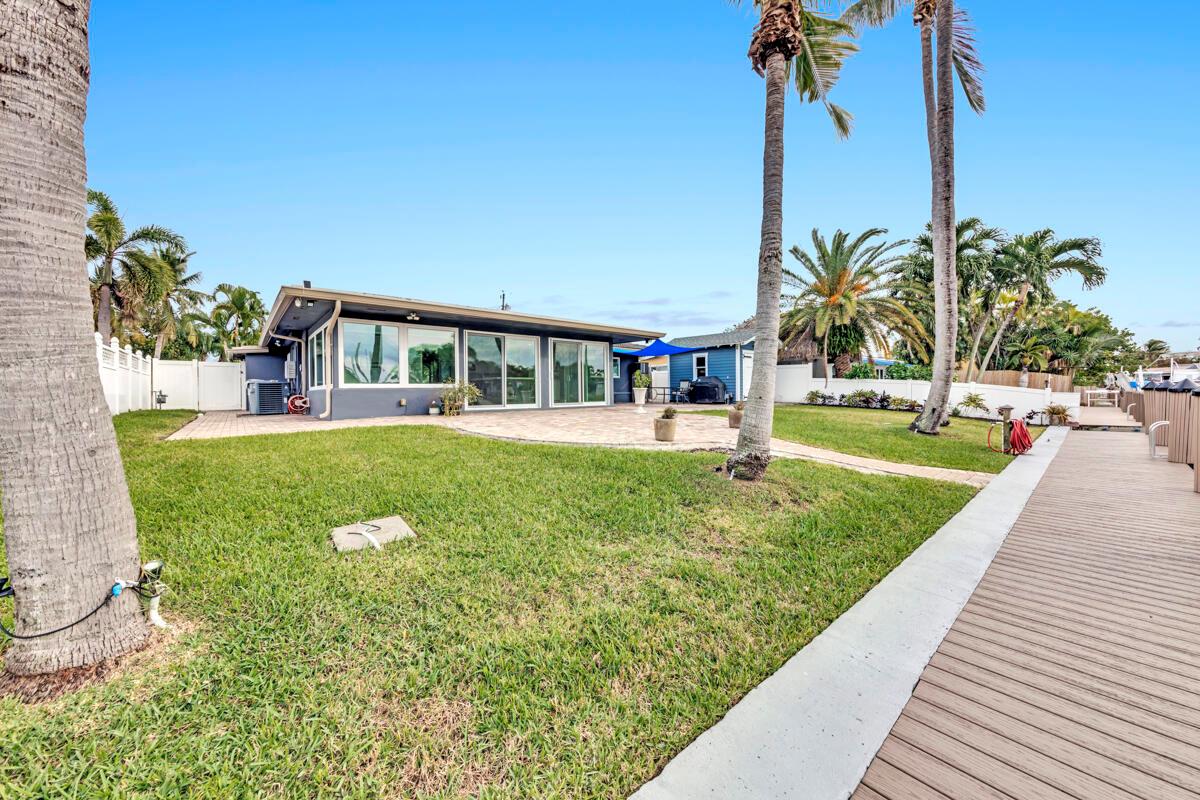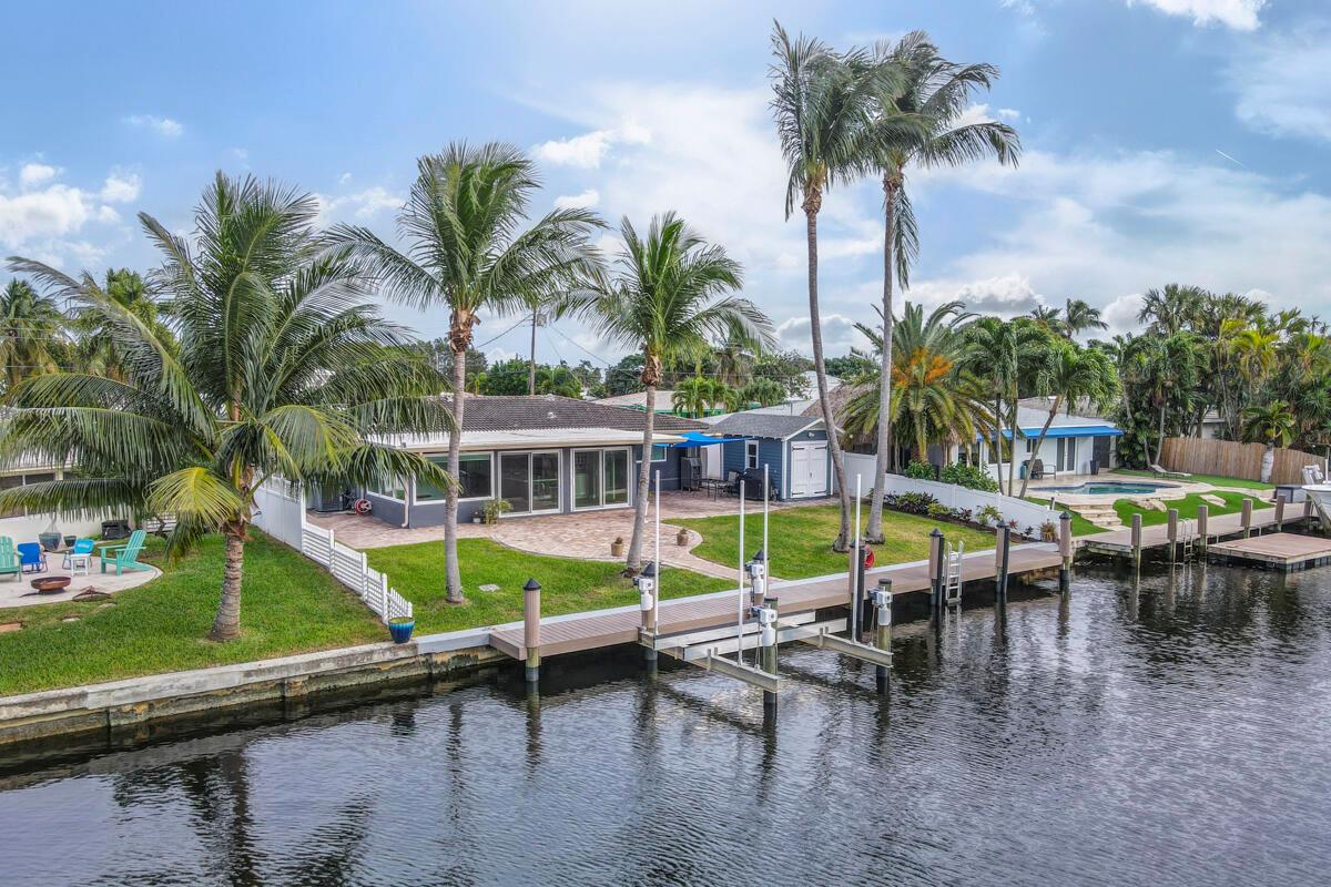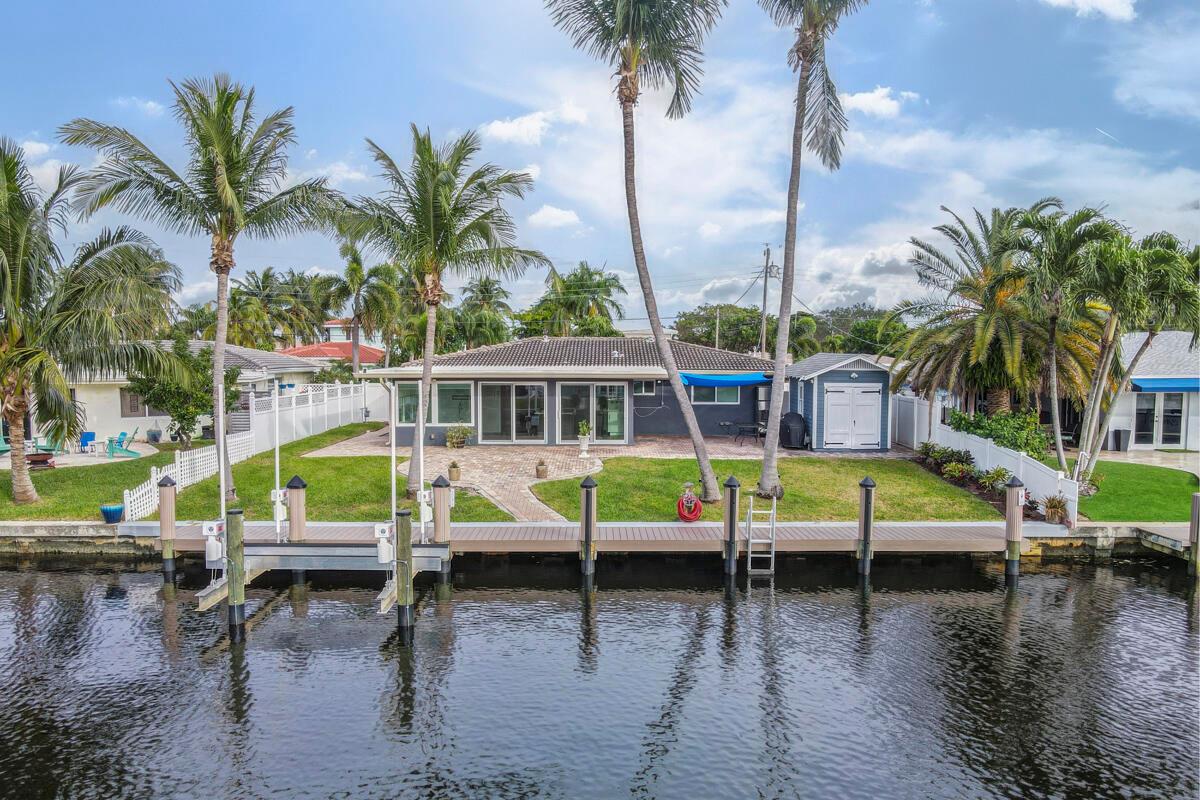 Waterfront Gem! 3 bedroom, 2 bath, waterfront Ranch just minutes to the Atlantic Ocean. Home boasts designer upgrades with Aga refrigerator and 5-burner gas stove w/ matching hood and pull-out pot filler, 2 Viking dishwashers, Kohler farmhouse porcelain sink, stone backsplash, white granite counter-top on island seats 8 people. Pull-out lower drawers, separate bar with pantry and glass-front cabinets. Impact windows throughout, custom blinds, plantation shutters and a 24 bottle wine holder. New 70' Weatherboard dock and upgraded seawall 2022/2023. New 16,500lb four post lift and Florida Historic Shed w/ electric. Plenty of storage w/ paver tiles on both sides of the home. bead board, ample high-hats, high-end ceiling fans, on-demand gas hot water heater.