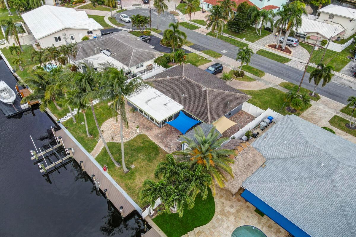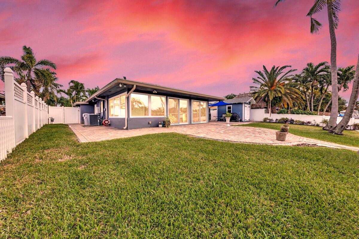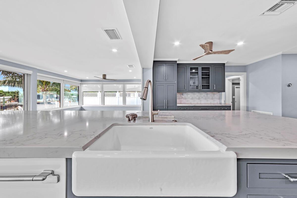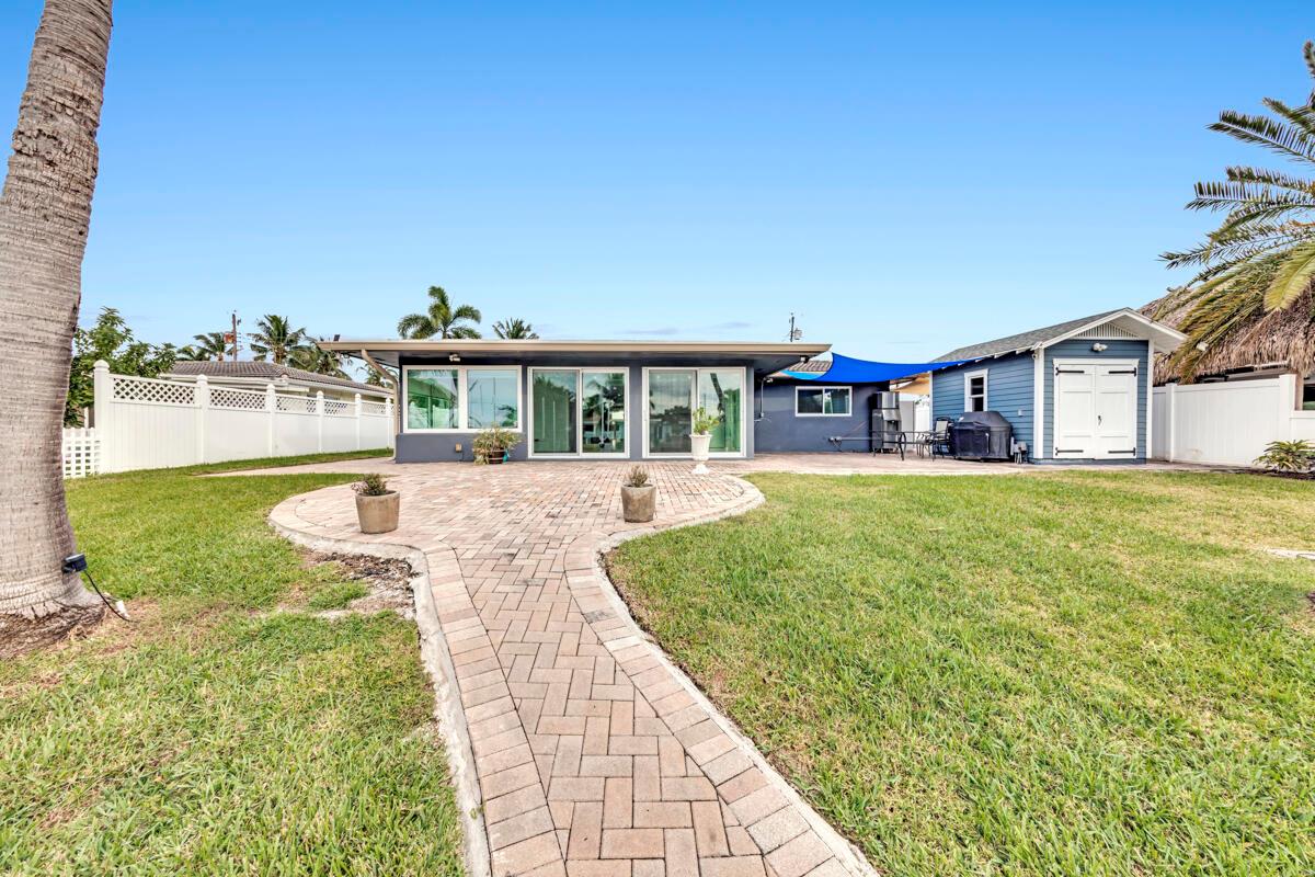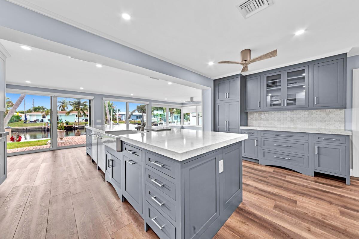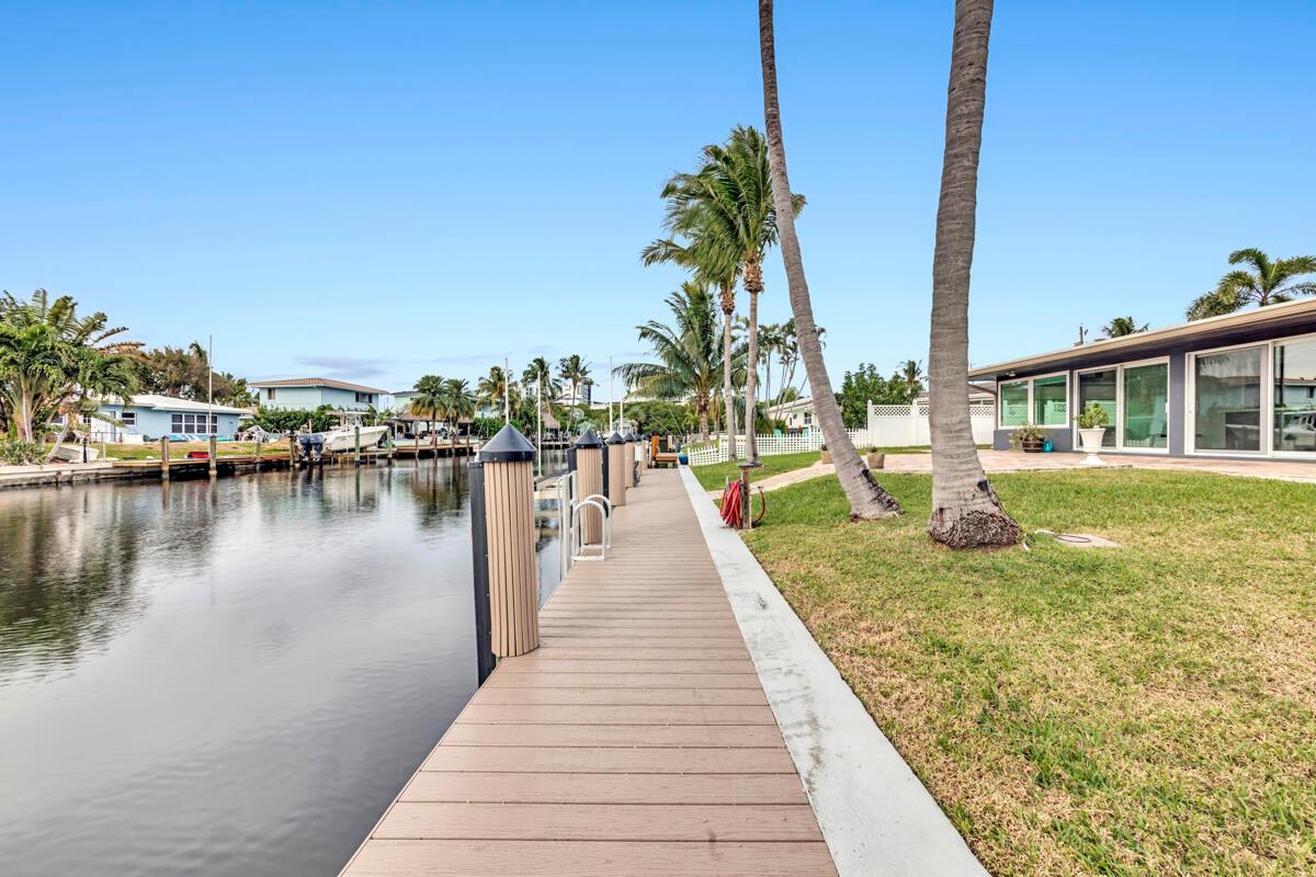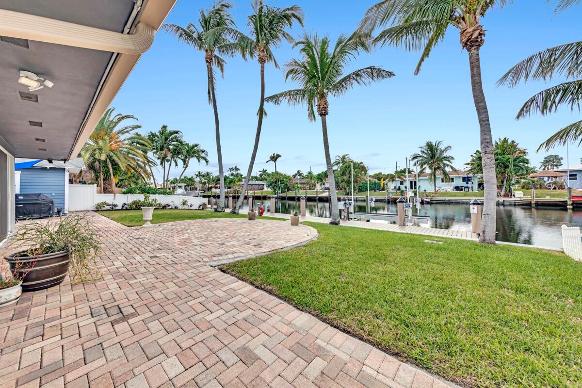 Waterfront Gem! 3 bedroom, 2 bath, waterfront Ranch just minutes to the Atlantic Ocean. Home boasts designer upgrades with Aga refrigerator and 5-burner gas stove w/ matching hood and pull-out pot filler, 2 Viking dishwashers, Kohler farmhouse porcelain sink, stone backsplash, white granite counter-top on island seats 8 people. Pull-out lower drawers, separate bar with pantry and glass-front cabinets. Impact windows throughout, custom blinds, plantation shutters and a 24 bottle wine holder. New 70' Weatherboard dock and upgraded seawall 2022/2023. New 16,500lb four post lift and Florida Historic Shed w/ electric. Plenty of storage w/ paver tiles on both sides of the home. bead board, ample high-hats, high-end ceiling fans, on-demand gas hot water heater.